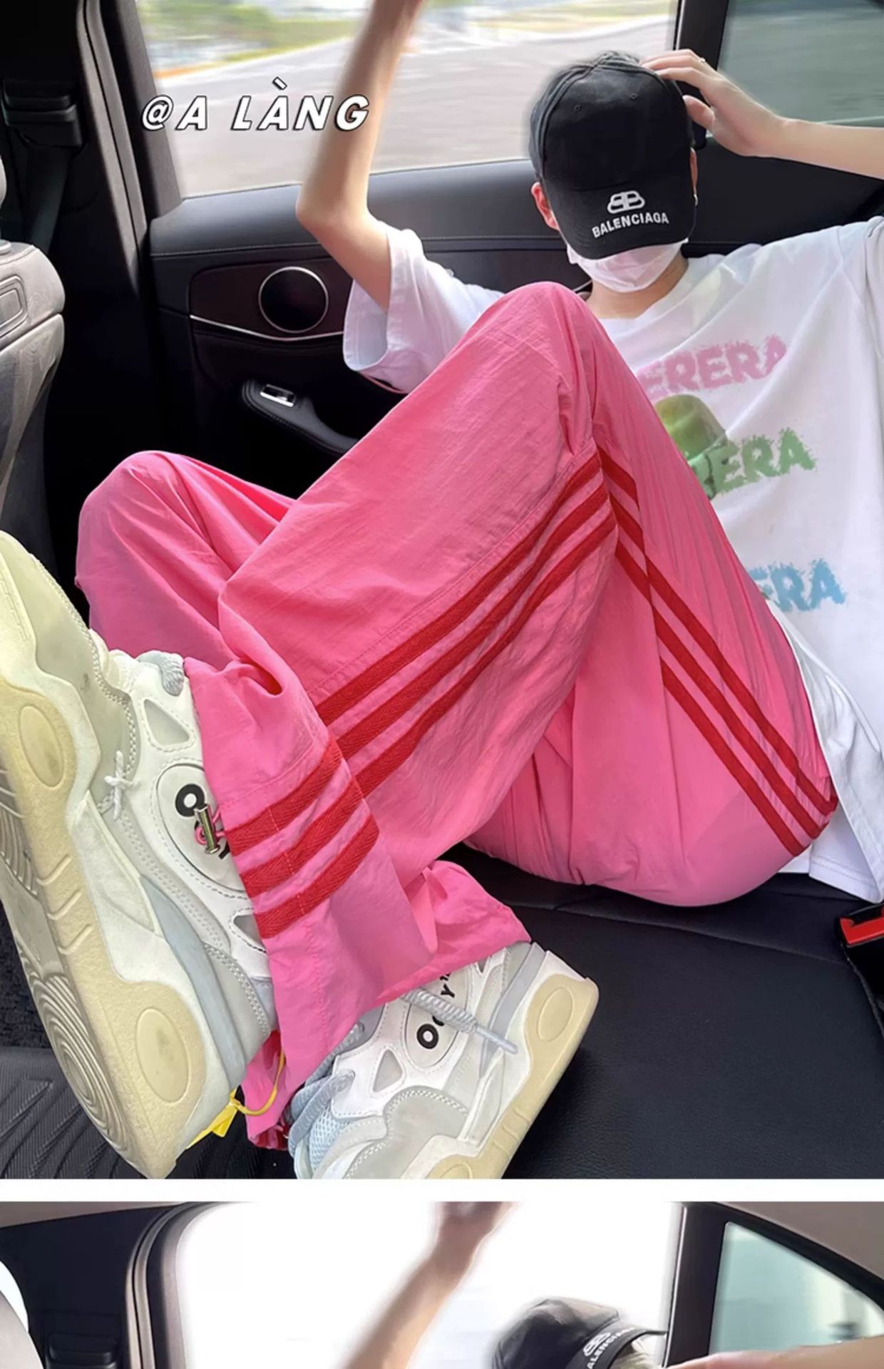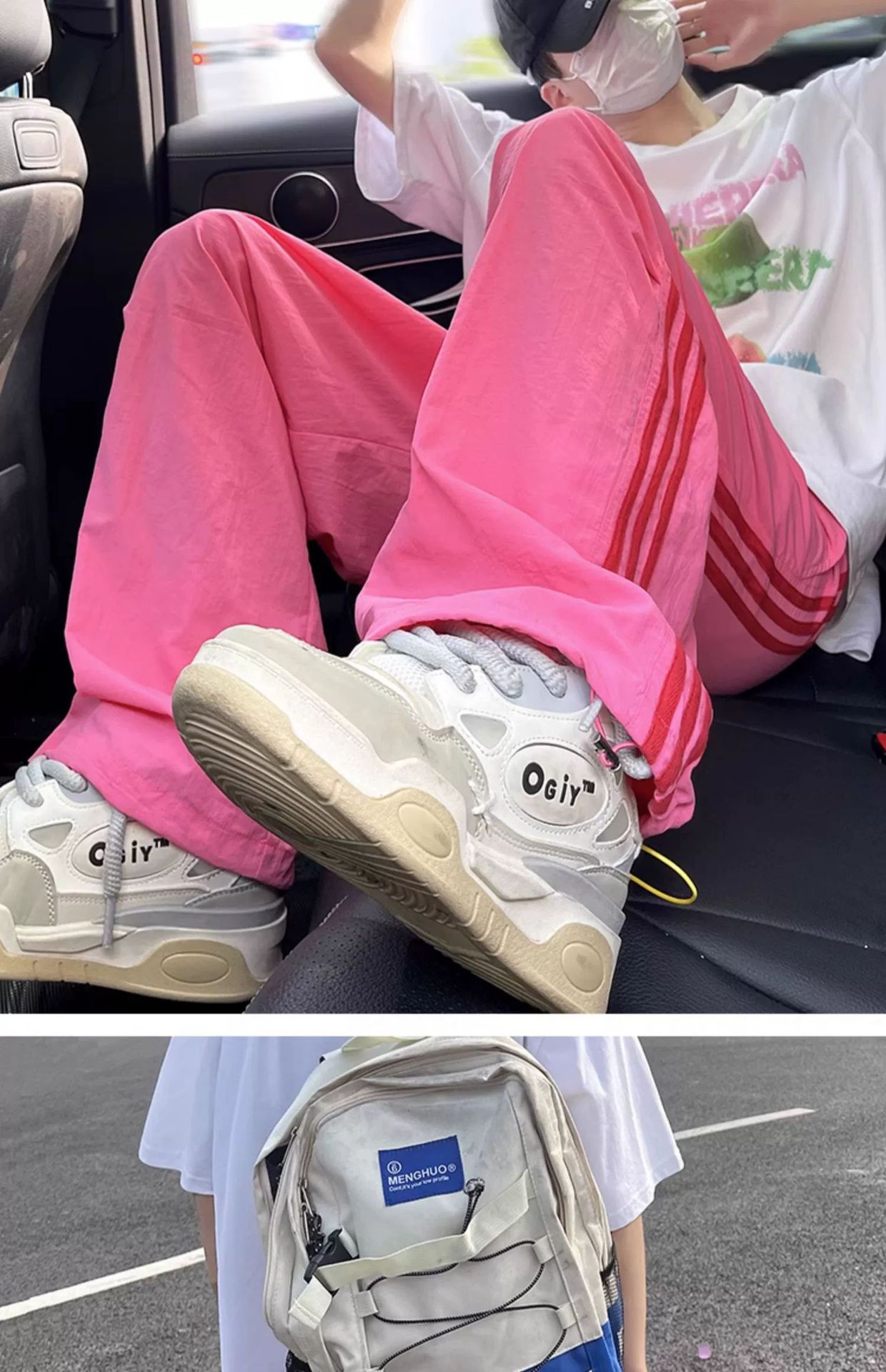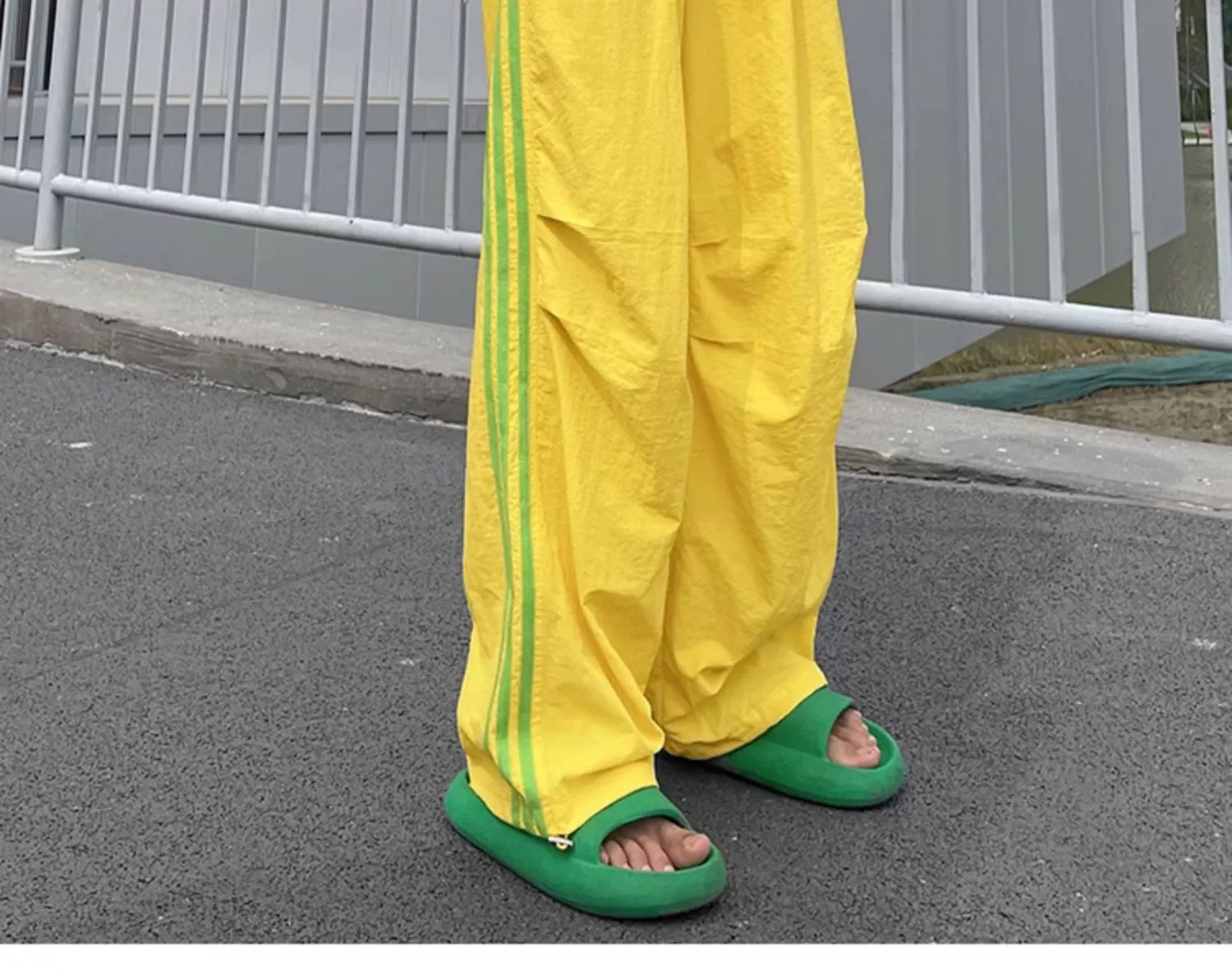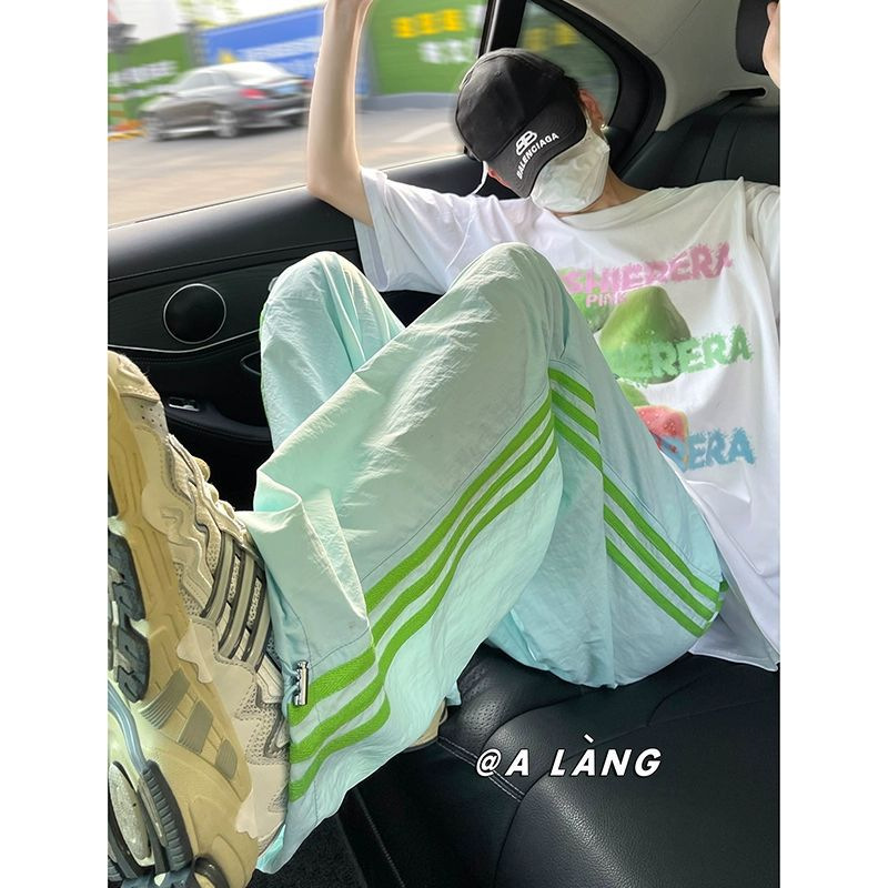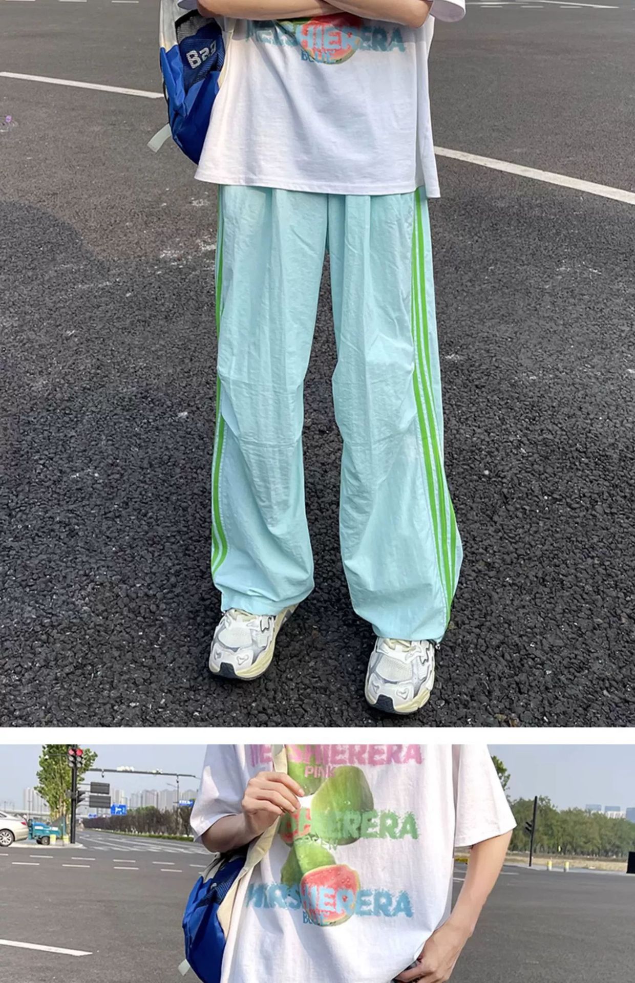 도파민 컬러 착용 낙하산 바지 남성 여름 얇은 아이스 실크 바지 미국식 사이드 스트라이프 빠른 건조 바지