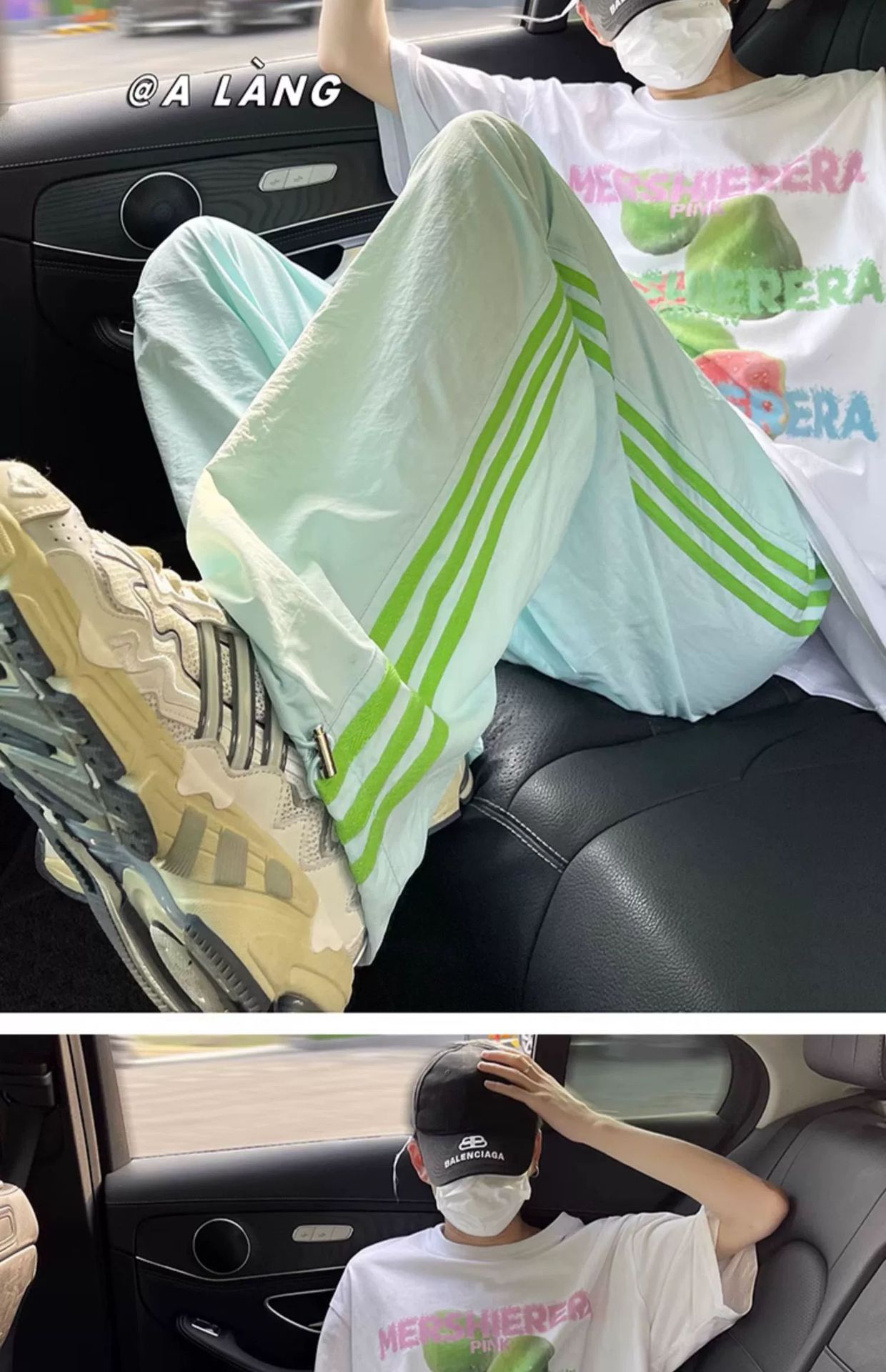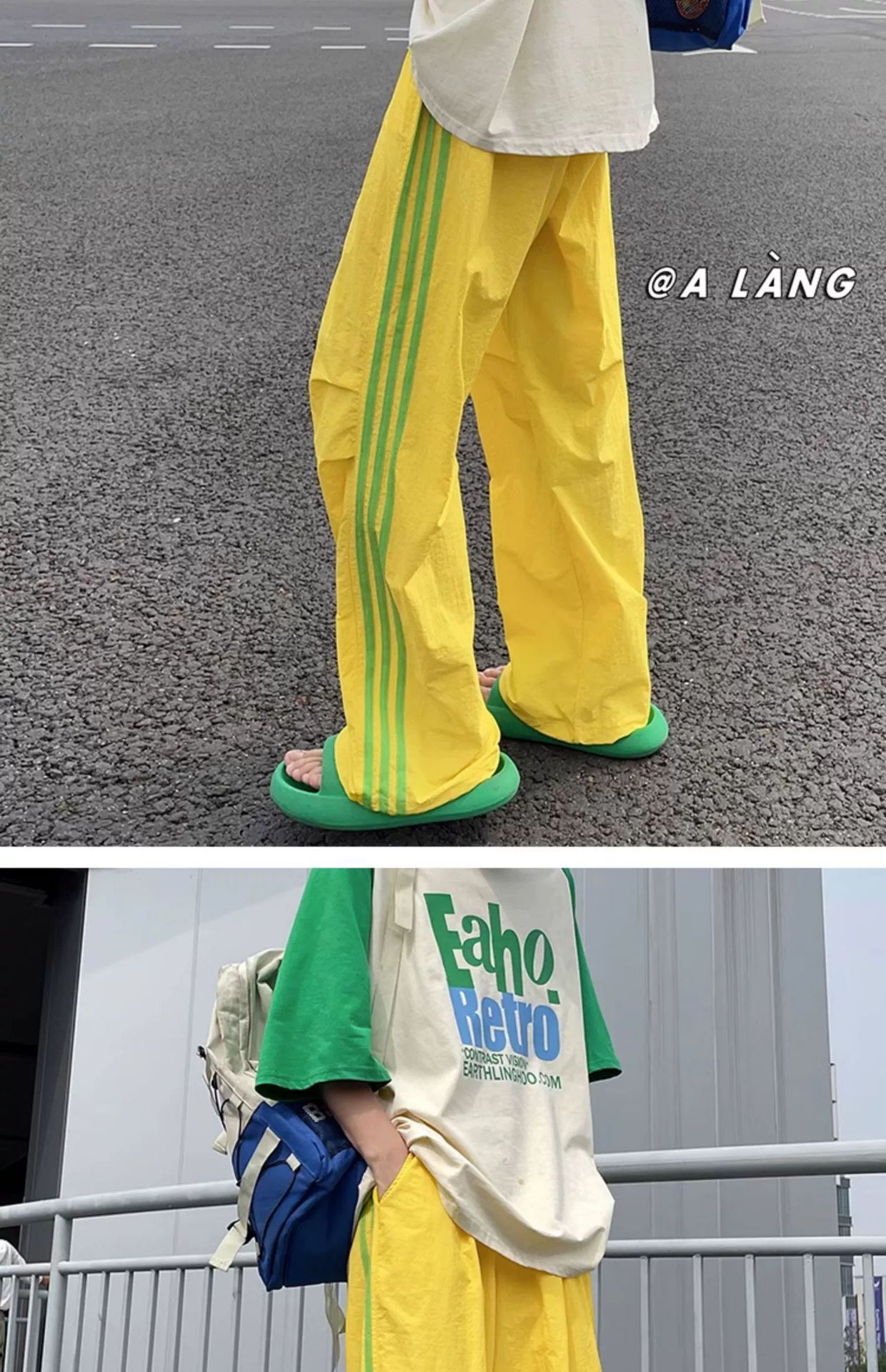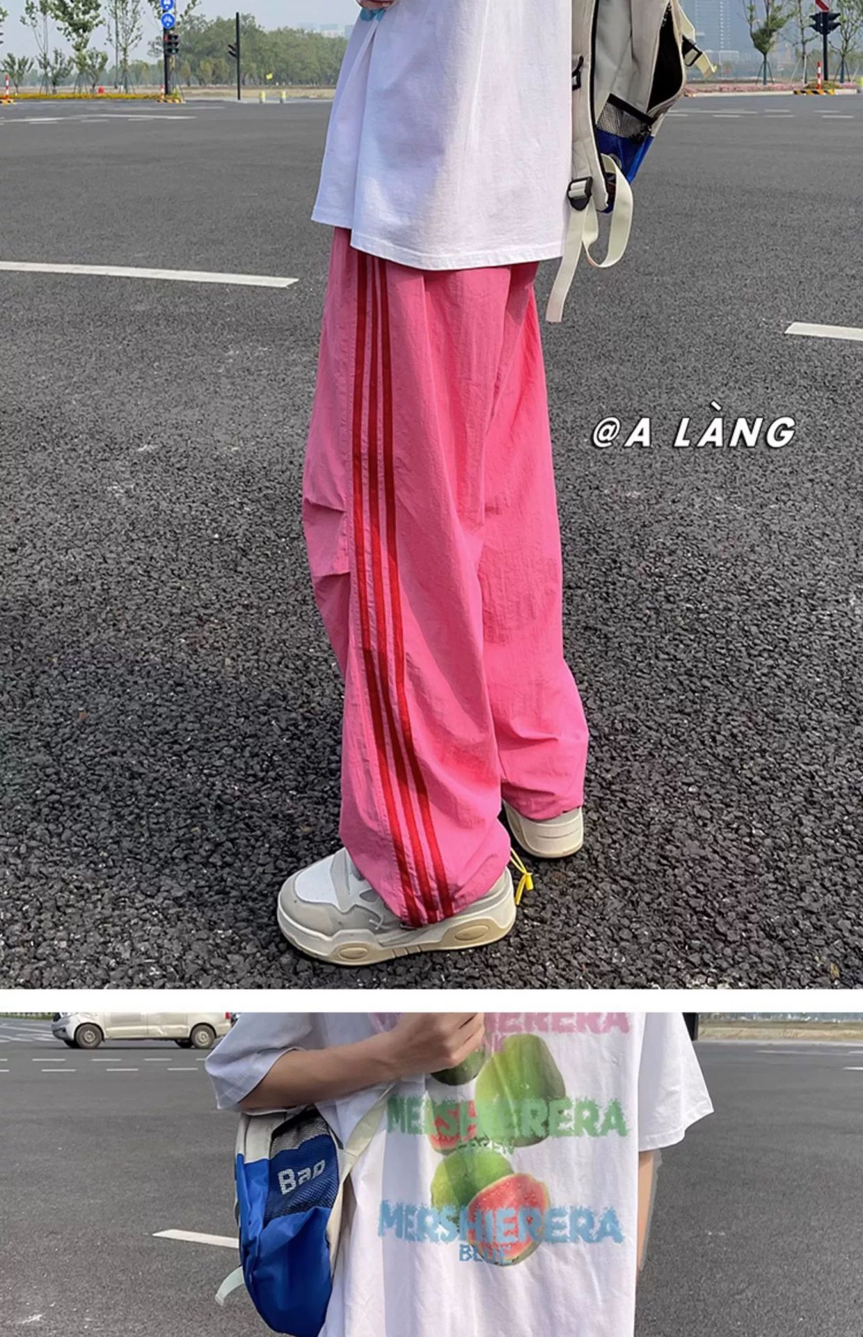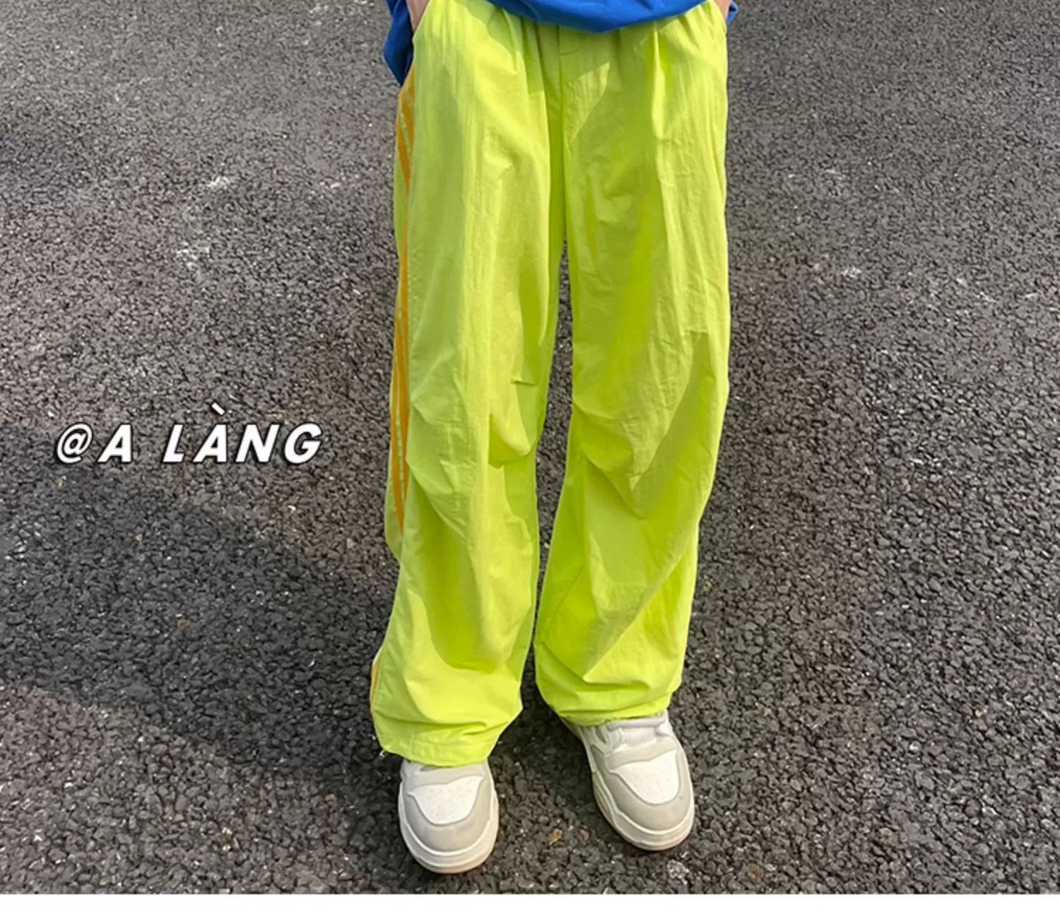 도파민 컬러 착용 낙하산 바지 남성 여름 얇은 아이스 실크 바지 미국식 사이드 스트라이프 빠른 건조 바지
