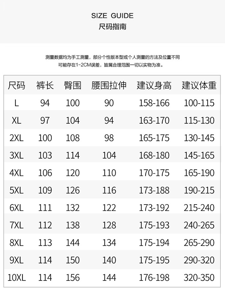 | 颜色 | 黑色直筒【夏款】, 绿色直筒【夏款】, 咖色直筒【夏款】, 黑色束脚【夏款】, 绿色束脚【夏款】, 咖色束脚【夏款】, 黑色直角【春秋款】, 绿色直角【春秋款】, 咖色直角【春秋款】, 黑色束脚【春秋款】, 绿色束脚【春秋款】, 黑色直角【加绒加厚】, 绿色直角【加绒加厚】, 咖色直角【加绒加厚】, 黑色束脚【加绒加厚】, 绿色束脚【加绒加厚】, 咖色束脚【加绒加厚】, 咖色束脚【春秋款】 | 尺码 | L【100-115斤】, XL【115-130斤】, XXL【130-145斤】, XXXL【145-165斤】, 4XL【165-190斤】, 5XL【190-215斤】, 6XL【215-240斤】, 7XL【240-265斤】, 8XL【265-290斤】, 9XL【290-320斤】, 10XL【320-350斤】 |
