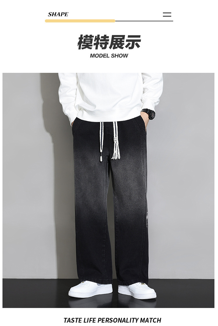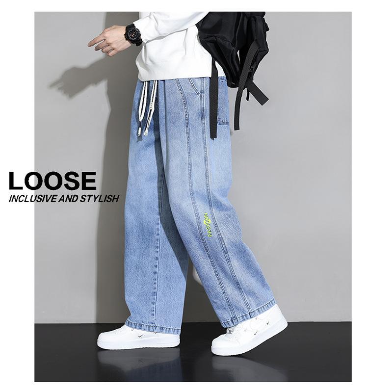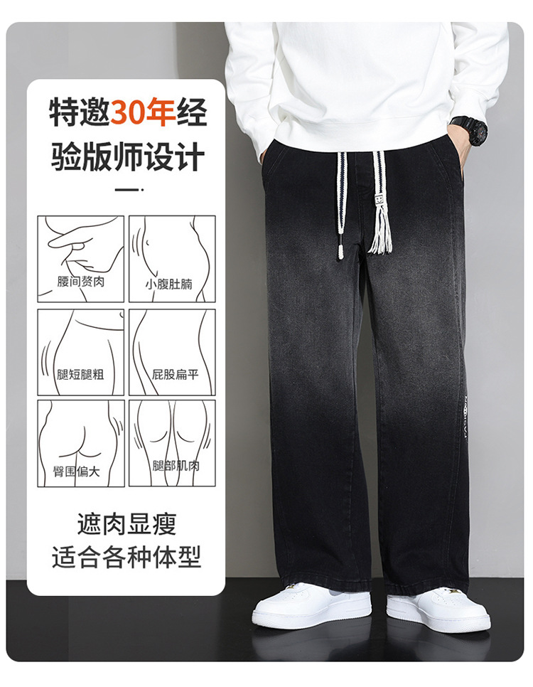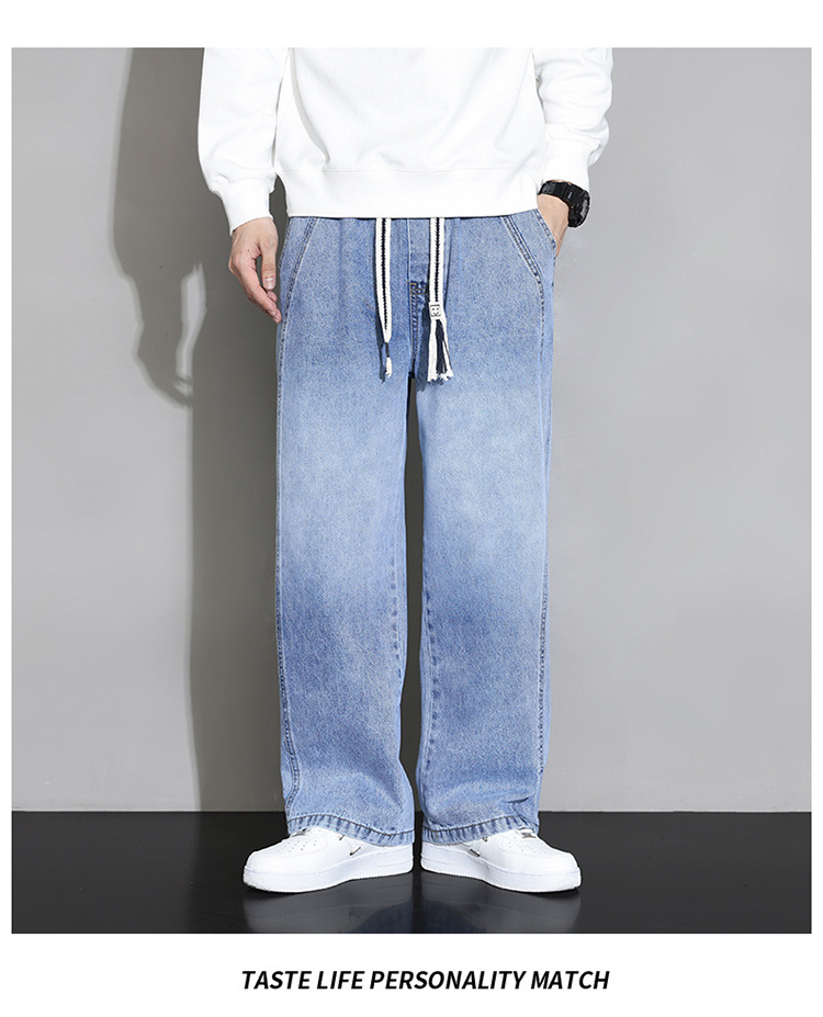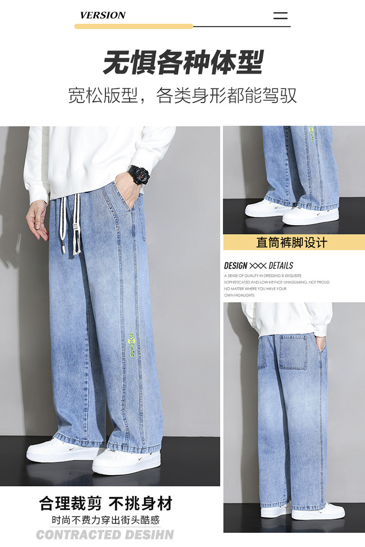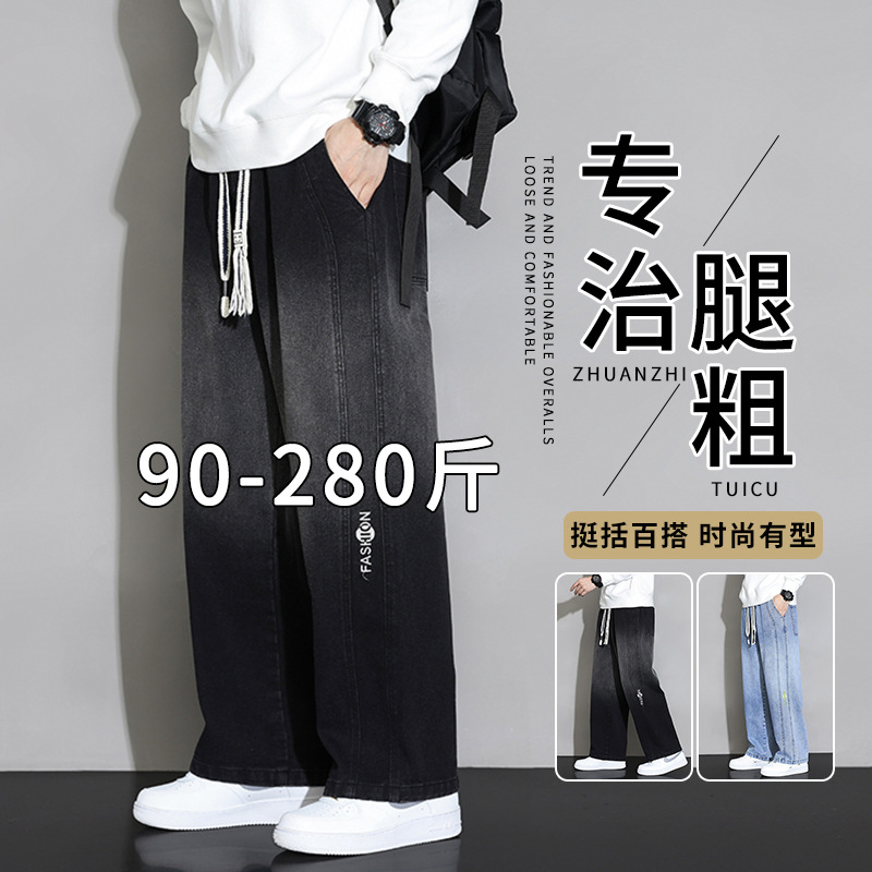 플러스 사이즈 스트레이트 데님 바지 남자 여름 미국 스타일 하이 스트리트 아이스 실크 느슨한 플러스 큰 뚱뚱한 넓은 다리 바지