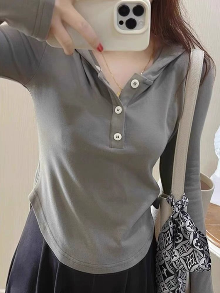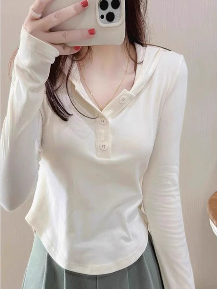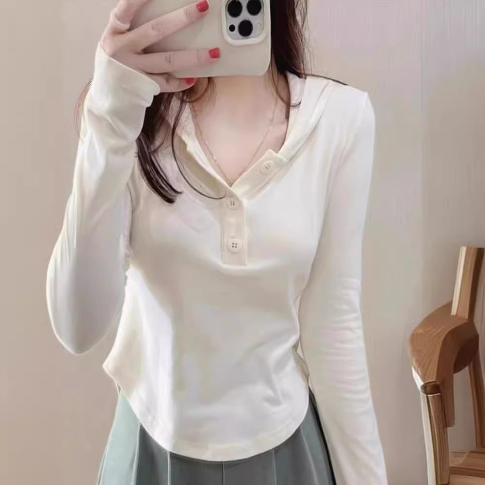 순수한 욕망 스타일 화이트 후드 긴팔 티셔츠 여성용 가을 슬림 핏 슬리밍 내베이스 셔츠 불규칙한 탑 Ins 트렌디