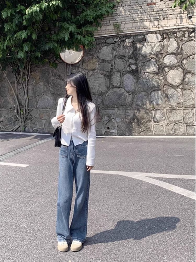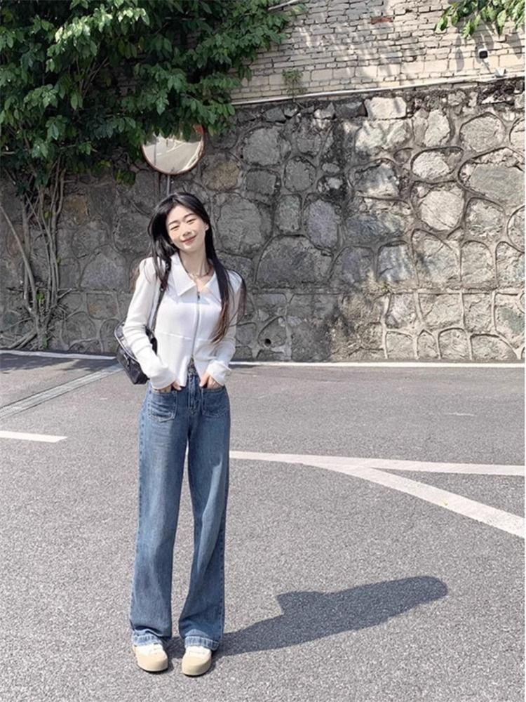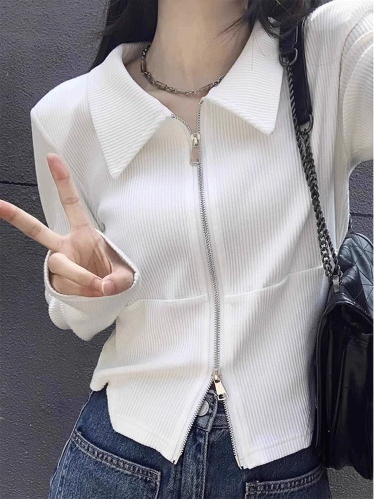 디자인 센스 더블 지퍼 옷깃 긴팔 티셔츠 여성용 봄과 가을 새로운 순수한 욕망 스타일 슬림핏 슬리밍 짧은 핫 걸탑