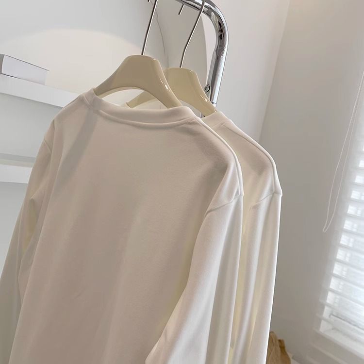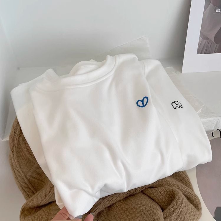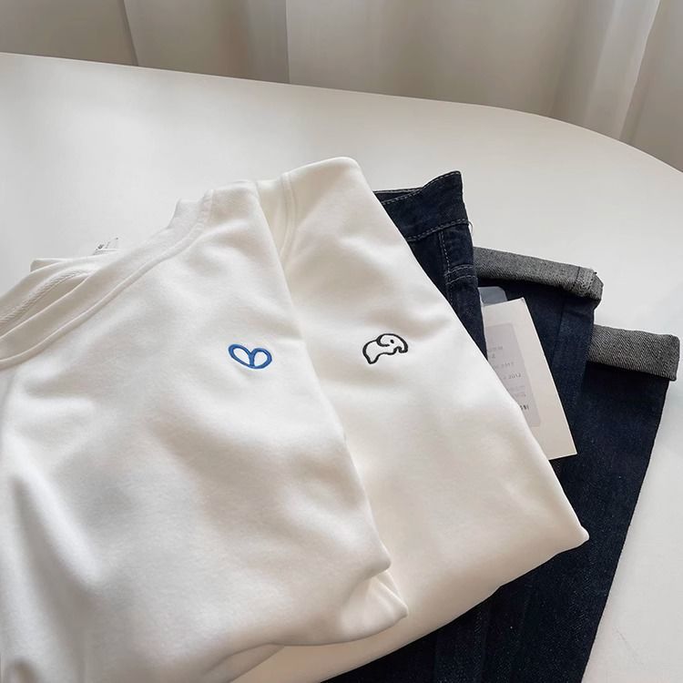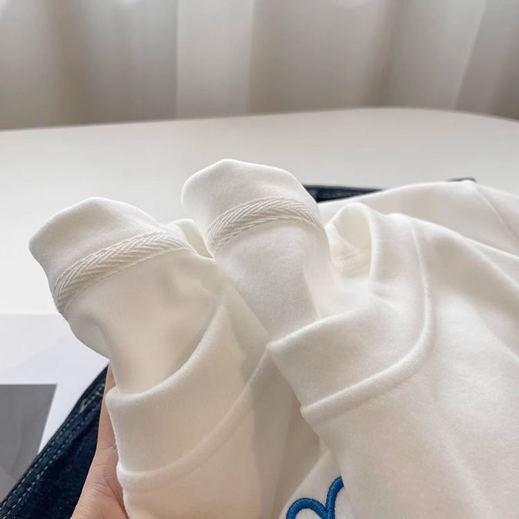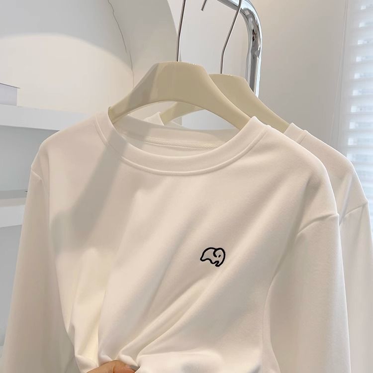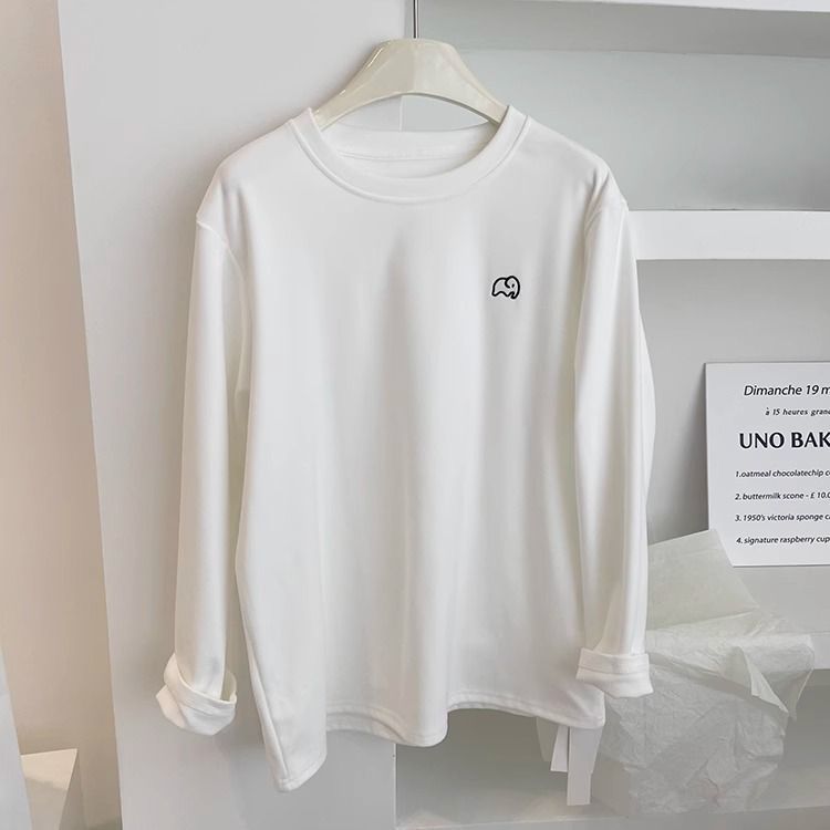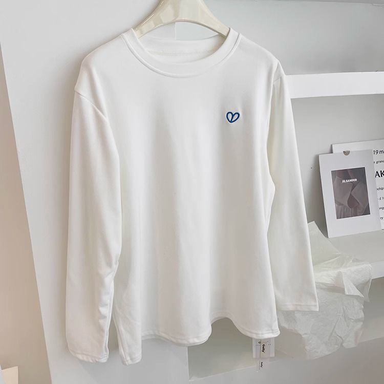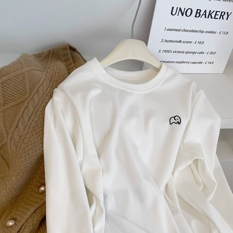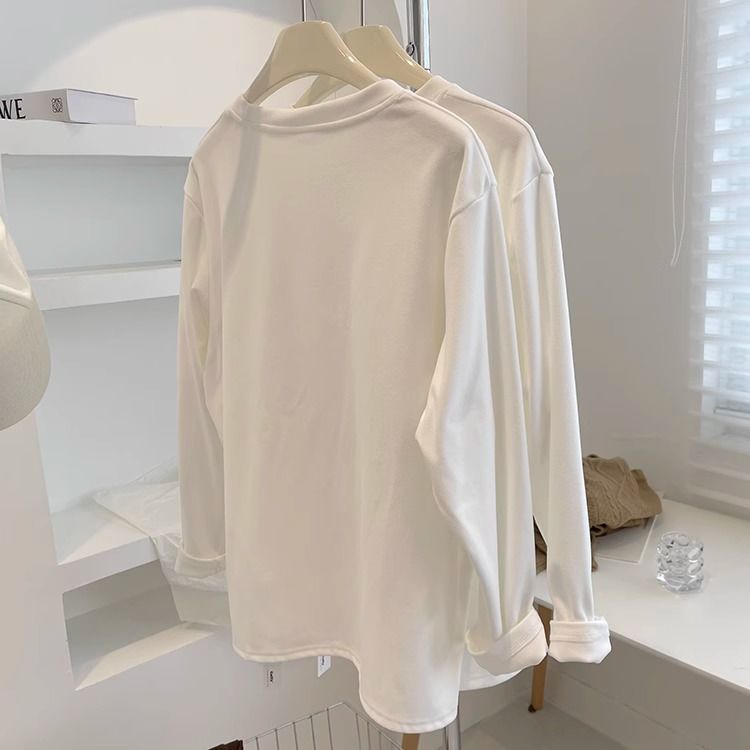 따뜻한 드 벨벳 작은 자수 둥근 목 흰색 긴 소매 티셔츠 여성! 가을과 겨울 두꺼운 느슨한 내부 착용 외신베이스 셔츠