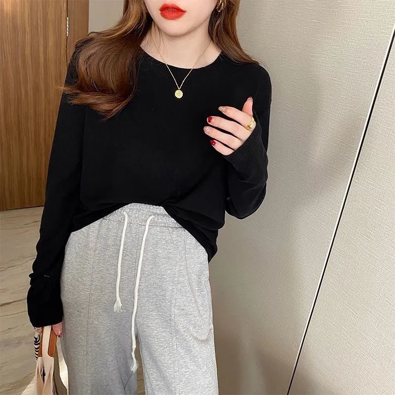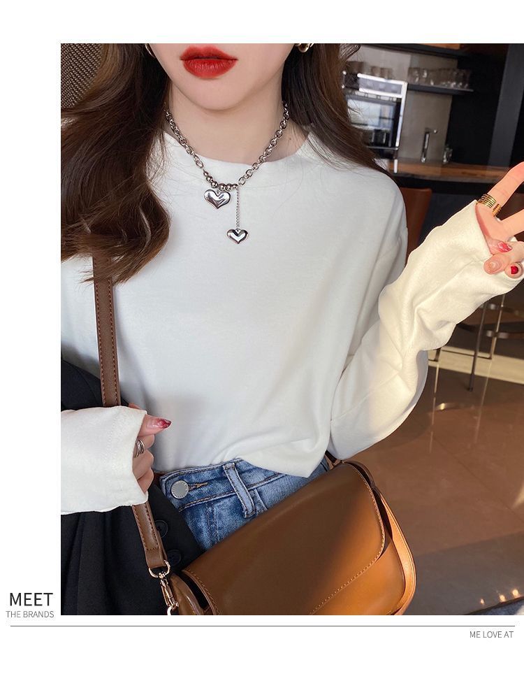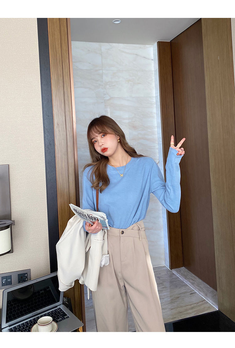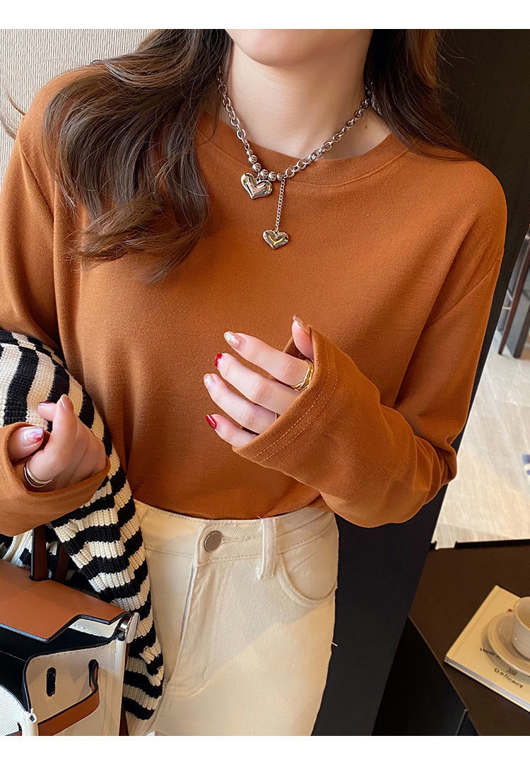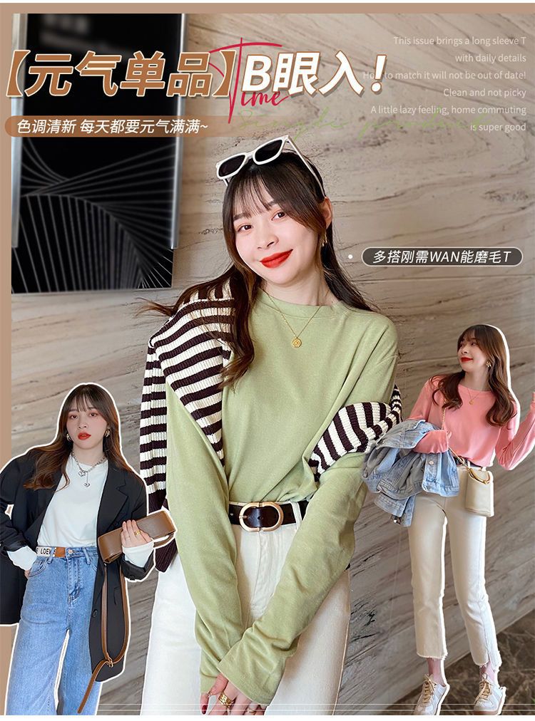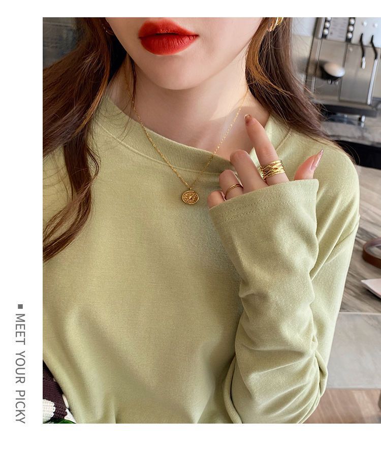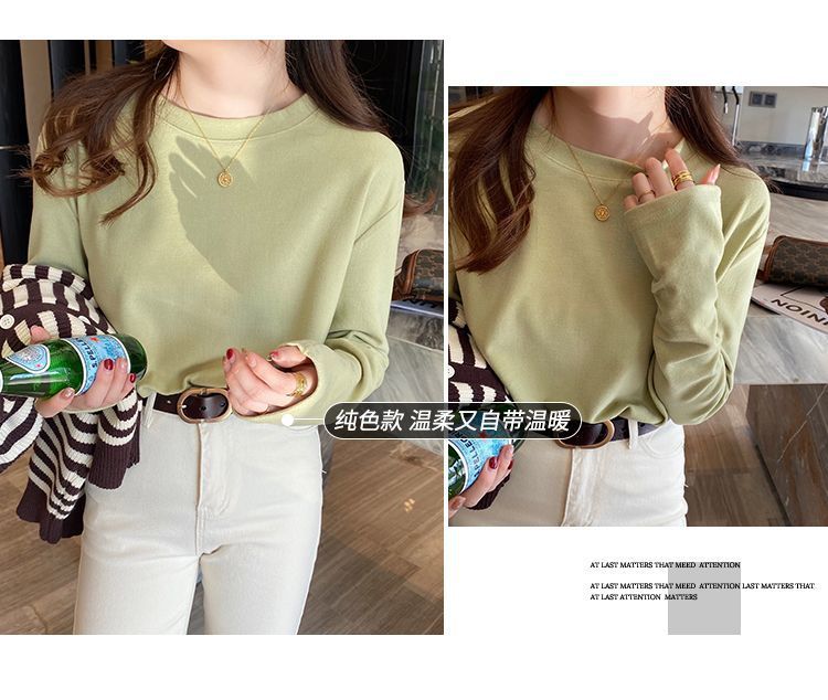 양면 벨벳 가을과 겨울 새로운 긴팔 티셔츠 여성용 느슨한 내베이스 셔츠 라운드 넥 샌딩 화이트 솔리드 컬러 탑