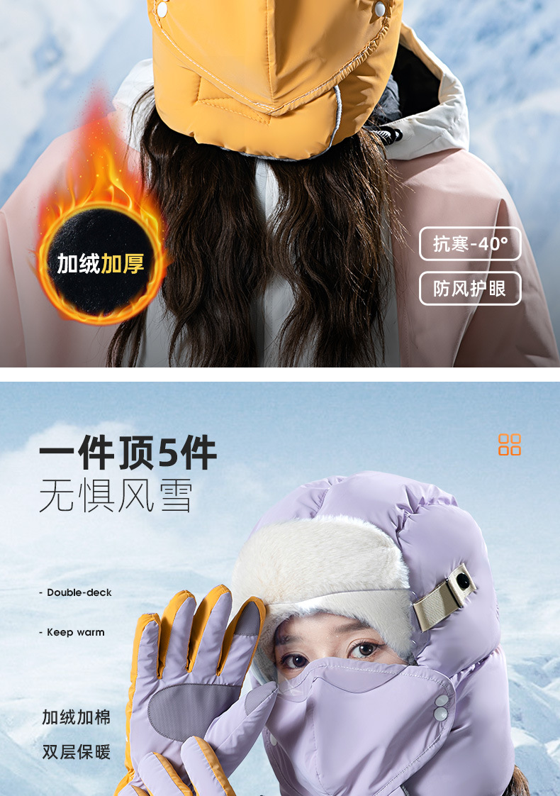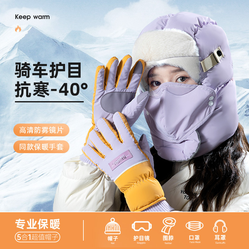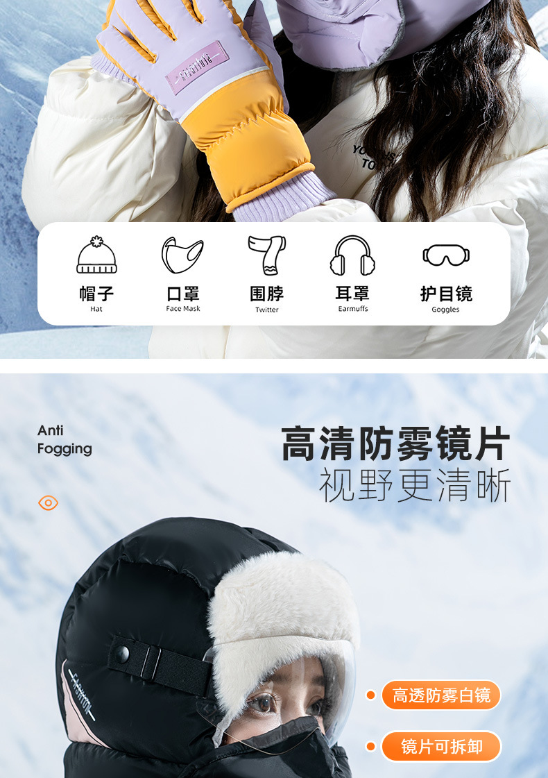 | 颜色 | 黑色, 灰色, 紫色, 黄色 | 尺码 | 单帽【只买帽子】, 两件套【帽子+防雾护目镜】, 三件套【帽子+防雾护目镜+手套】 |