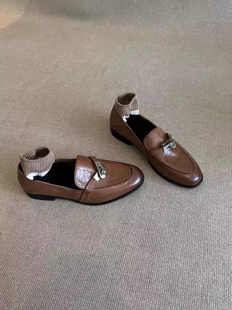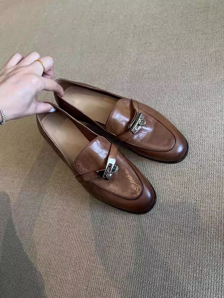 Cowhide 버전 ~ 정품 가죽 레트로 말 버클 로퍼 여성 플랫 싱글 레이어 신발 게으른 한 단계 영국 스타일 작은 가죽 신발