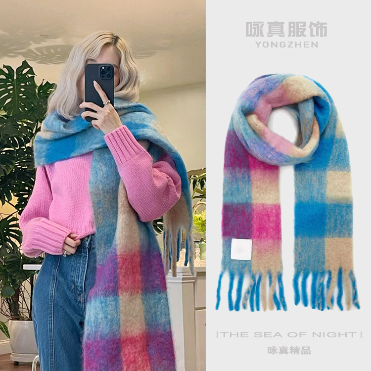 C 브랜드 레인보우 스카프 목도리 레인보우 격자 무늬 모헤어 양모 스카프 긴 연통 겨울