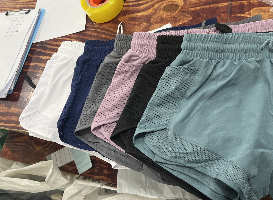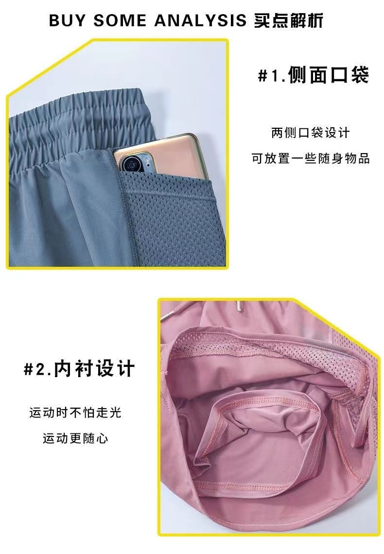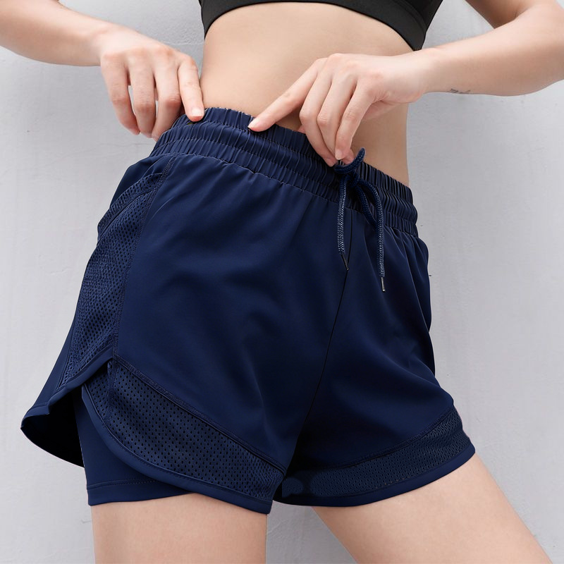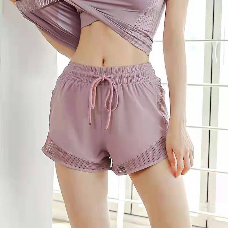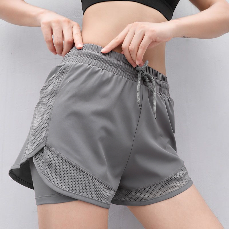 여름 새로운 안티 라이트 스포츠 피트니스 반바지 여성용 루즈 메쉬 바느질 가짜 투피스 퀵 건조 바지 요가 바지