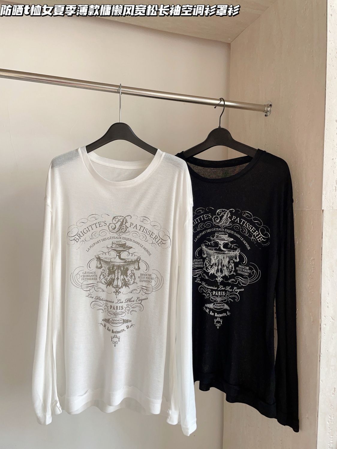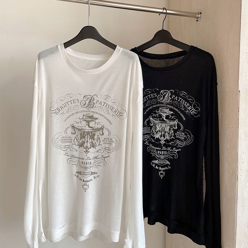 여름 디자인 감각 성격 인쇄 얇은 긴 소매 흰색 티셔츠 여성의 느슨한 캐주얼 순수 선 스크린 블라우스 탑