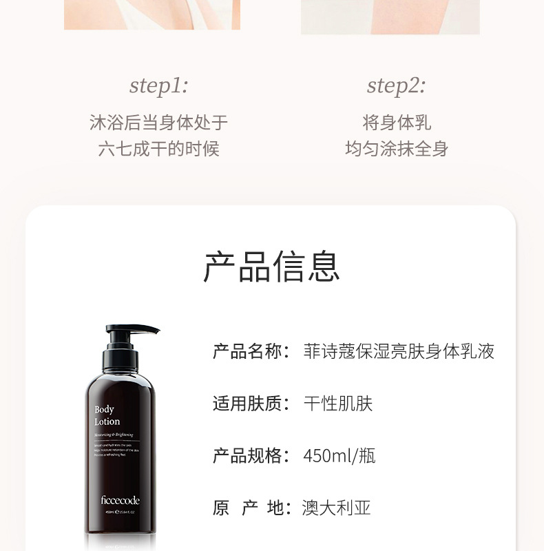 | 类别 | 润体乳 | 产品名称 | 菲诗蔻保湿亮肤身体乳 |