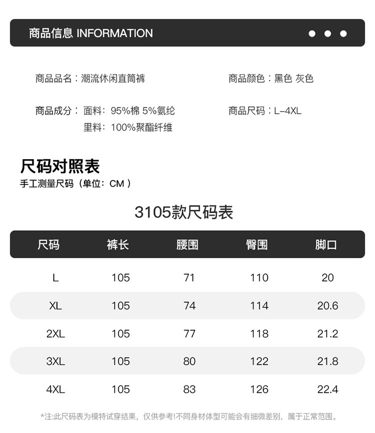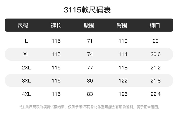 | 颜色 | 黑色/105-单, 黑色/110-单, 黑色/115-单, 灰色/105-单, 灰色/110-单, 灰色/115-单, 黑色/105-绒, 黑色/110-绒, 黑色/115-绒, 灰色/105-绒, 灰色/110-绒, 灰色/115-绒 | 尺码 | L, XL, XXL, XXXL, 4XL |