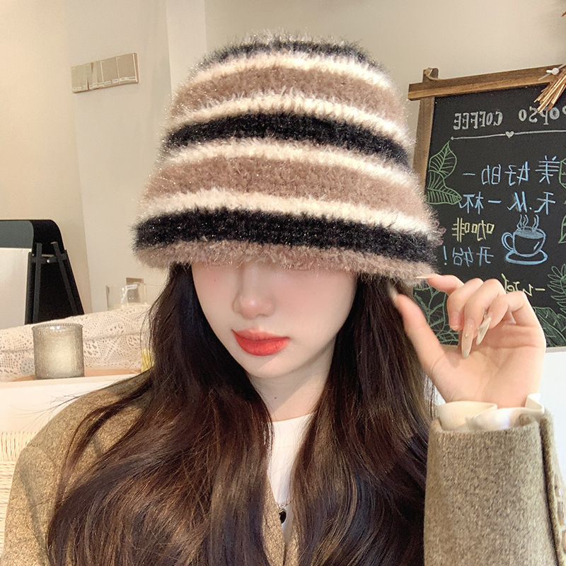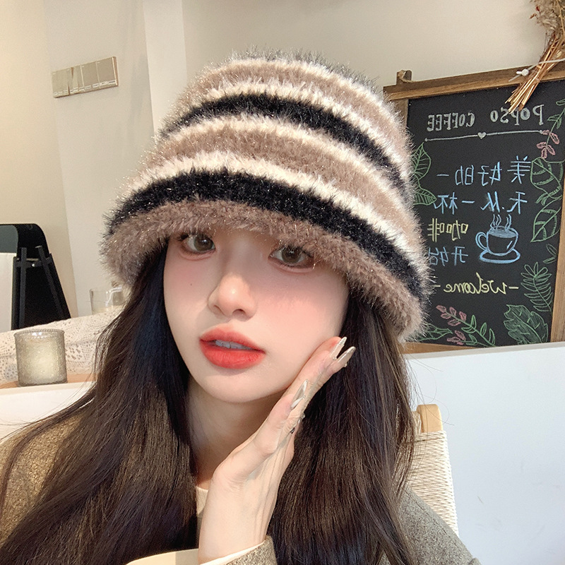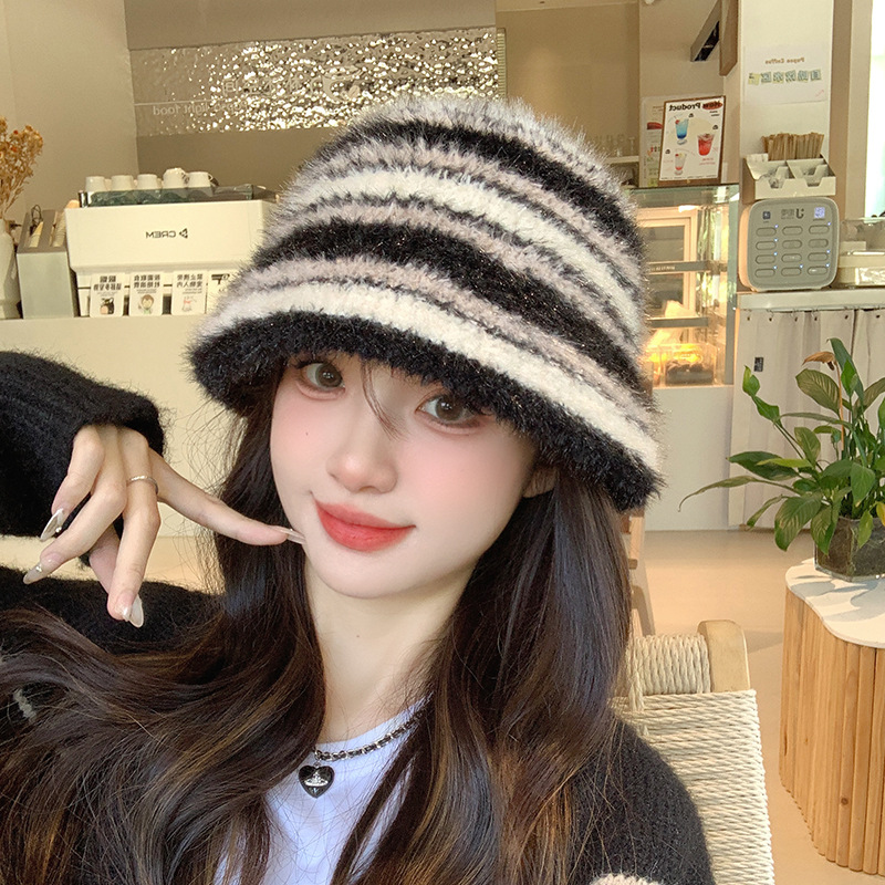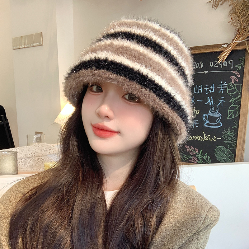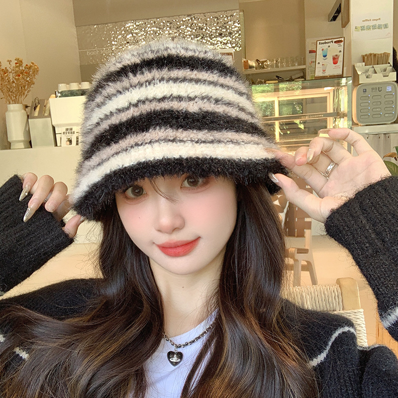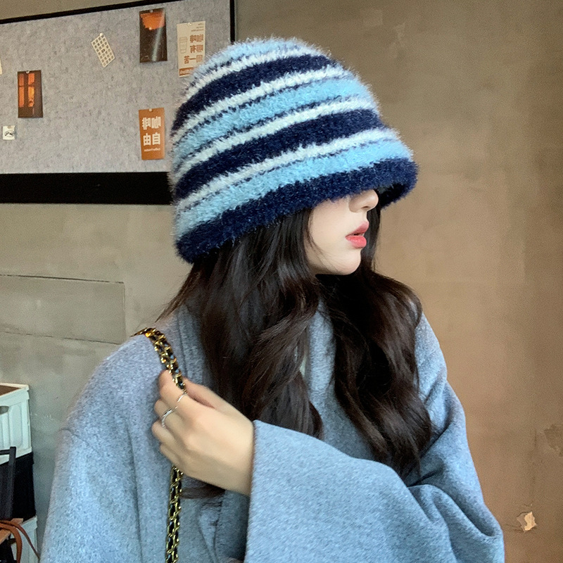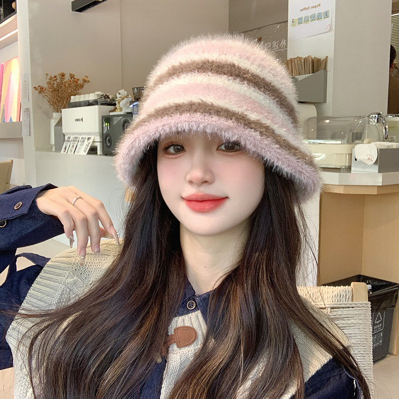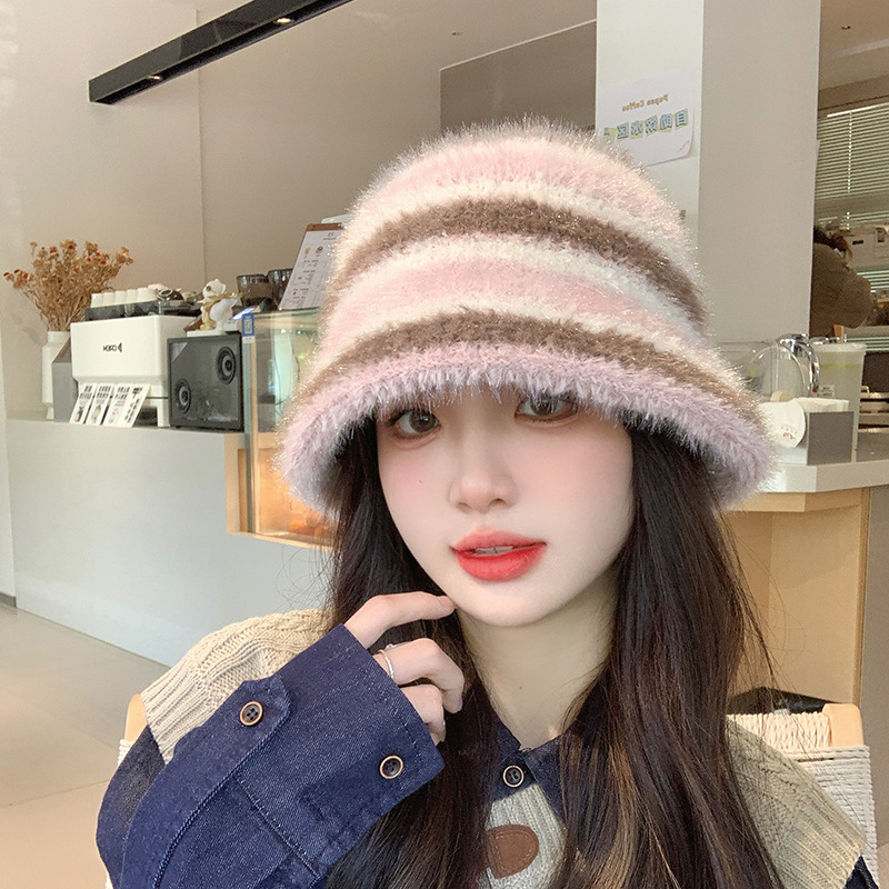 도파민 색상 일치 어부 모자 여성의 겨울 한국식 두꺼운 따뜻한 귀 보호 니트 분지 모자 얼굴 표시 작은 양동이 모자