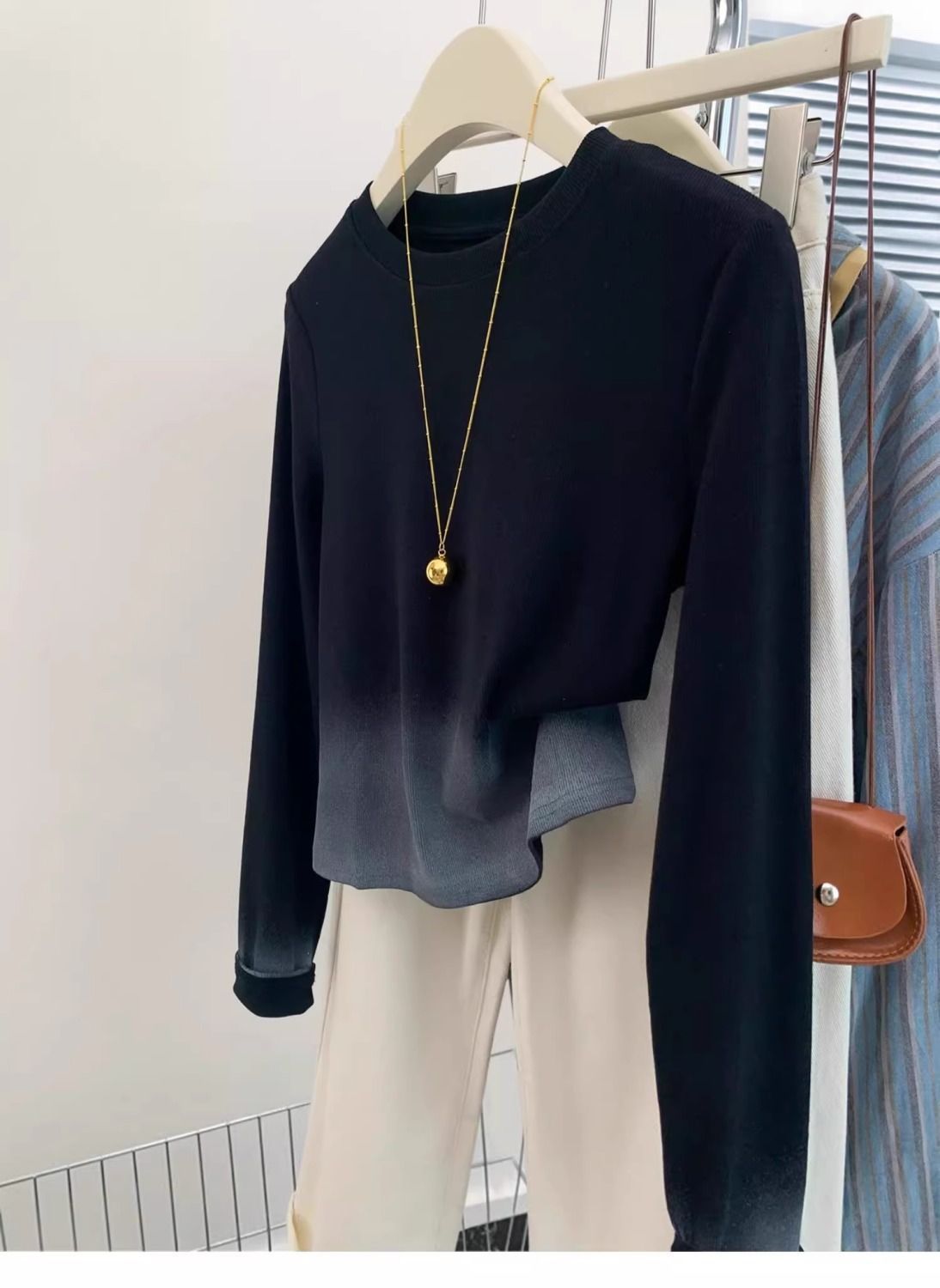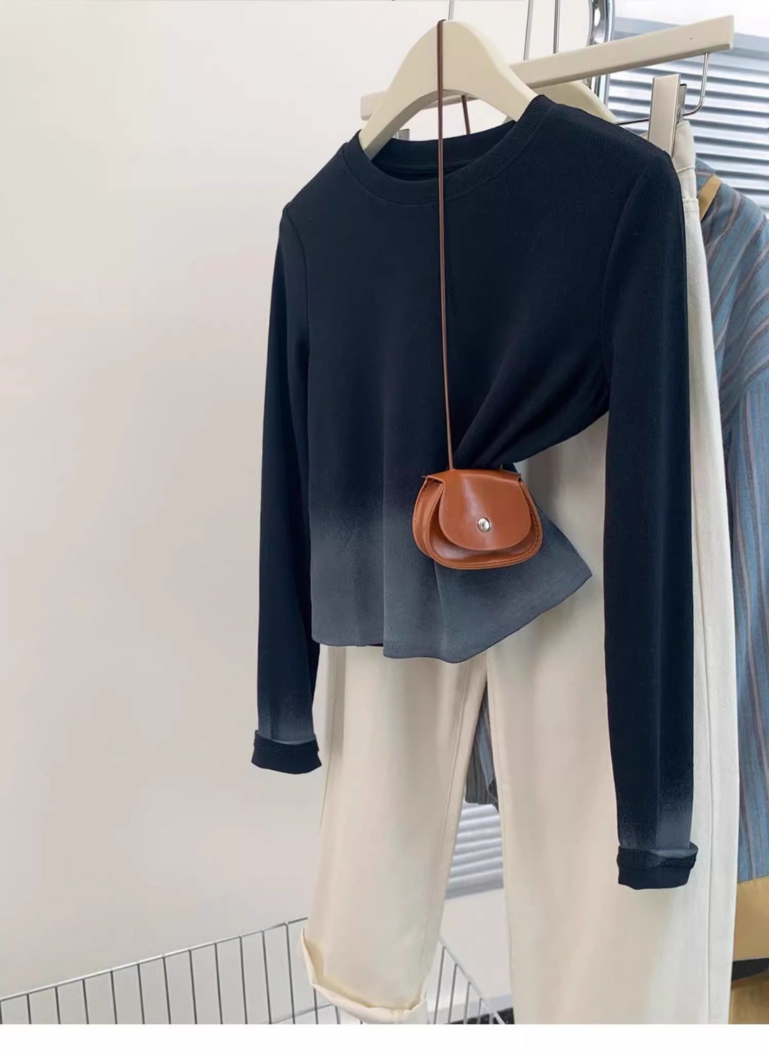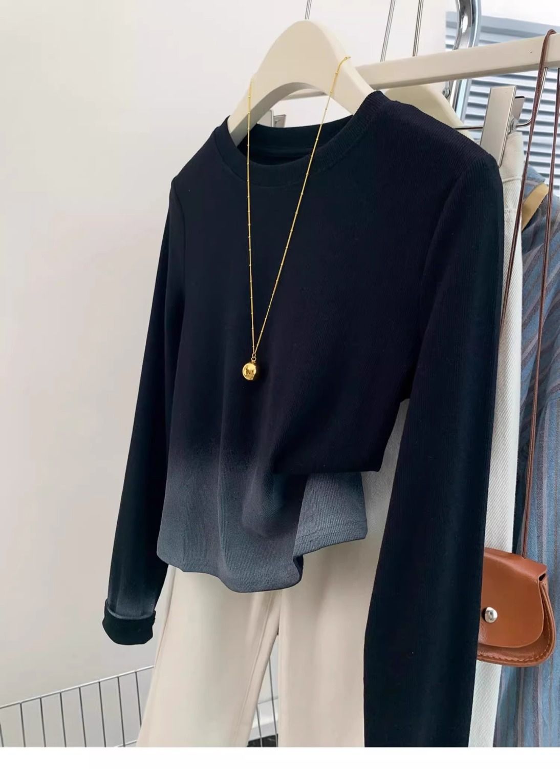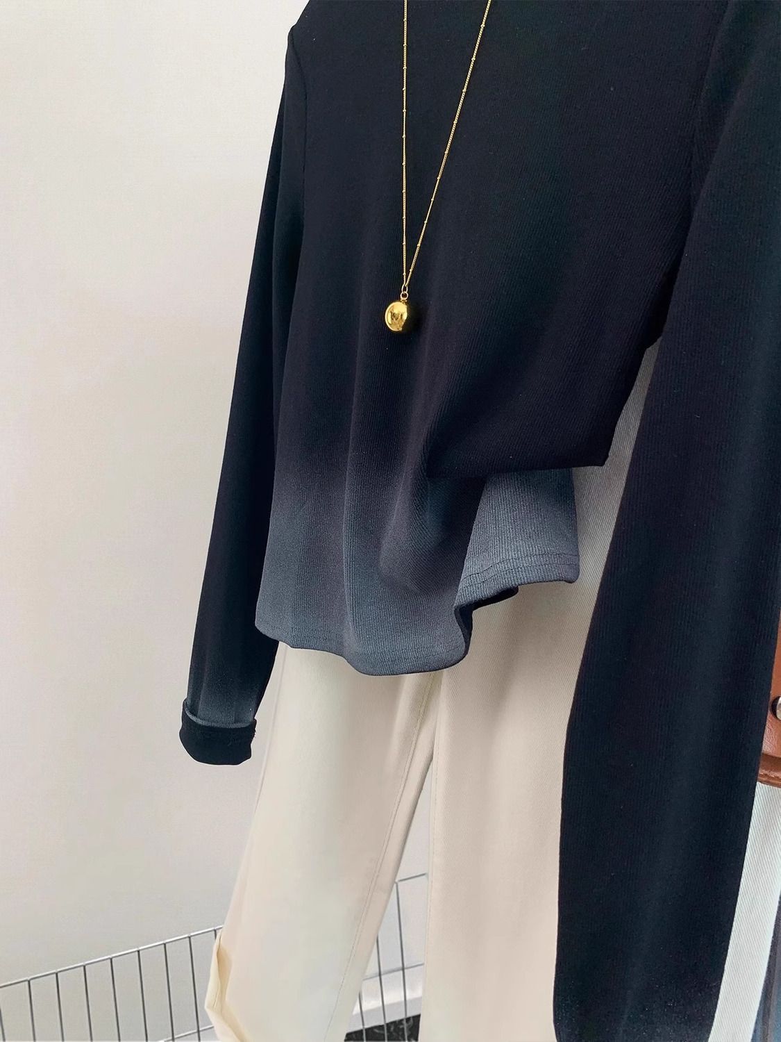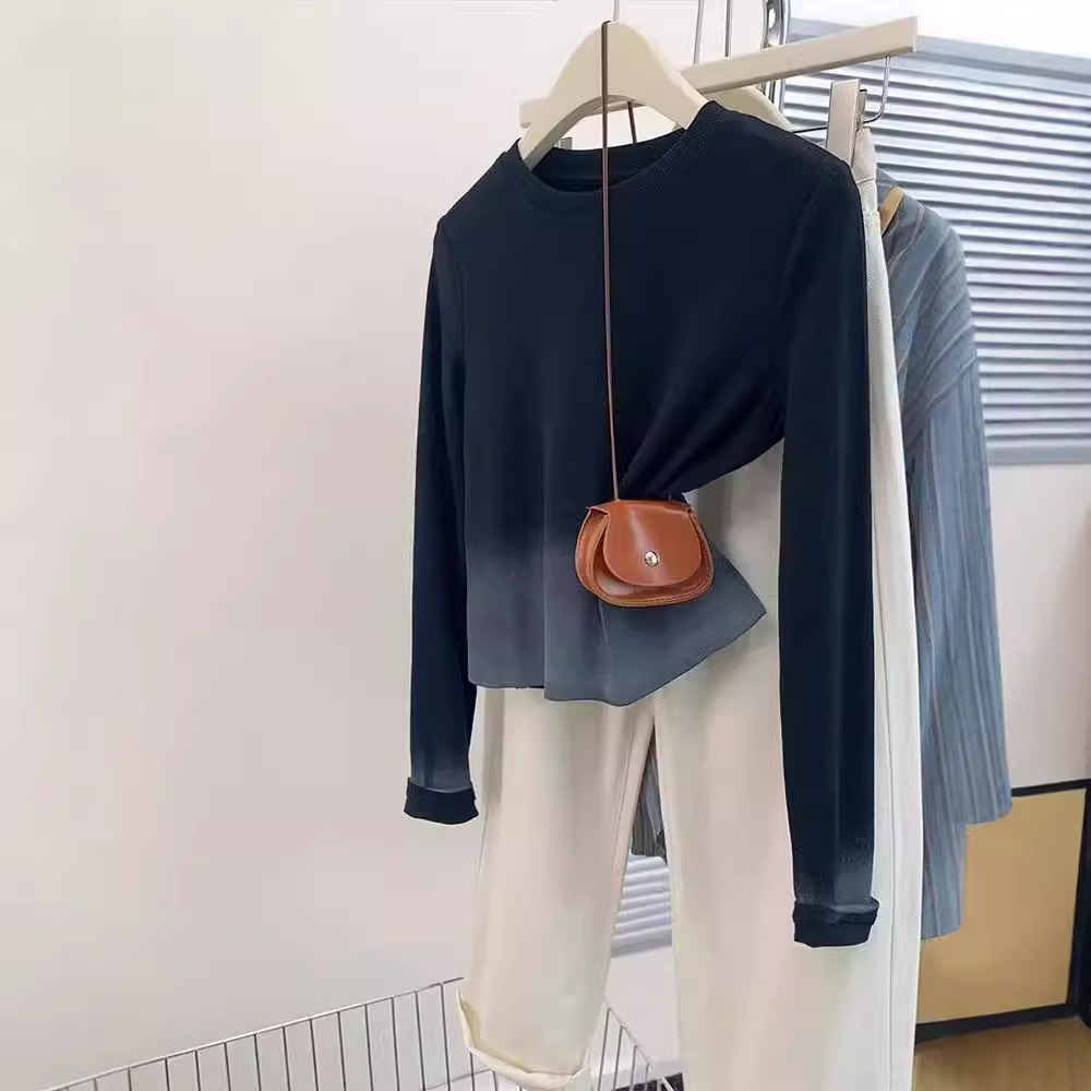 광저우 13 라인 여성 블랙 그라디언트 어깨 긴팔 티셔츠 여성 가을 디자인 센스 틈새 슬림 독특한 탑