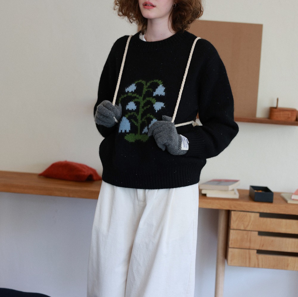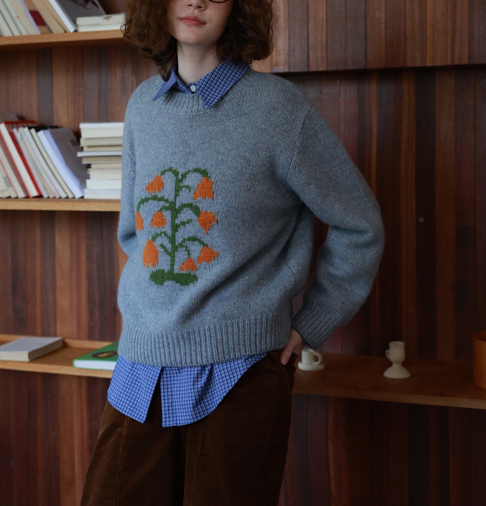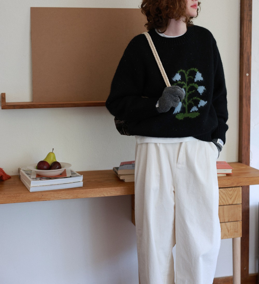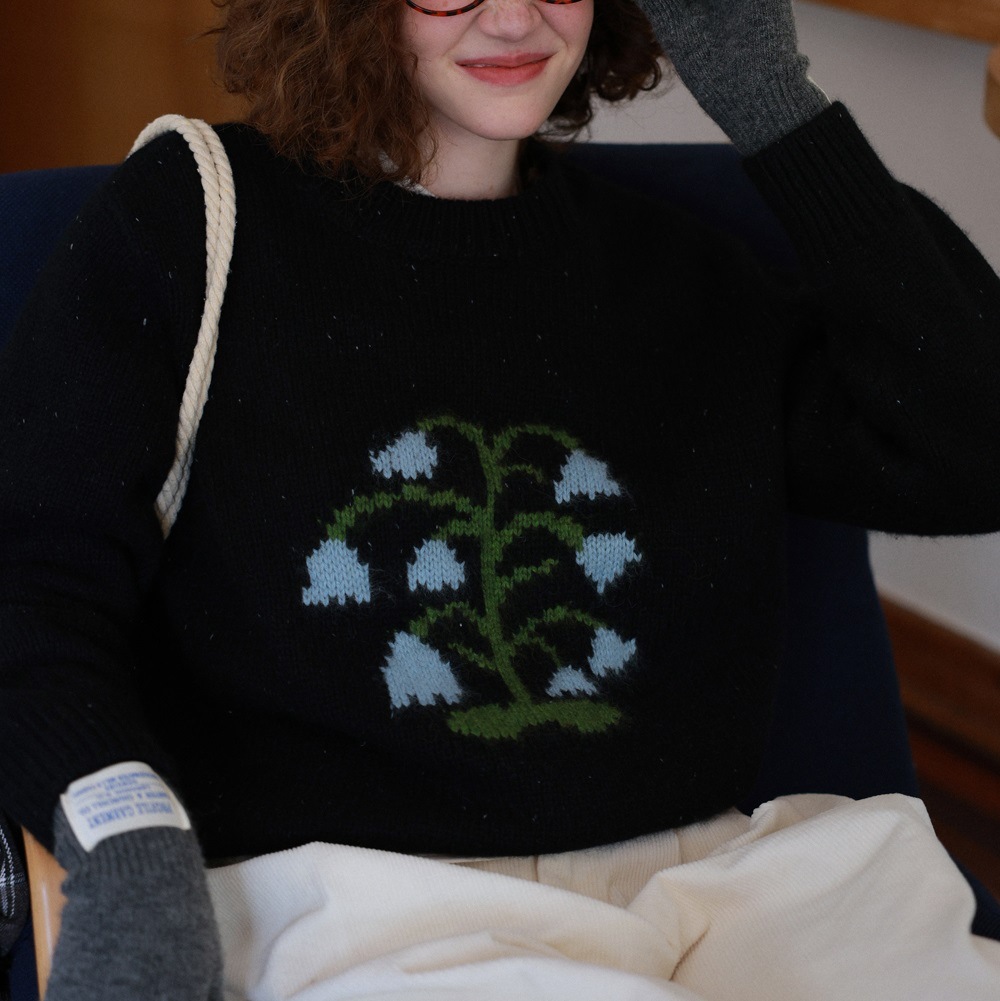 이 문제는 무겁습니다! 메리노 울 & 너구리 벨벳 릴리 오브 더 럼 자카드 투톤 풀오버 니트 스웨터