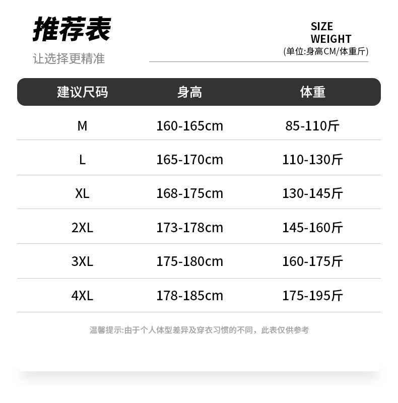 | 颜色 | 黑色, 深灰色, 浅卡其色 | 尺码 | M, L, XL, 2XL, 3XL, 4XL |