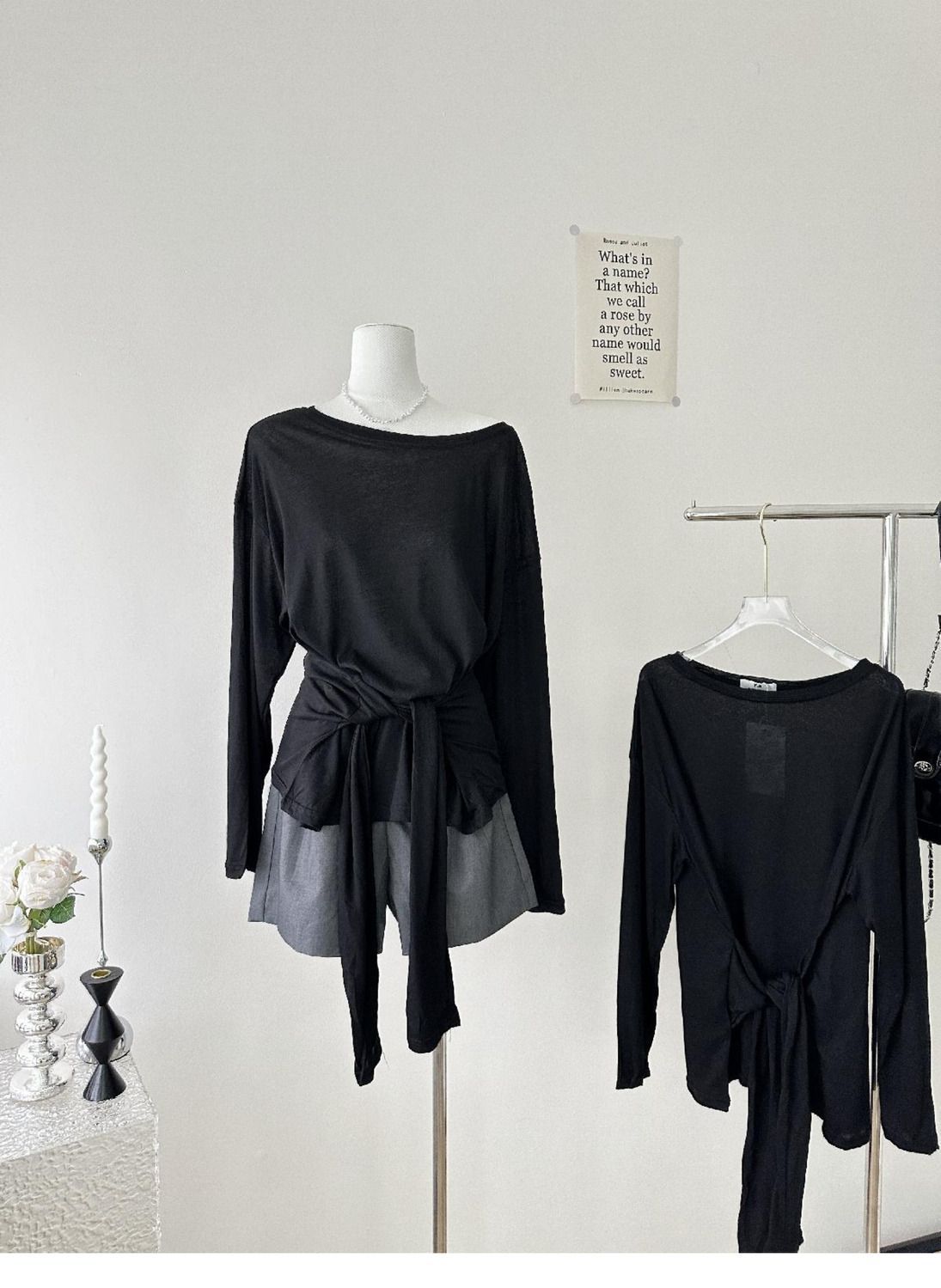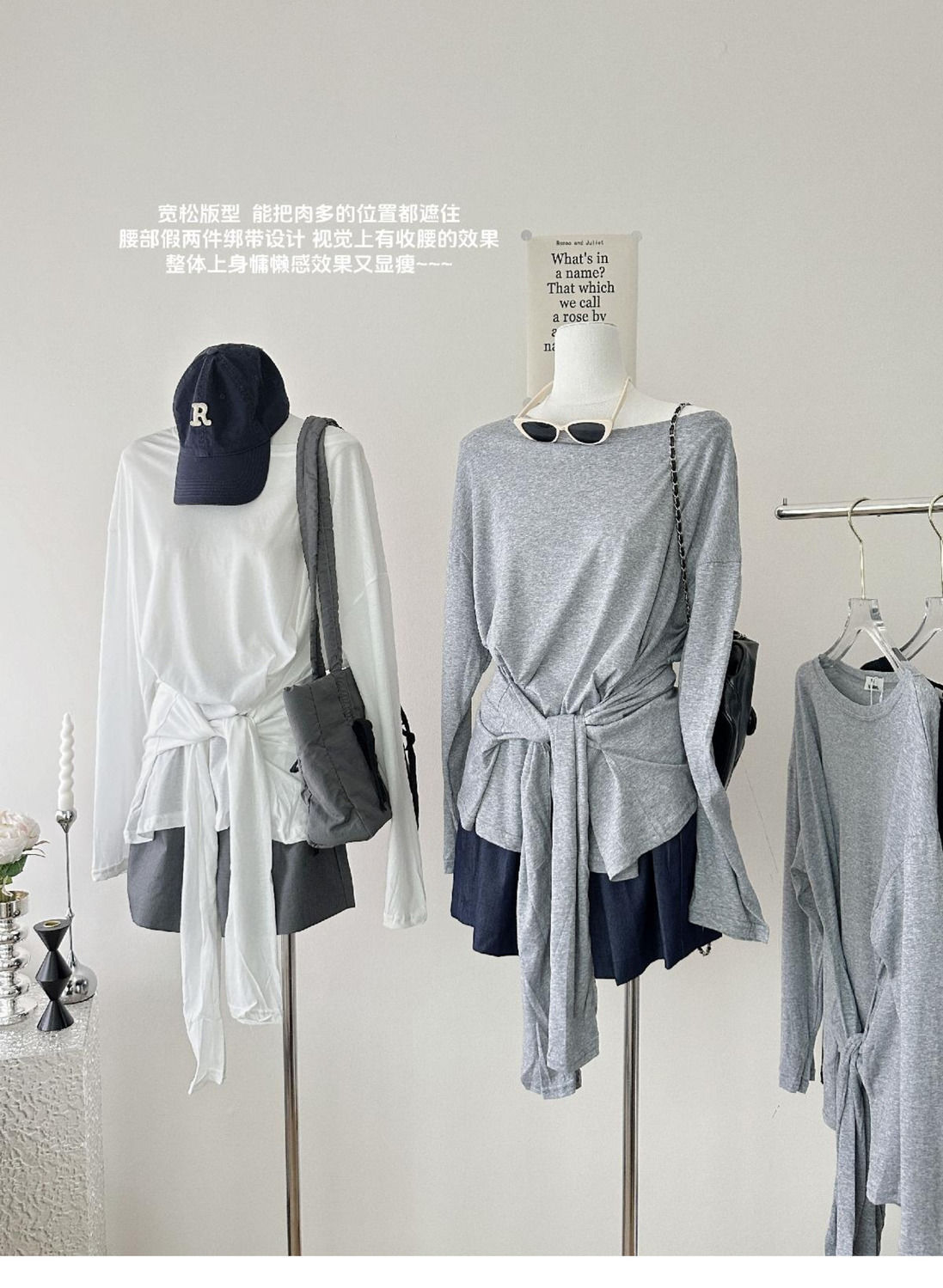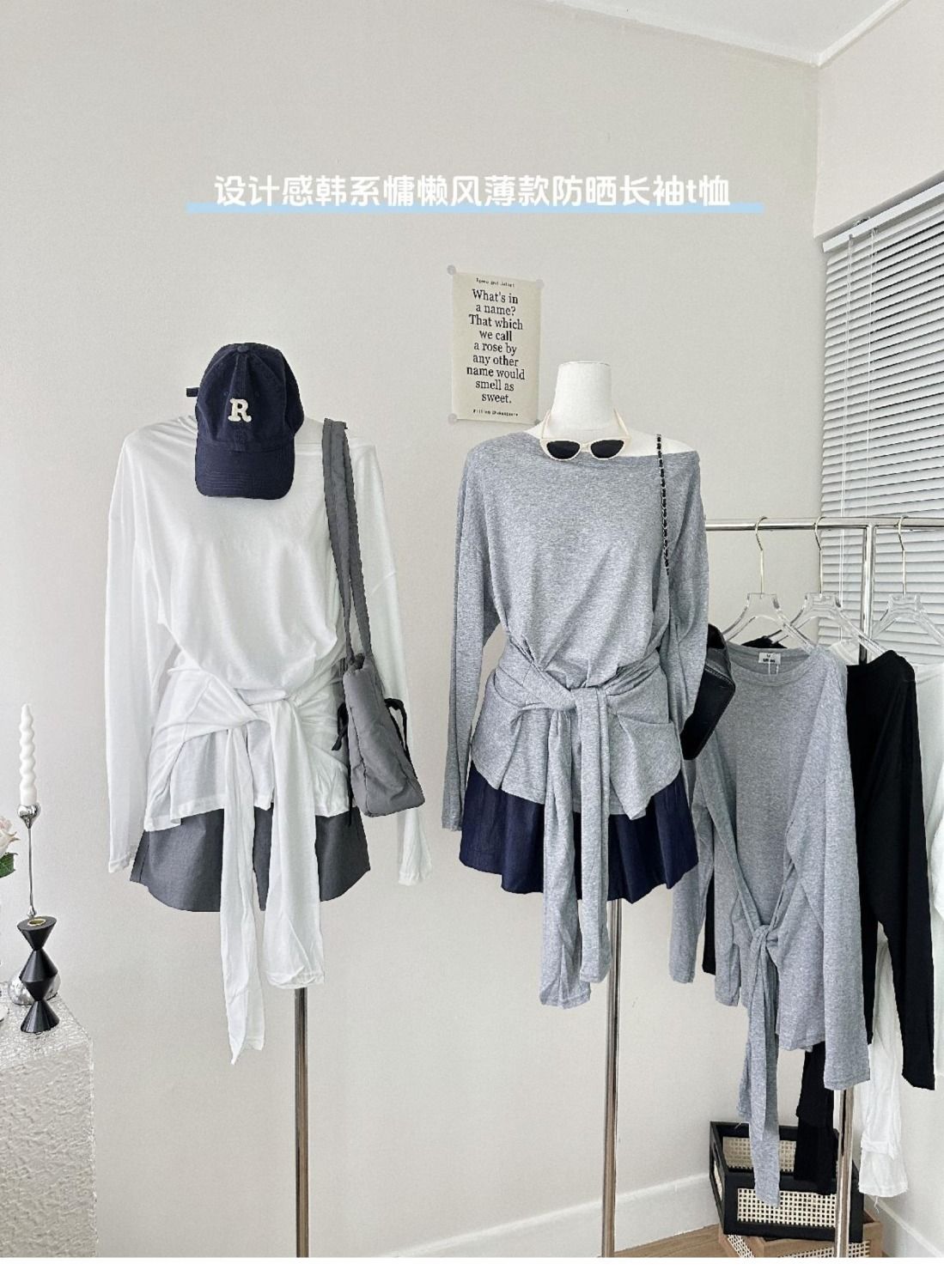 게으른 스타일 레이스 업 가짜 투피스 디자인 센스 타이트 허리 스트랩 느슨한 얇은 선 스크린 셔츠 여름 긴팔 티셔츠