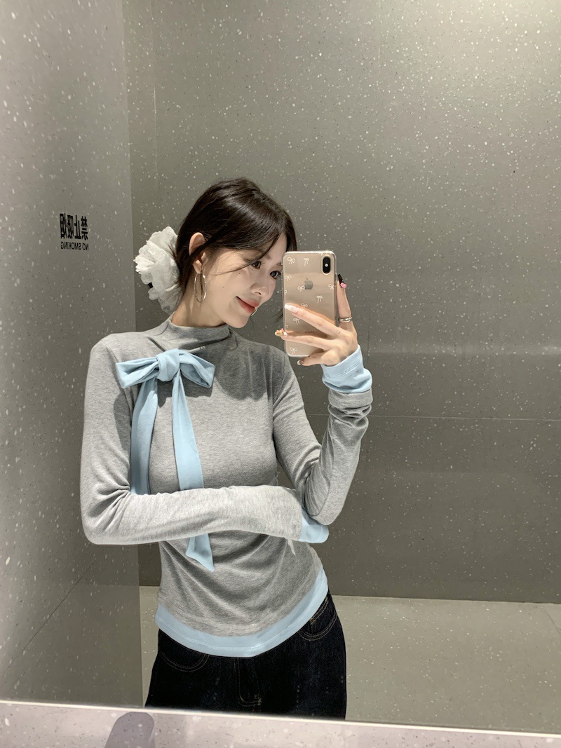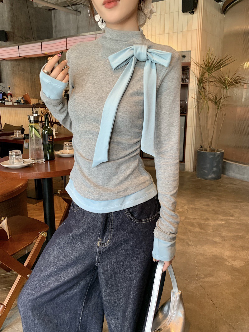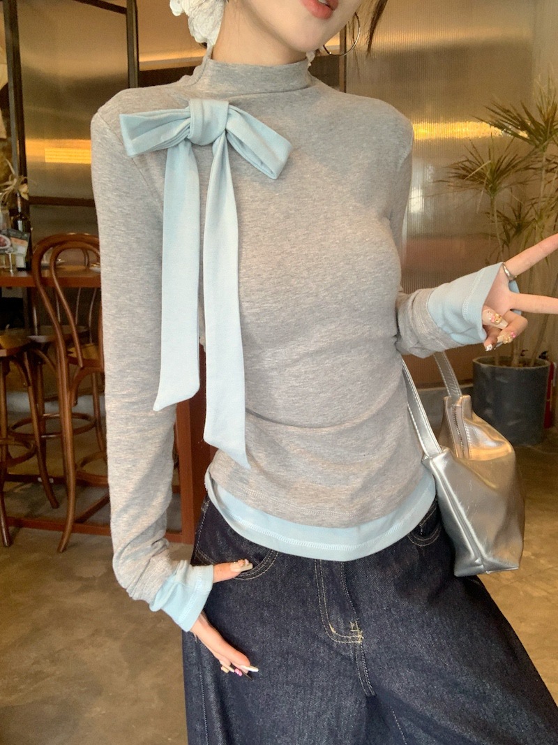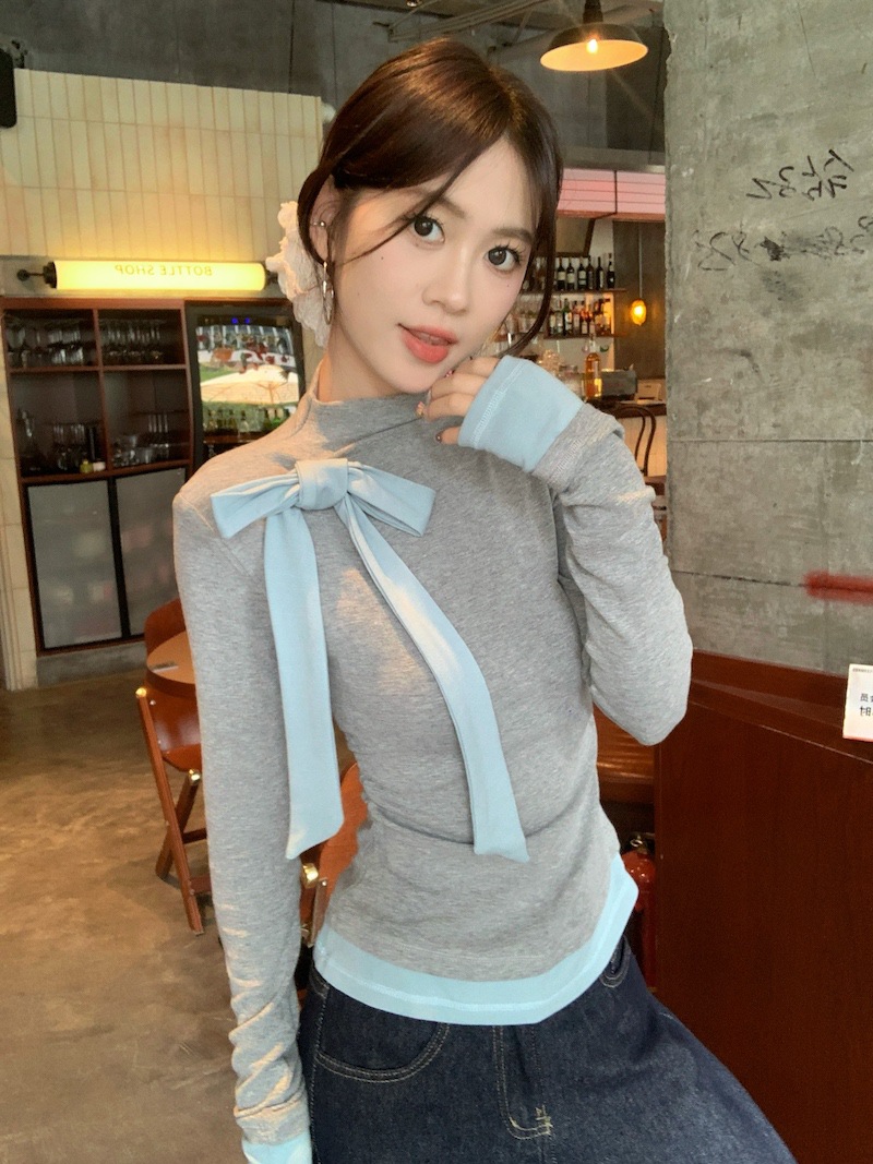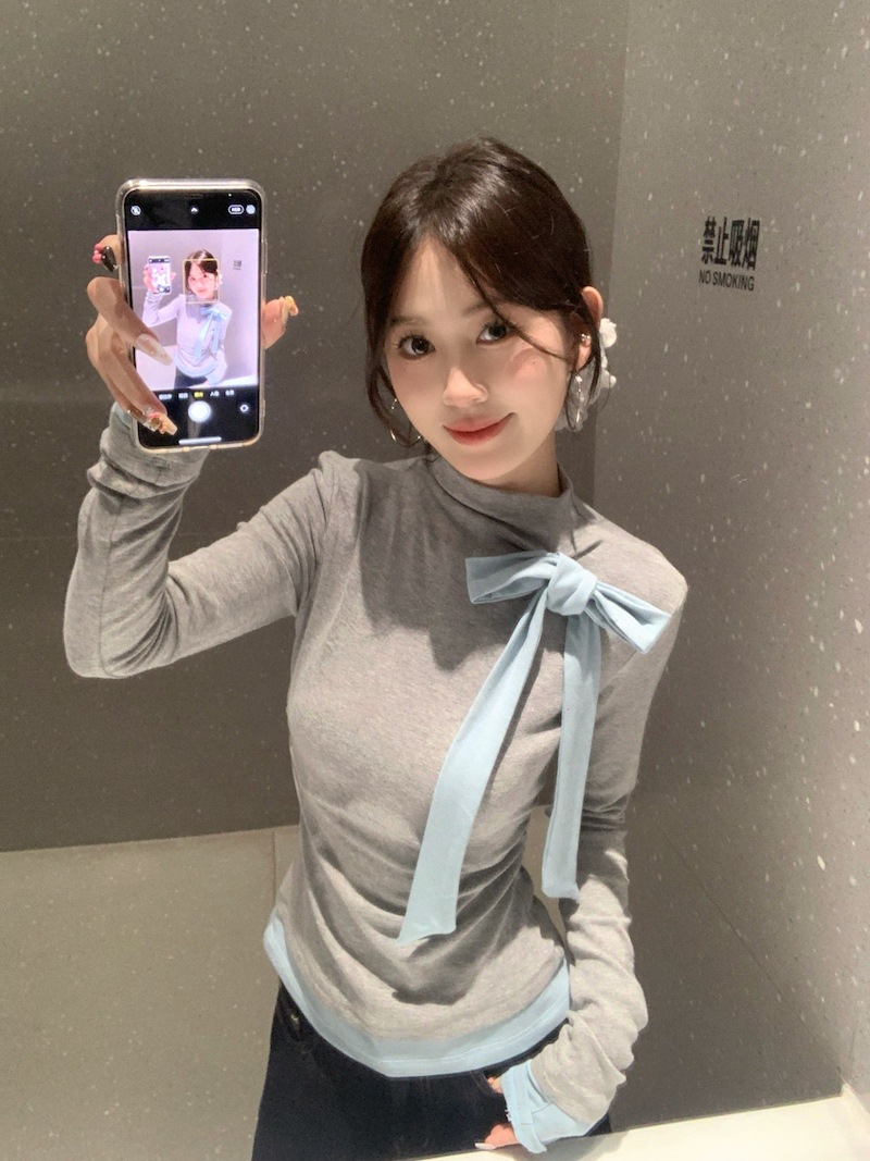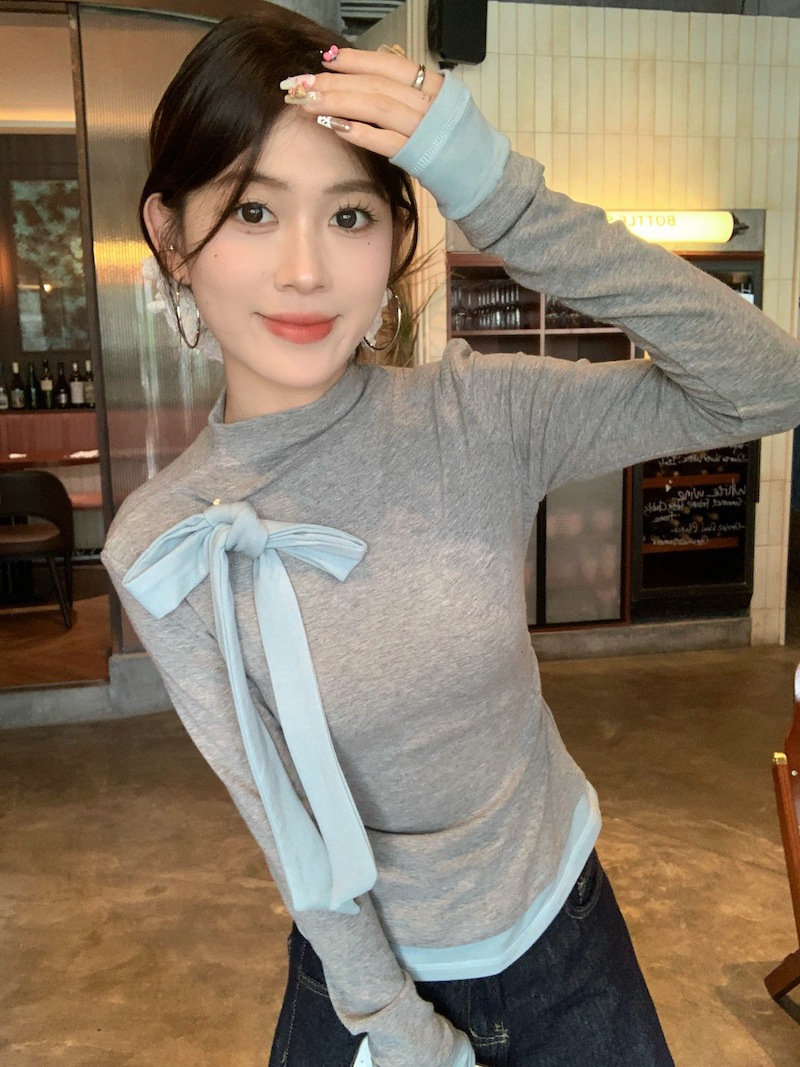 활 레이스 업 대비 긴팔 티셔츠 여성용 가을 슬림 핏 슬리밍 기본 레이어 셔츠 우아한 짧은 가짜 투피스 탑
