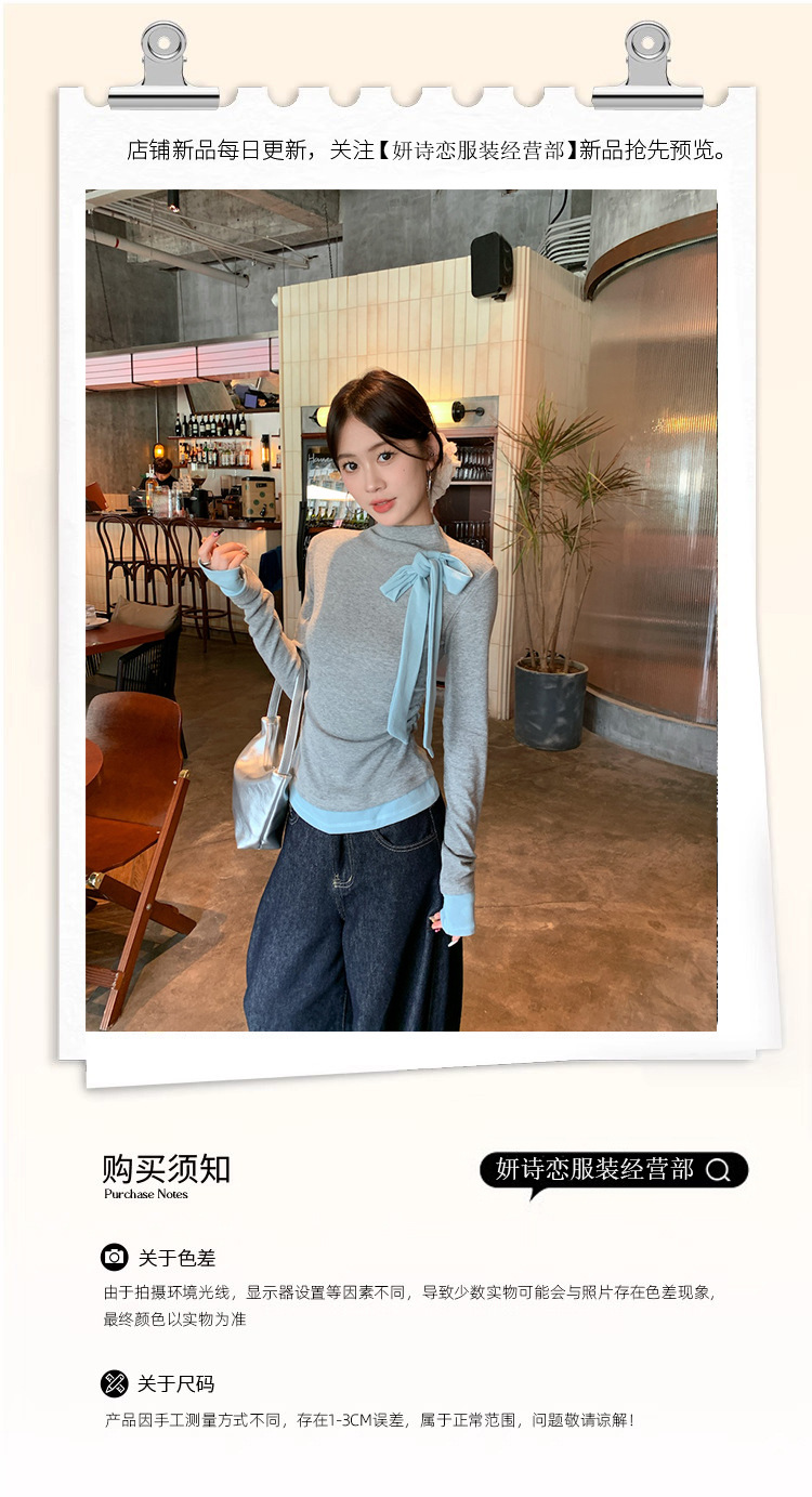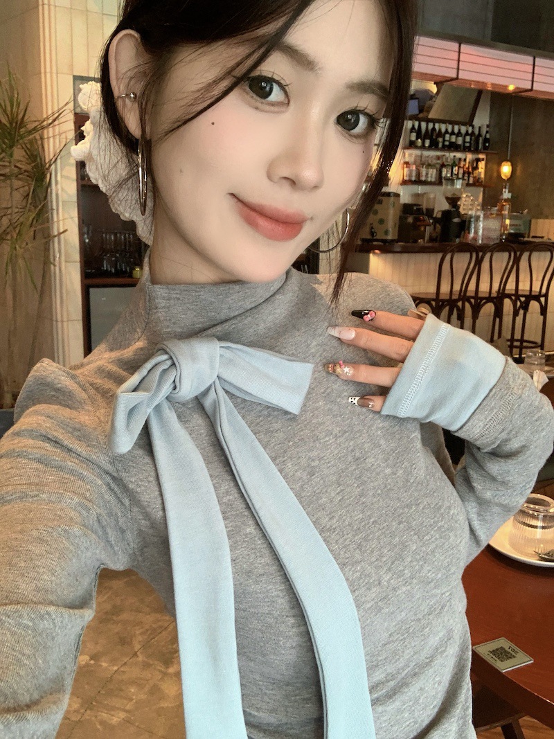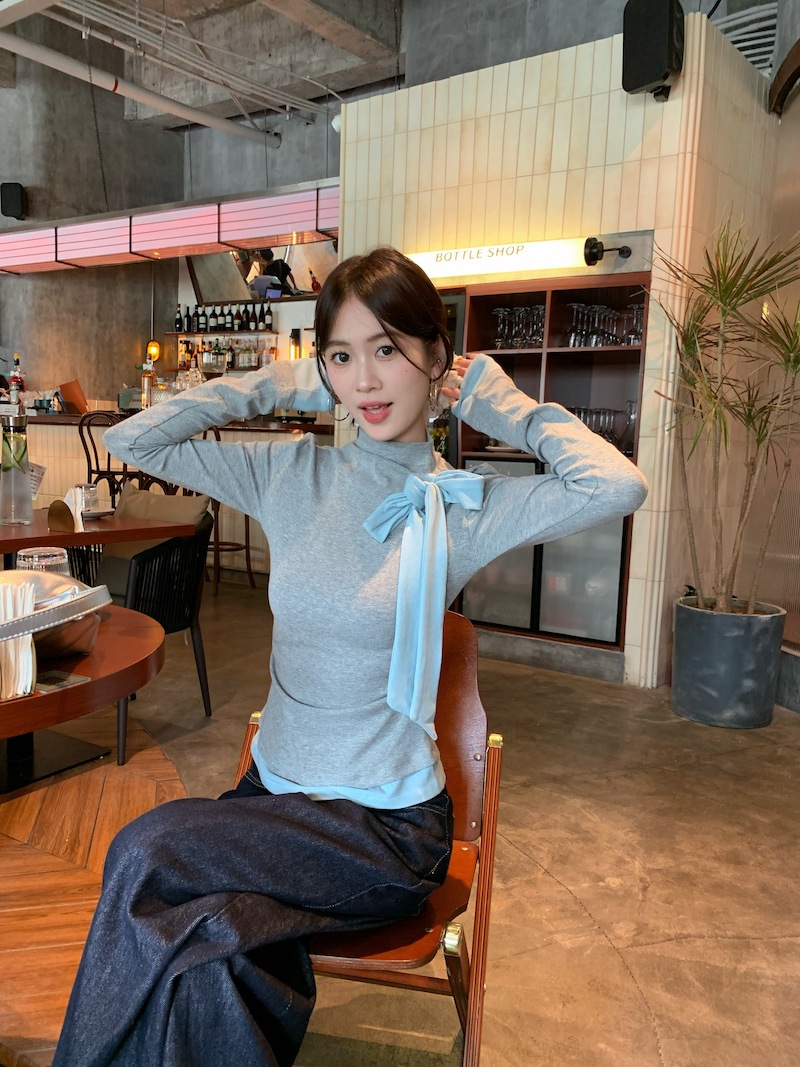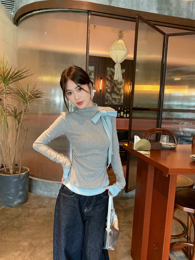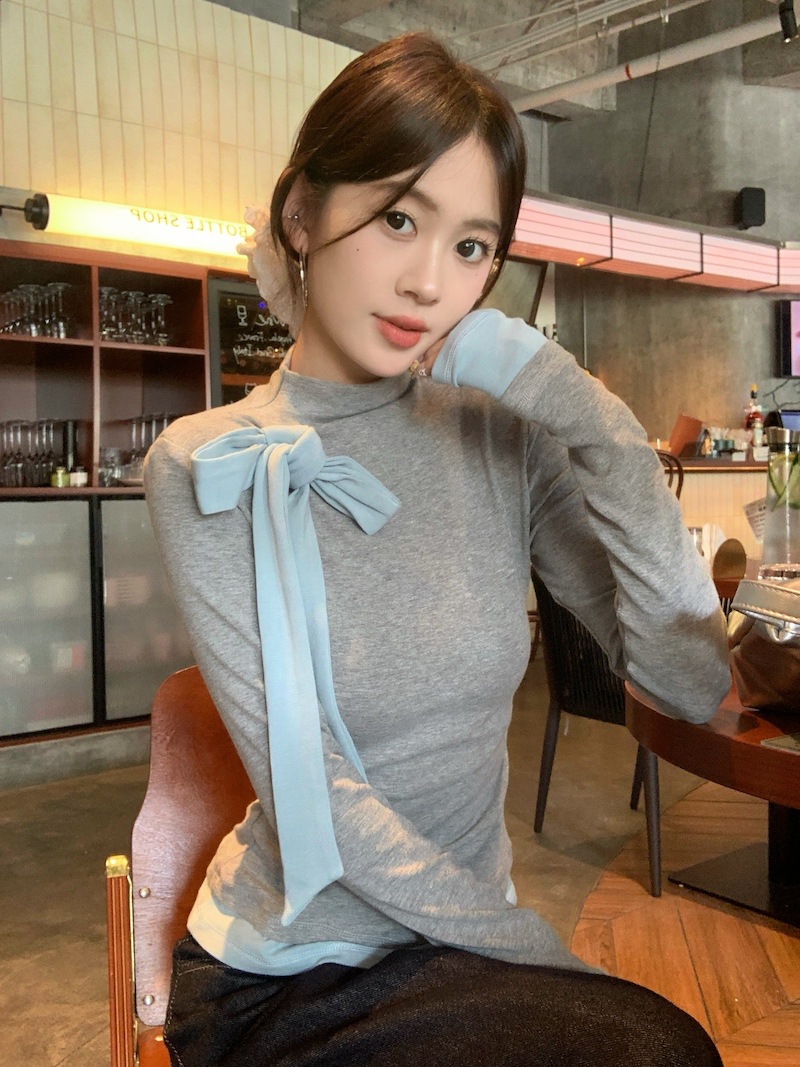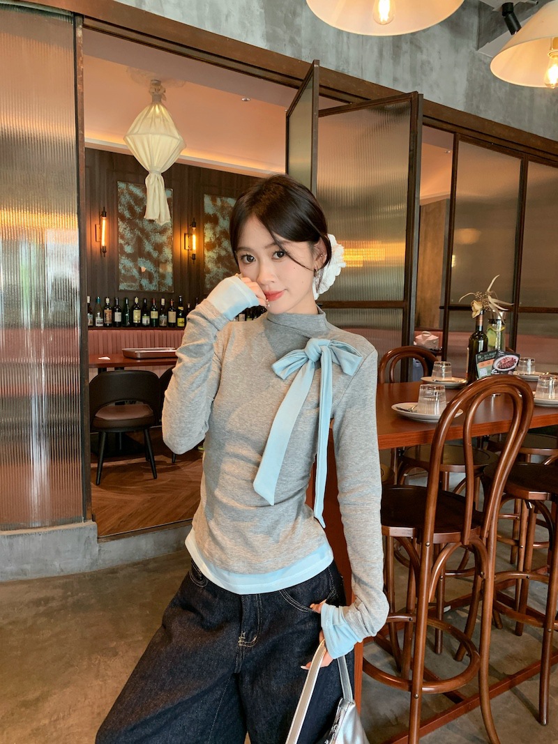 활 레이스 업 대비 긴팔 티셔츠 여성용 가을 슬림 핏 슬리밍 기본 레이어 셔츠 우아한 짧은 가짜 투피스 탑