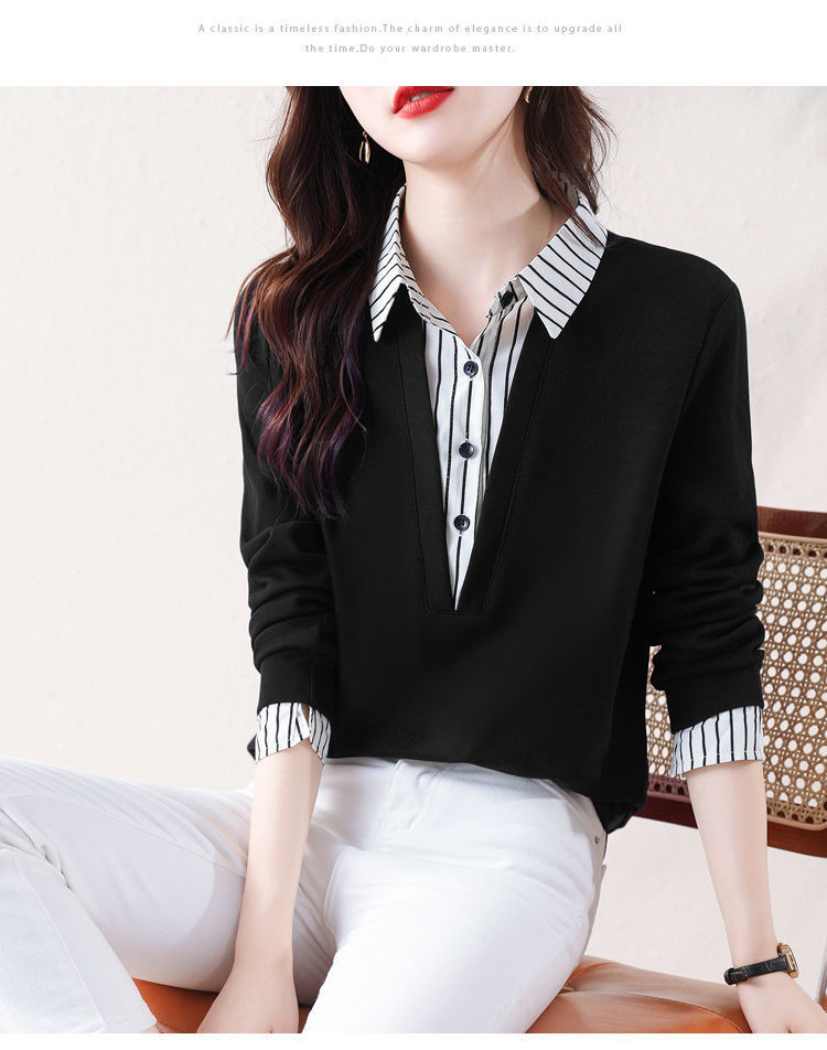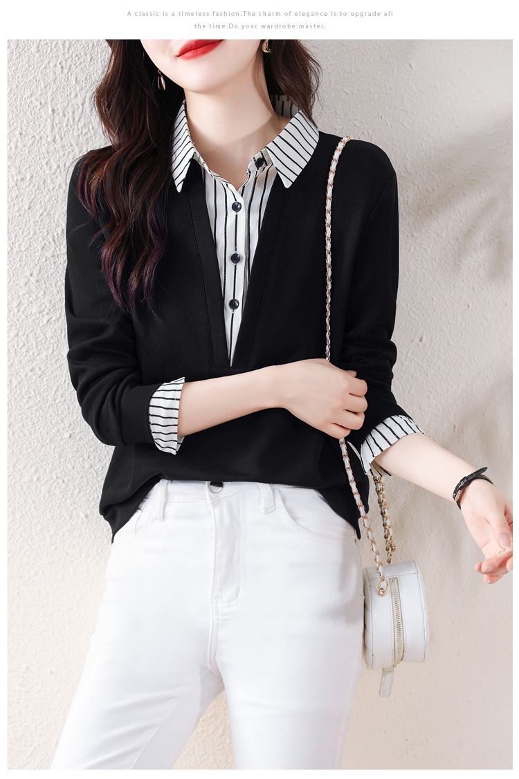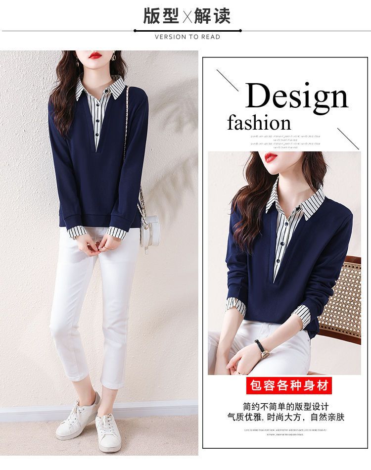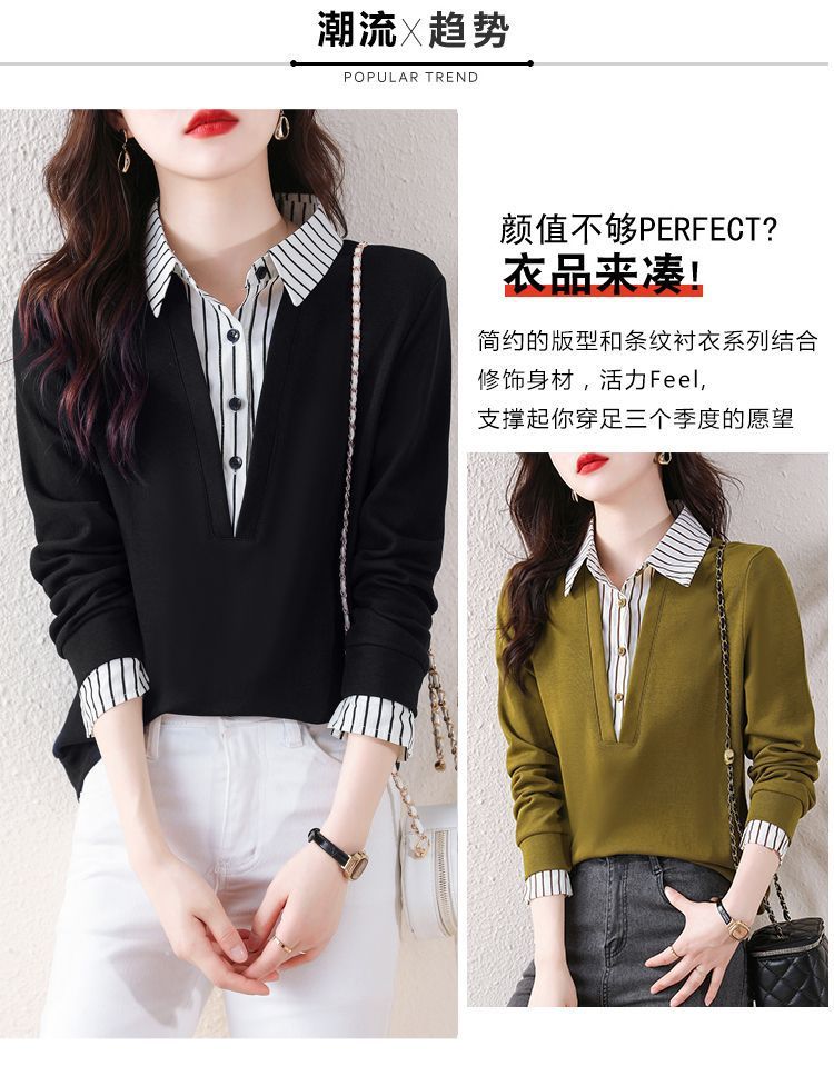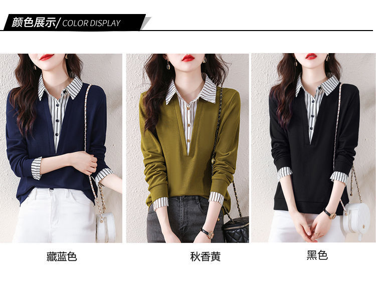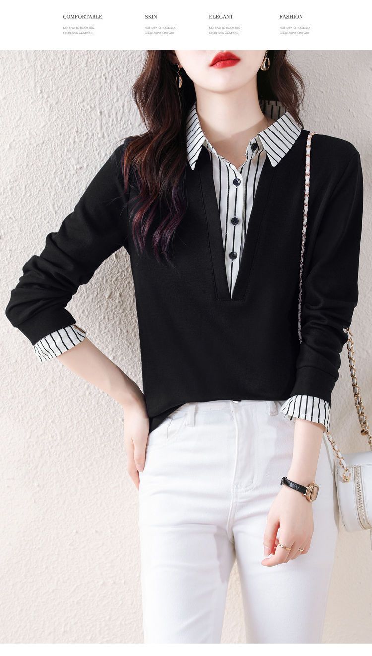 봄 일본과 한국의 새로운 긴팔 옷깃 가짜 투피스 여성용 최고 셔츠 캐주얼 슬리밍 플러스 사이즈 작은 셔츠