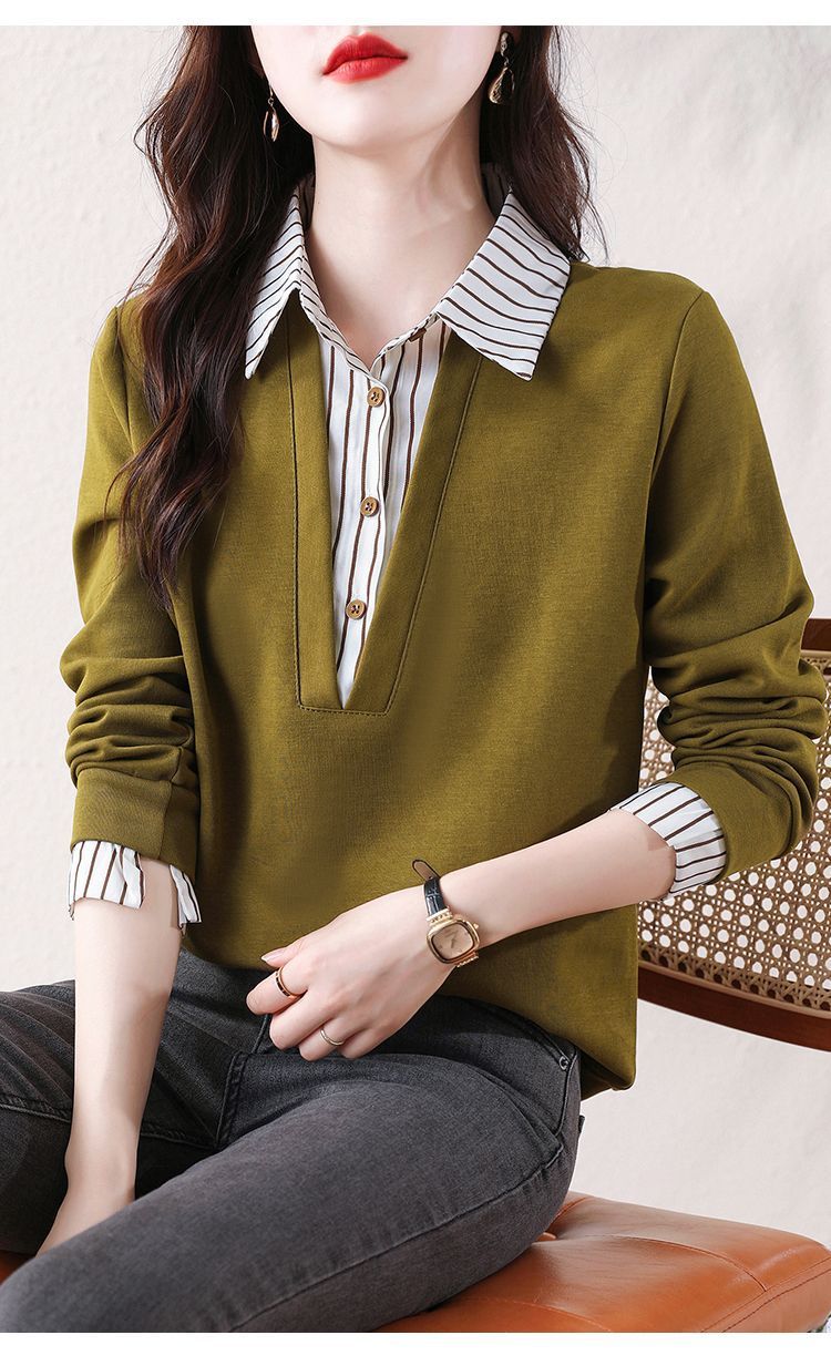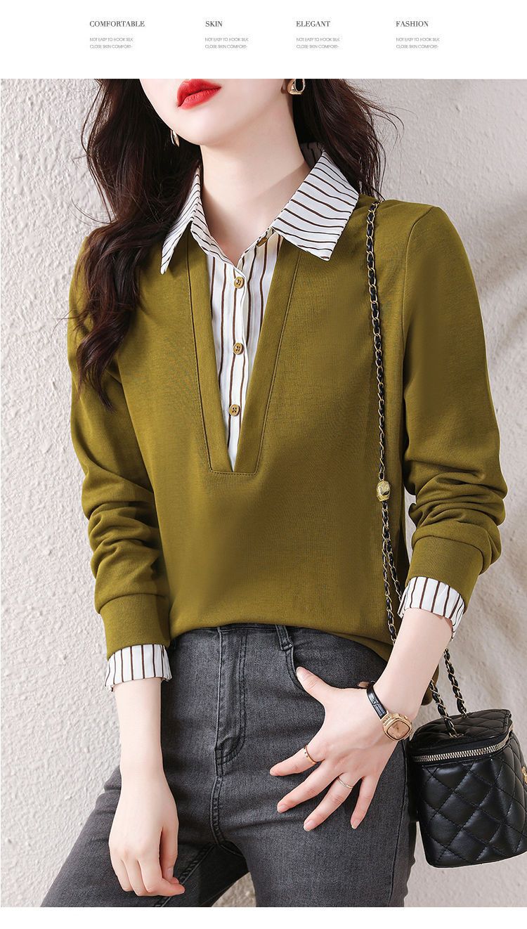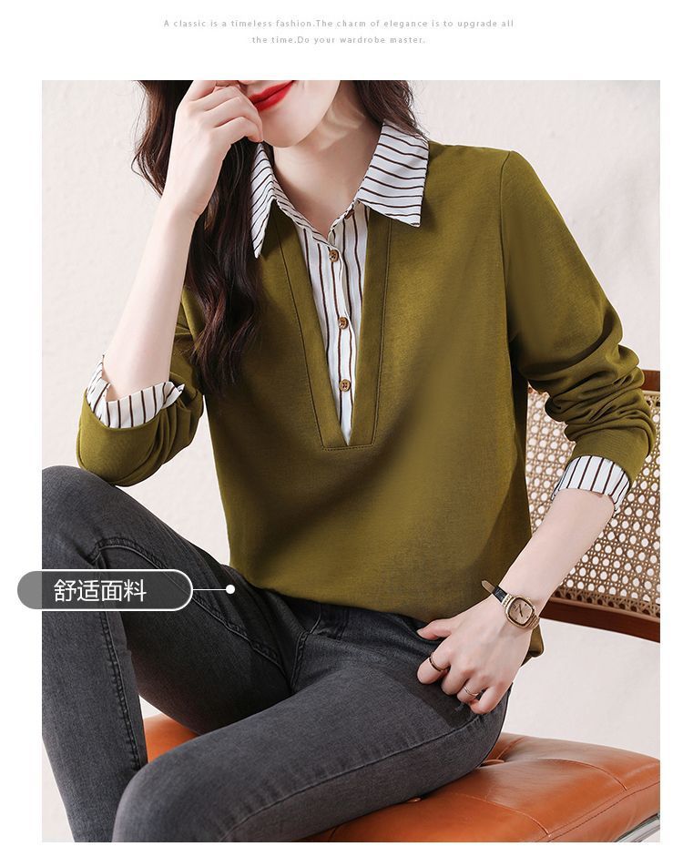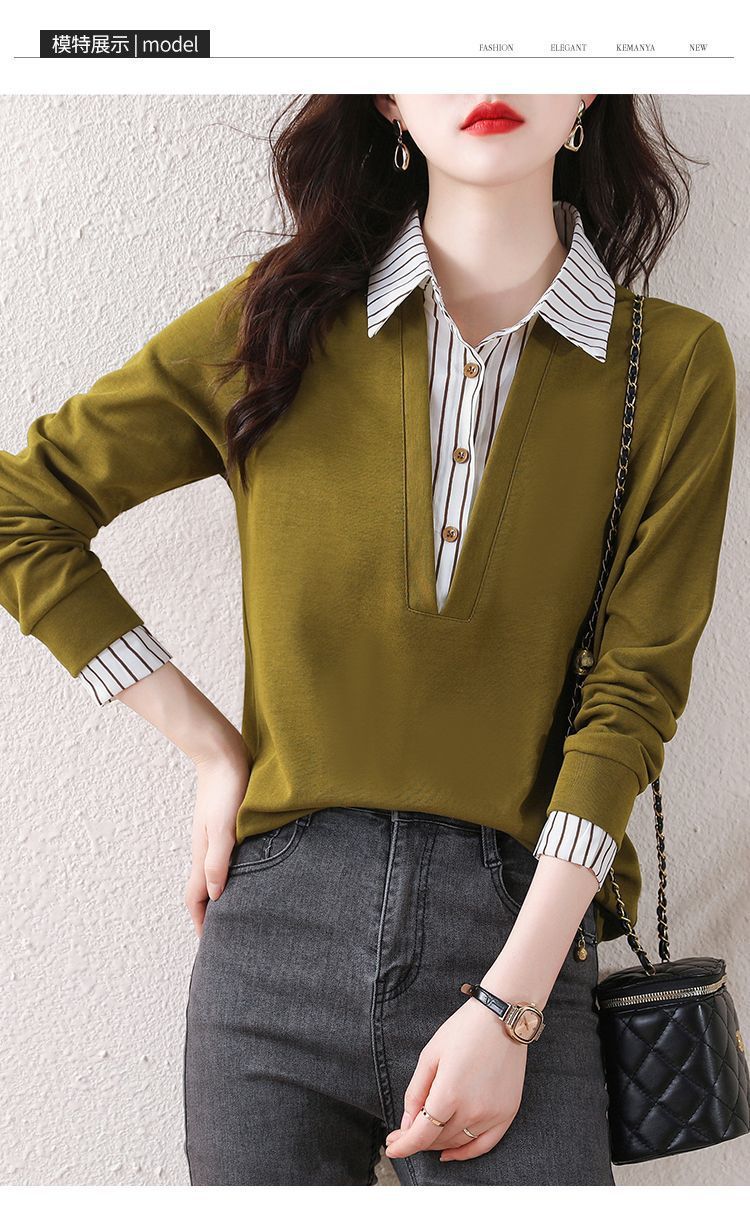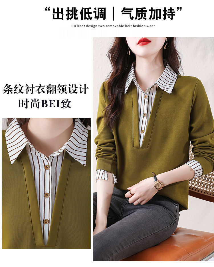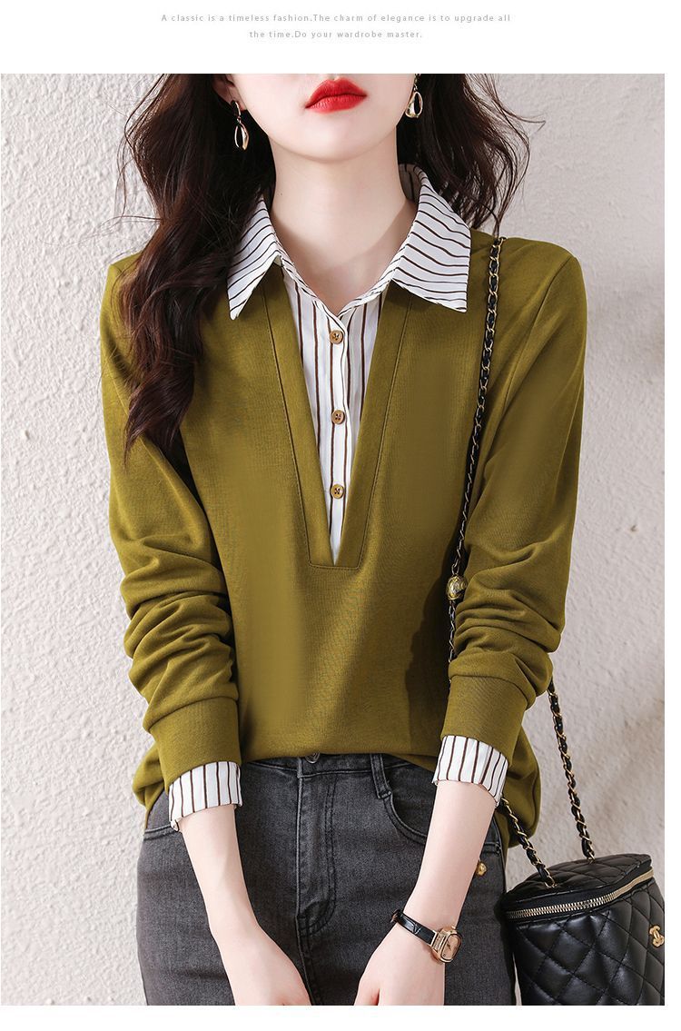 봄 일본과 한국의 새로운 긴팔 옷깃 가짜 투피스 여성용 최고 셔츠 캐주얼 슬리밍 플러스 사이즈 작은 셔츠