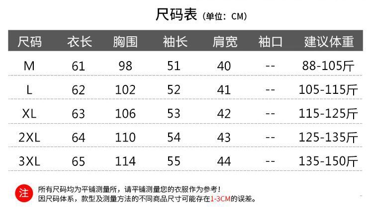 | 颜色 | 藏青色 【高品质】, 卡其色 【高品质】, 黑色 【高品质】 | 尺码 | M 建议80-100斤, L 建议100-115斤, XL 建议115-125斤, 2XL 建议125-135斤, 3XL 建议135-150斤 |