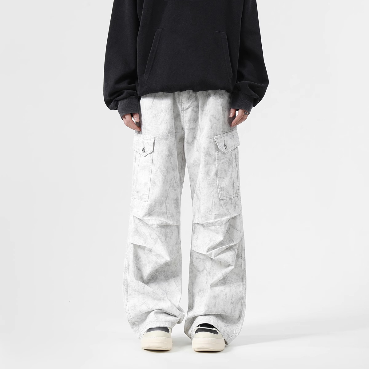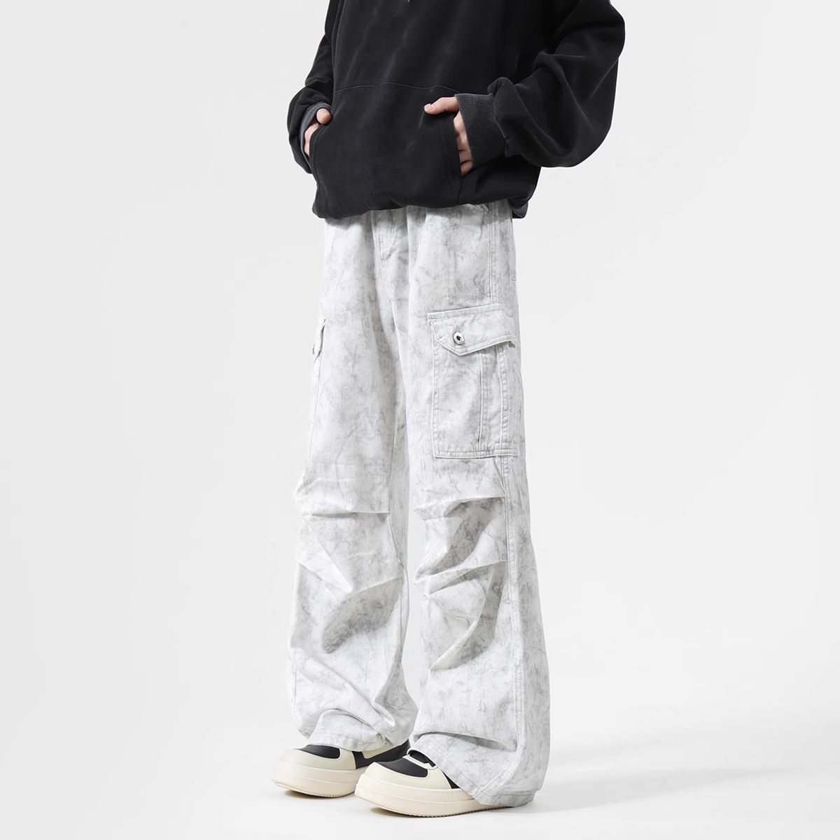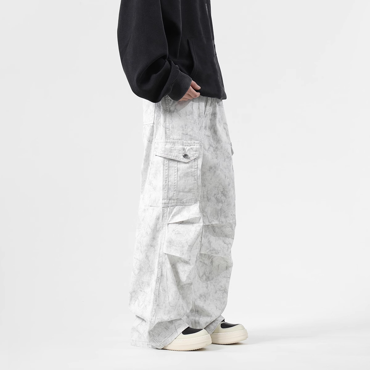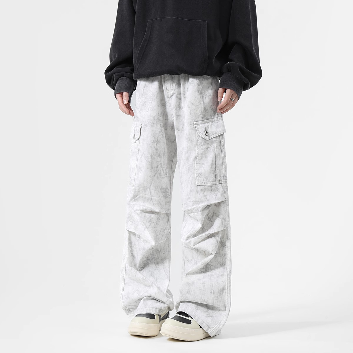 아메리칸 스타일 레트로 타이-염료 툴링 바지 남자 가을 하이 스트리트 플럼 잘 생긴 넓은 다리 낙하산 바지 트렌디 브랜드 주름 더러운 캐주얼 바지