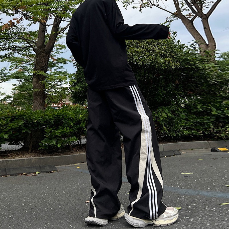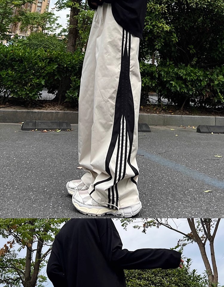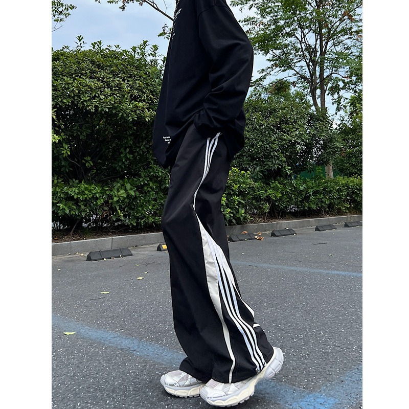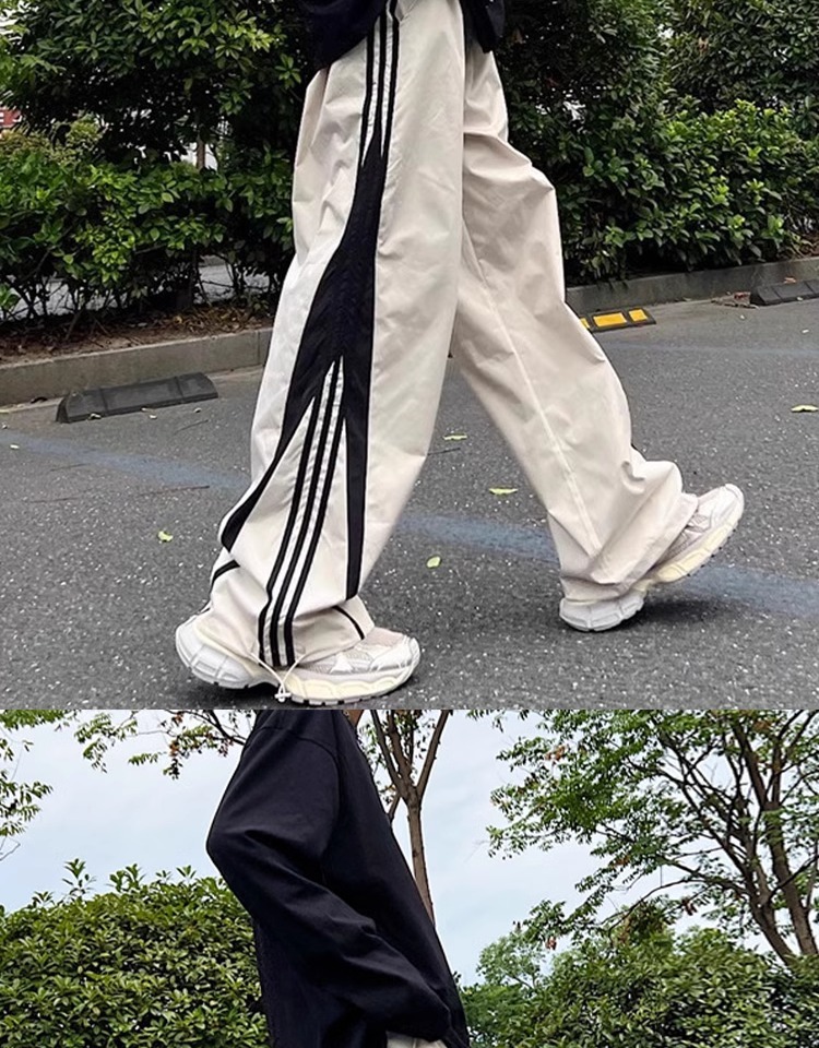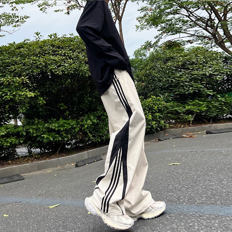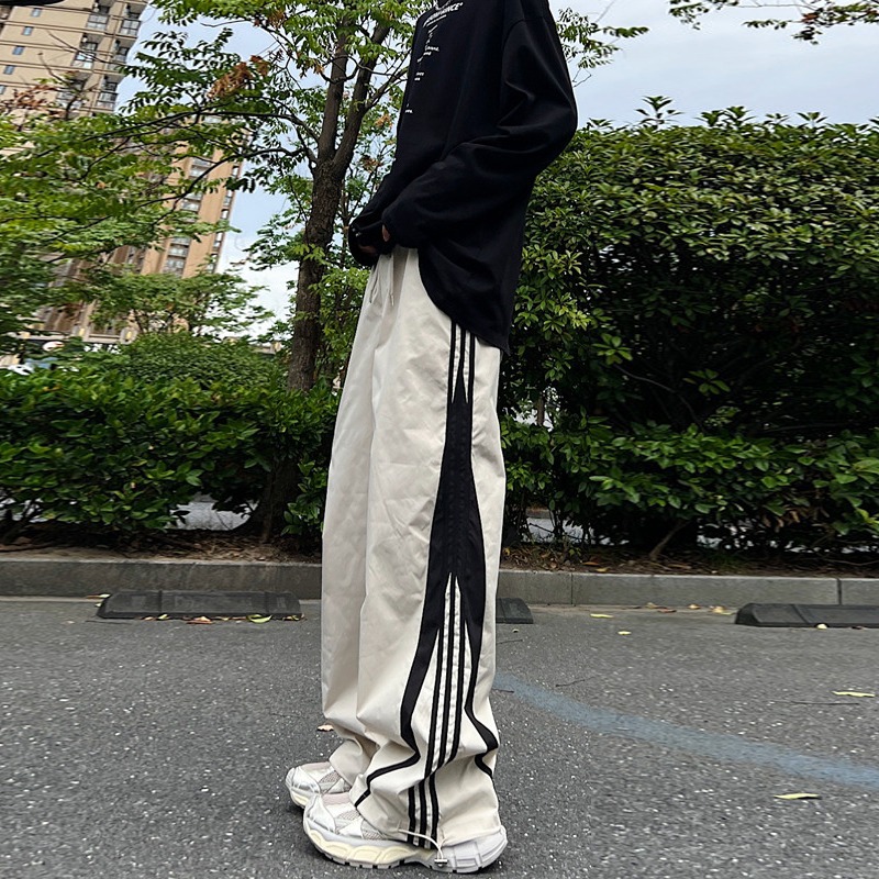 남자 봄과 가을 줄무늬 캐주얼 낙하산 바지 남자 아메리칸 스타일 하이 스트리트 느슨한 와이드 레그 스트레이트 레그 스포츠 충전 툴링 바지