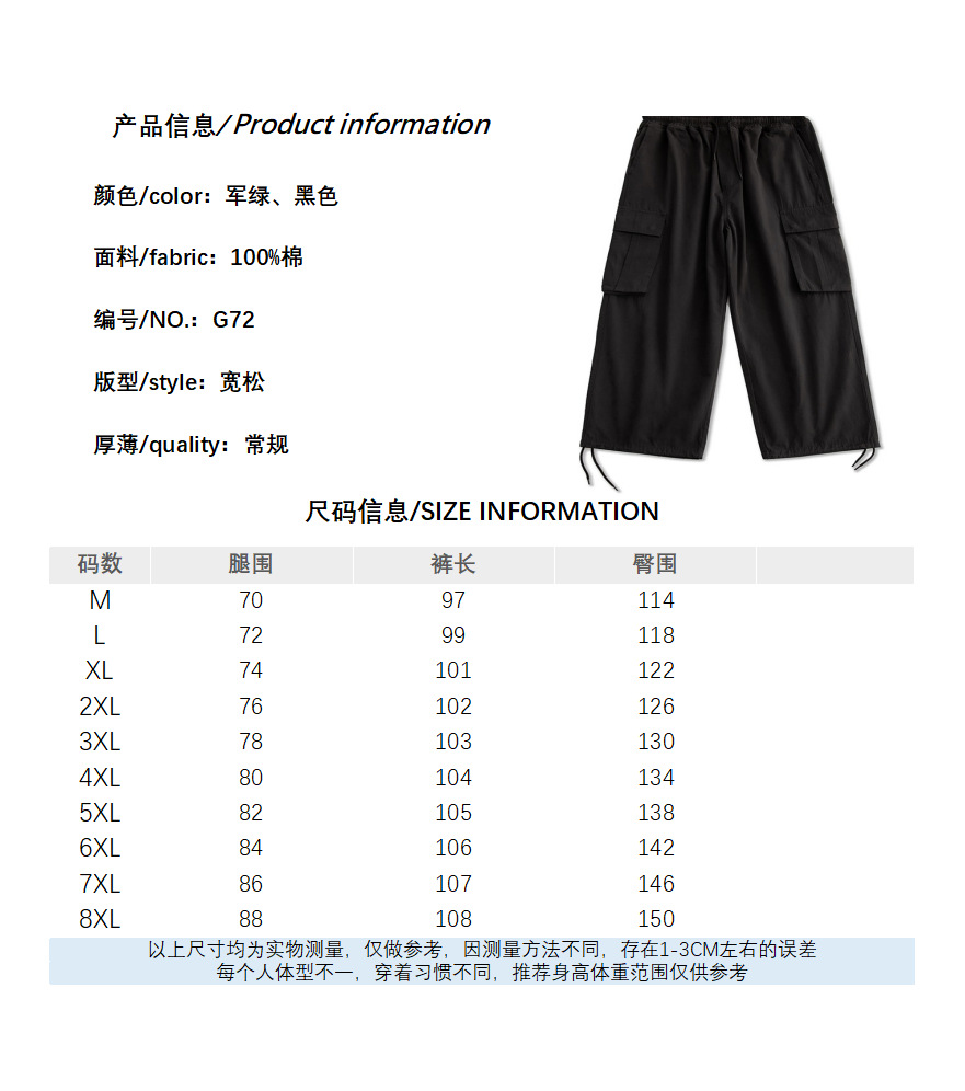 | 颜色 | 军绿色, 黑色 | 尺码 | M, L, XL, 2XL, 3XL, 4XL, 5XL, 6XL, 7XL, 8XL |