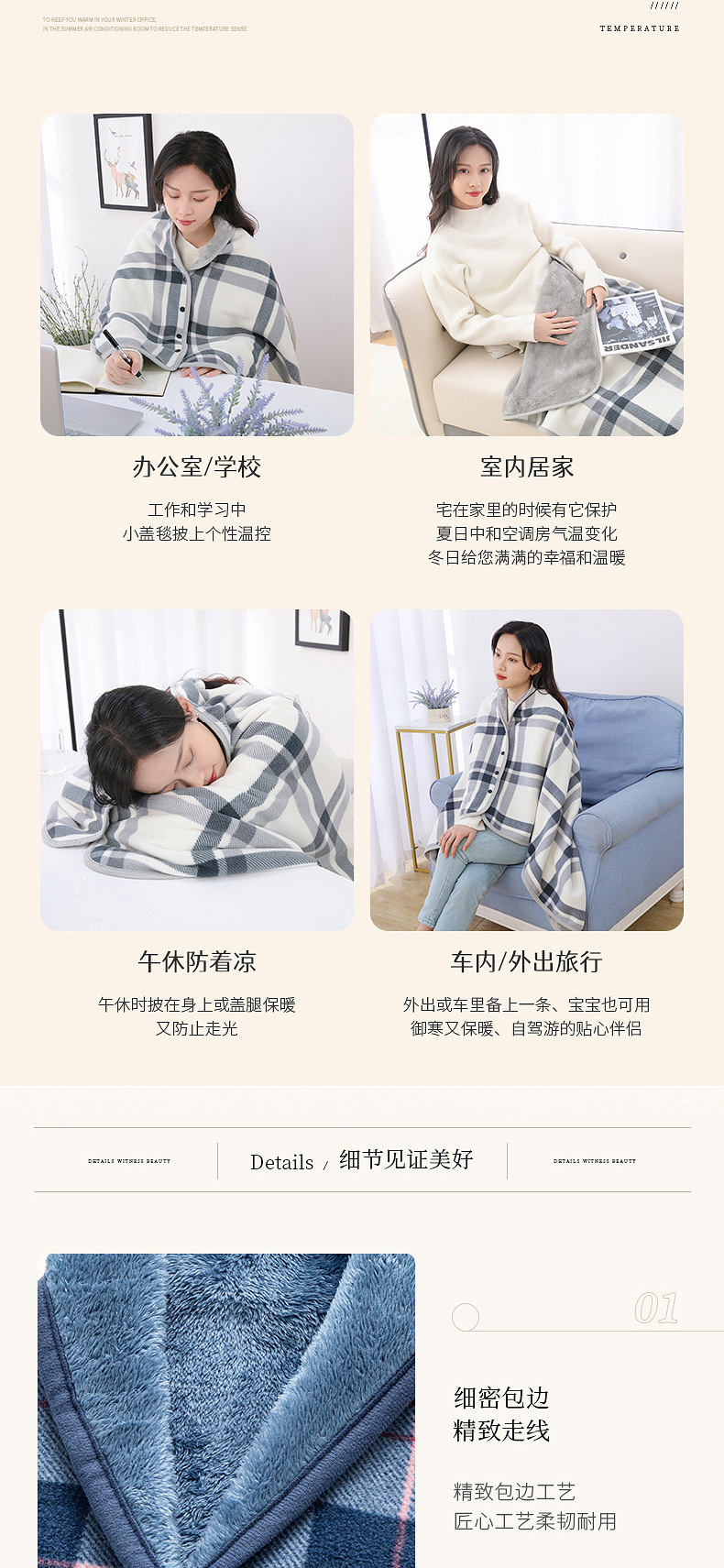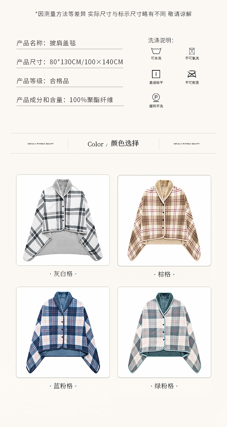 | 毯类型 | 法兰绒毯 | 颜色 | 灰白格, 蓝格子, 绿粉格, 棕格 |