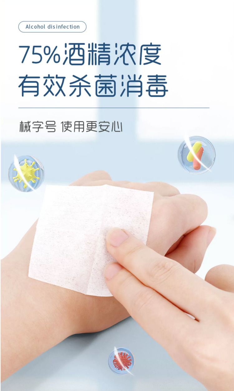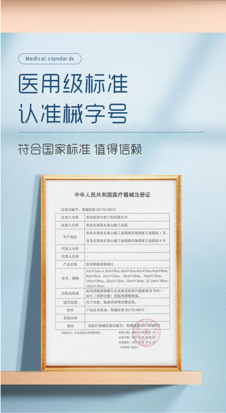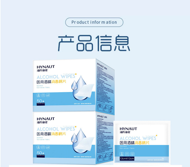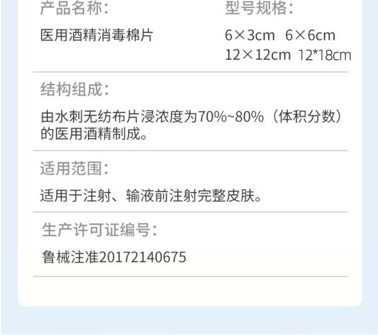 | 规格 | 酒精棉片6*3cm*1盒(50片), 酒精棉片6cm*6cm*1盒(100片), 酒精棉片12*12cm*1盒(50片) | ||