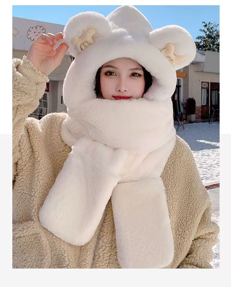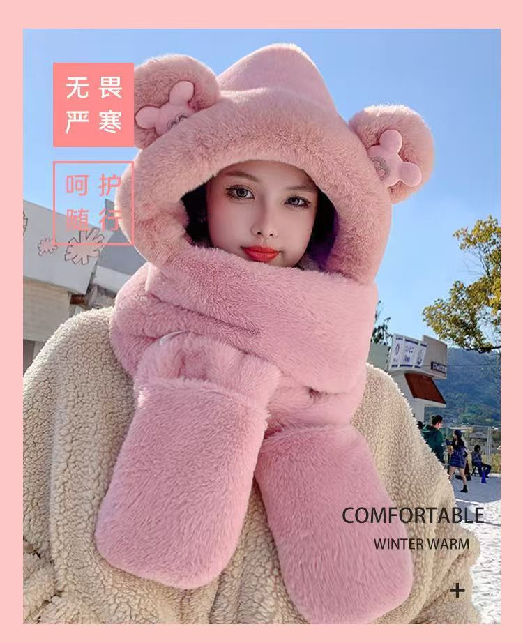 곰 귀 스카프와 모자 일체형 여성 가을 겨울 다용도 플러시 스카프와 장갑 3종 세트 귀엽고 두껍고 따뜻합니다.