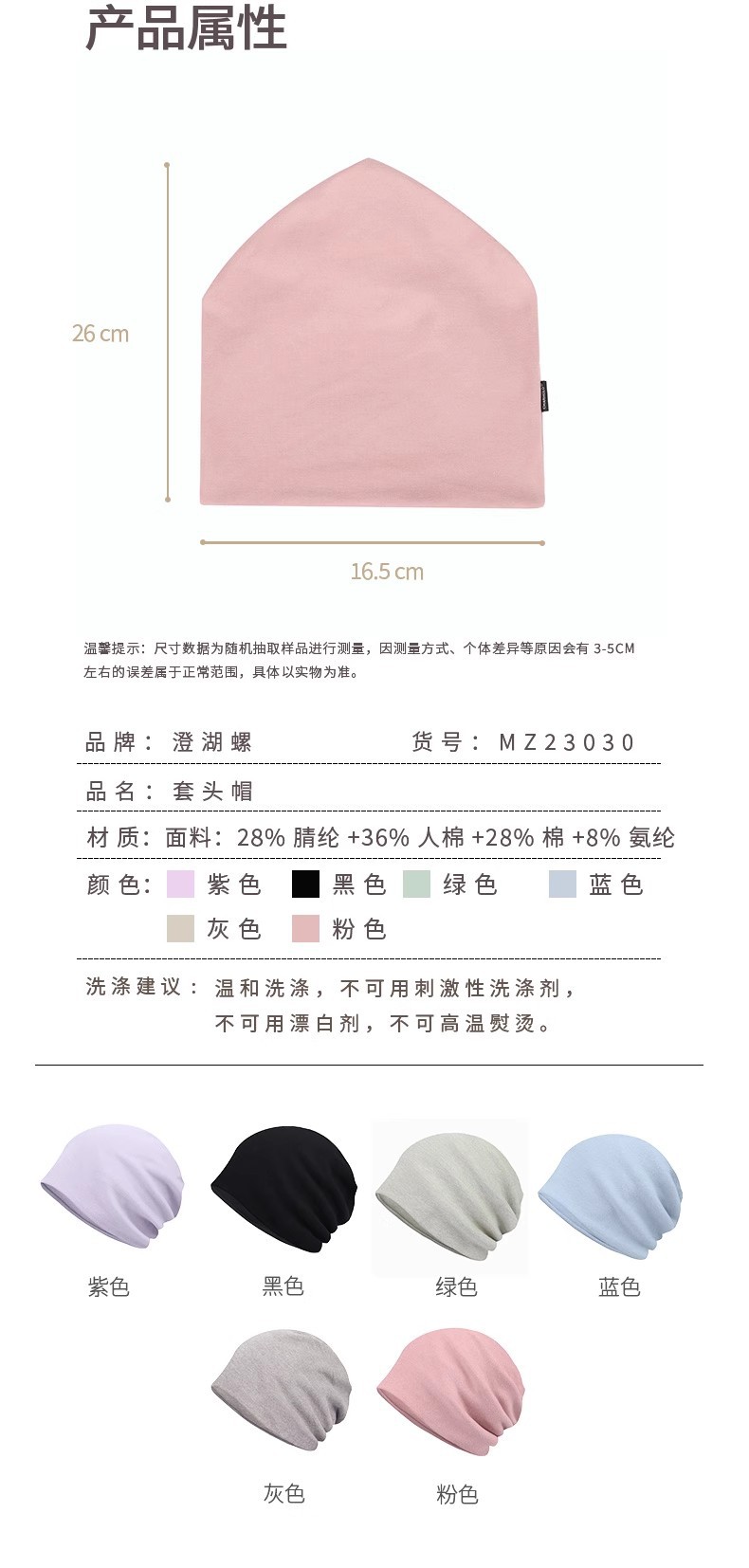 | 帽檐款式 | 无檐 | 颜色 | 黑色, 灰色, 粉色, 蓝色, 绿色, 紫色 |