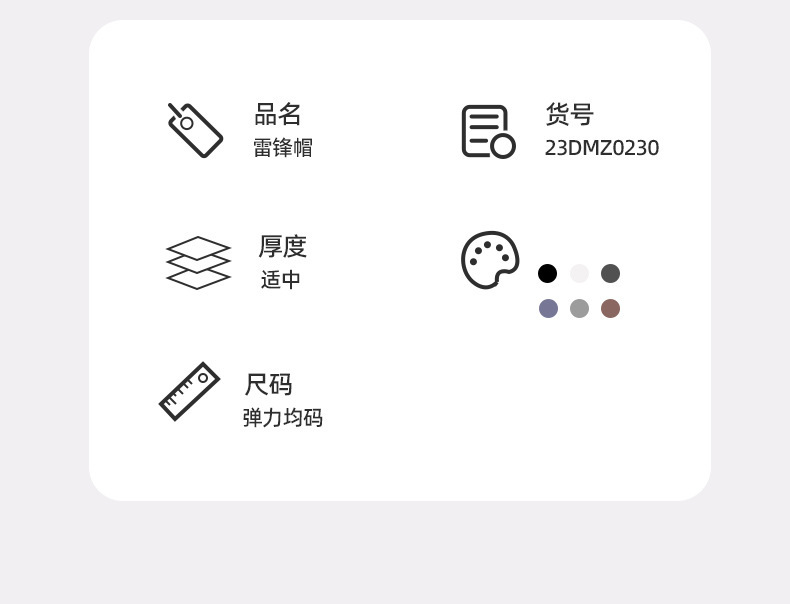 | 帽檐款式 | 无檐 | 颜色 | 藏青, 黑色, 浅灰, 卡其色, 米白色, 深灰 |