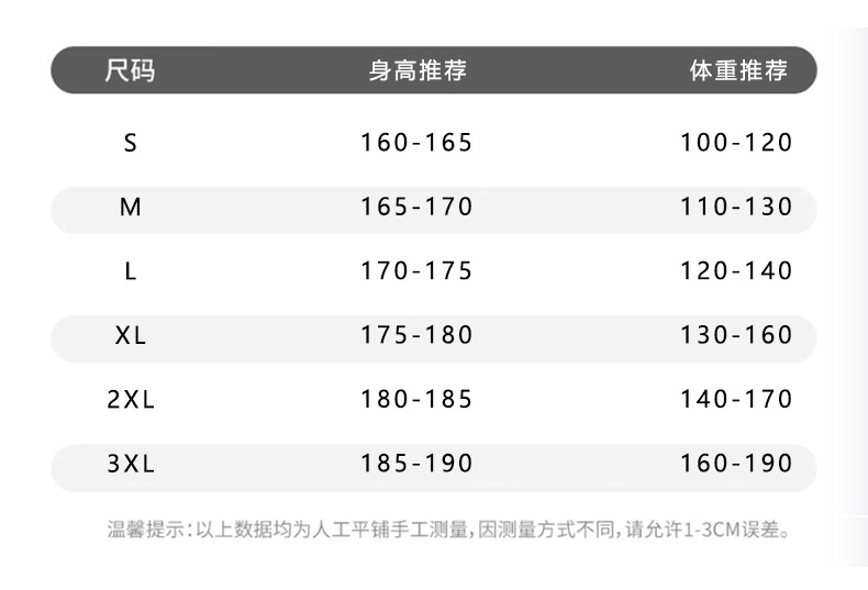 | 尺码 | S(建议100-120斤), M(建议110-130斤), L(建议120-140斤), XL(建议130-160斤), 2XL(建议140-170斤), 3XL(建议160-190斤) | 是否跨境出口专供货源 | 否 |