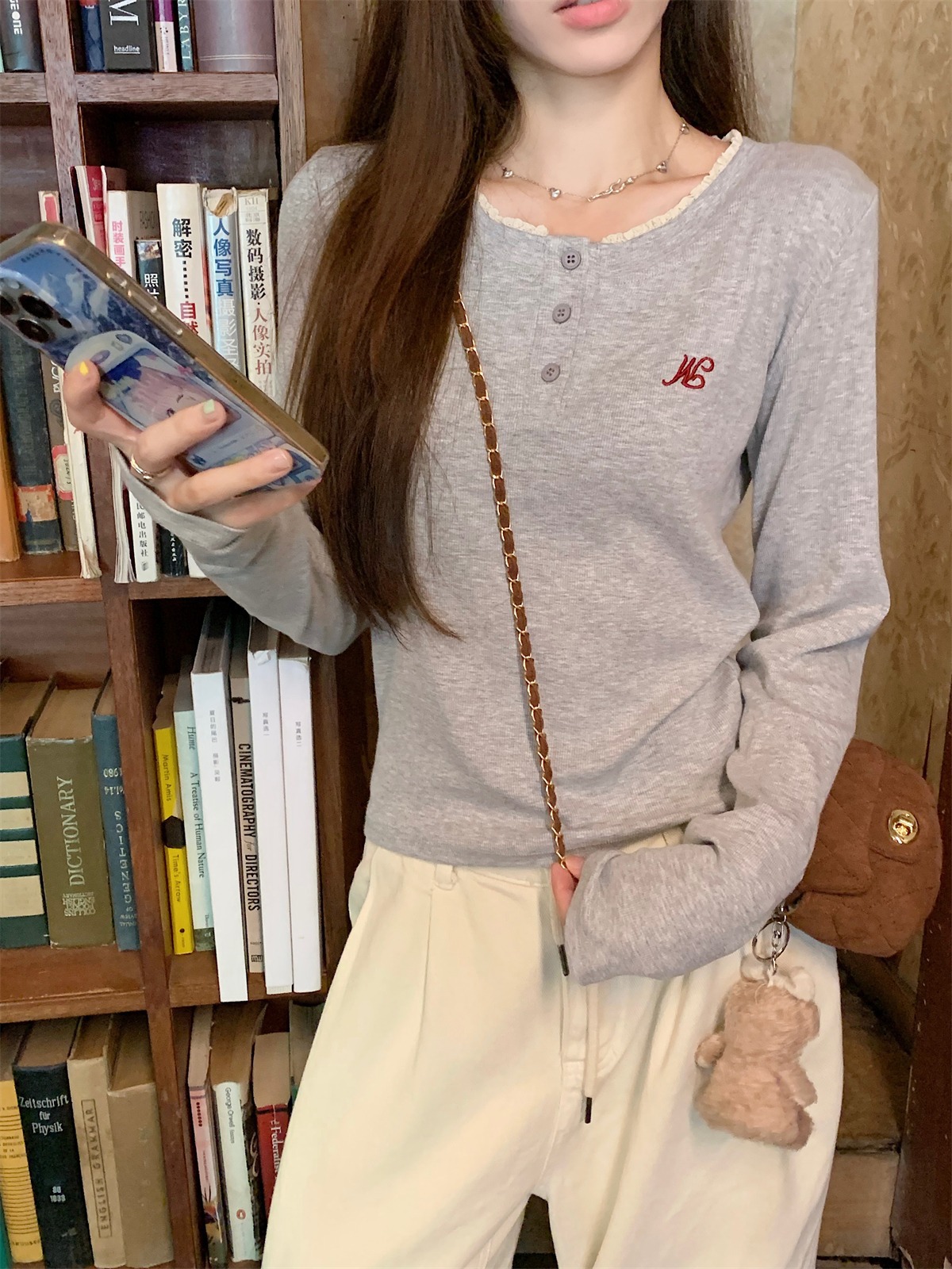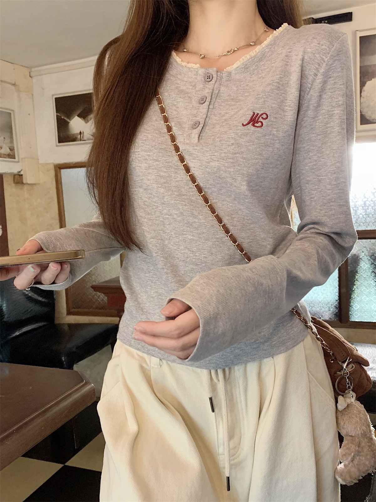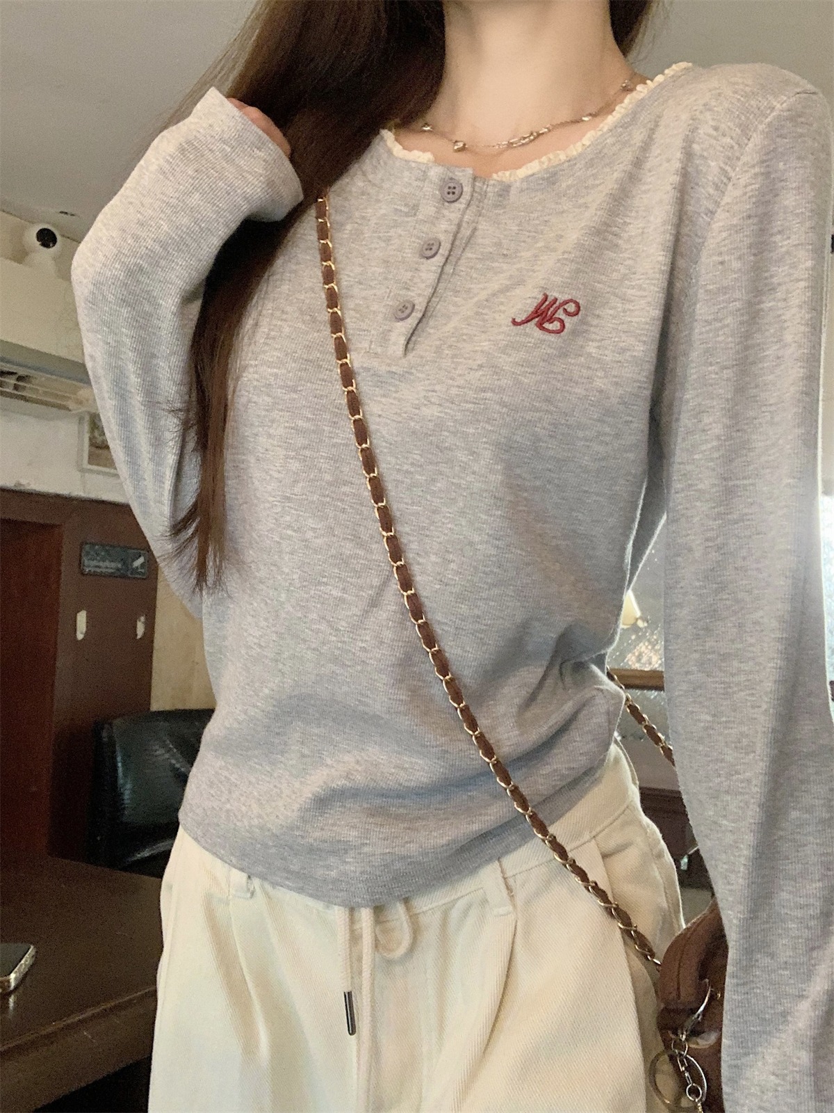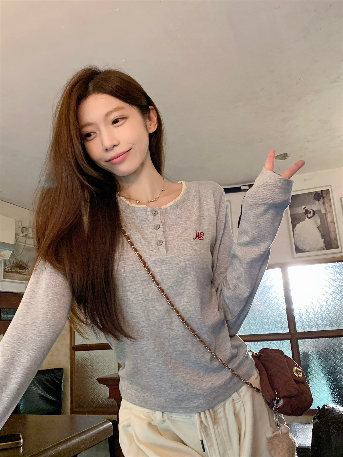 MR [스레드 벨벳 280g 오리지널 연습] 레이스 라운드 넥 긴팔 티셔츠 여성용 가을 바지 셔츠