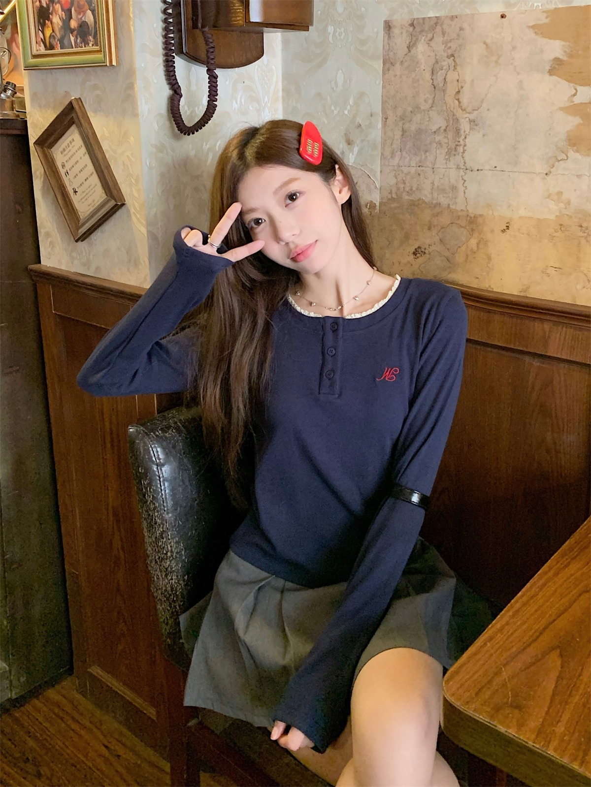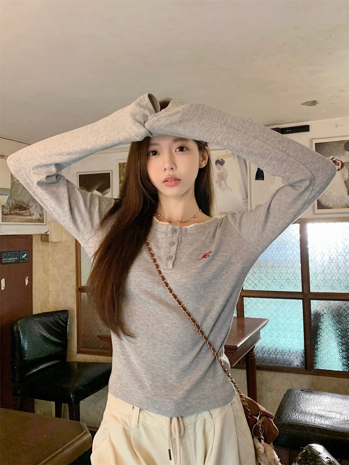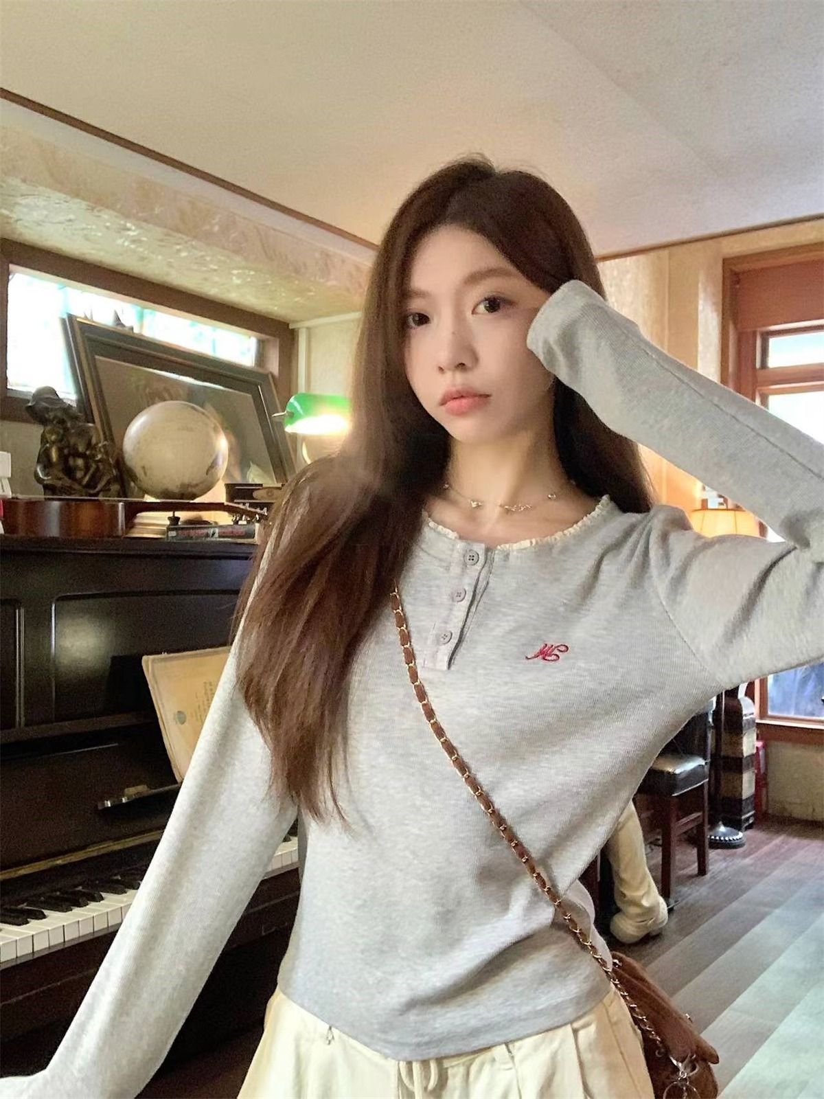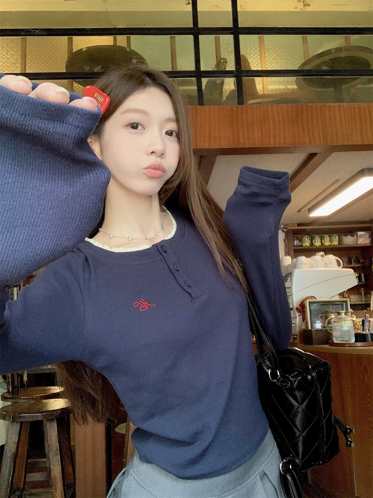 MR [스레드 벨벳 280g 오리지널 연습] 레이스 라운드 넥 긴팔 티셔츠 여성용 가을 바지 셔츠