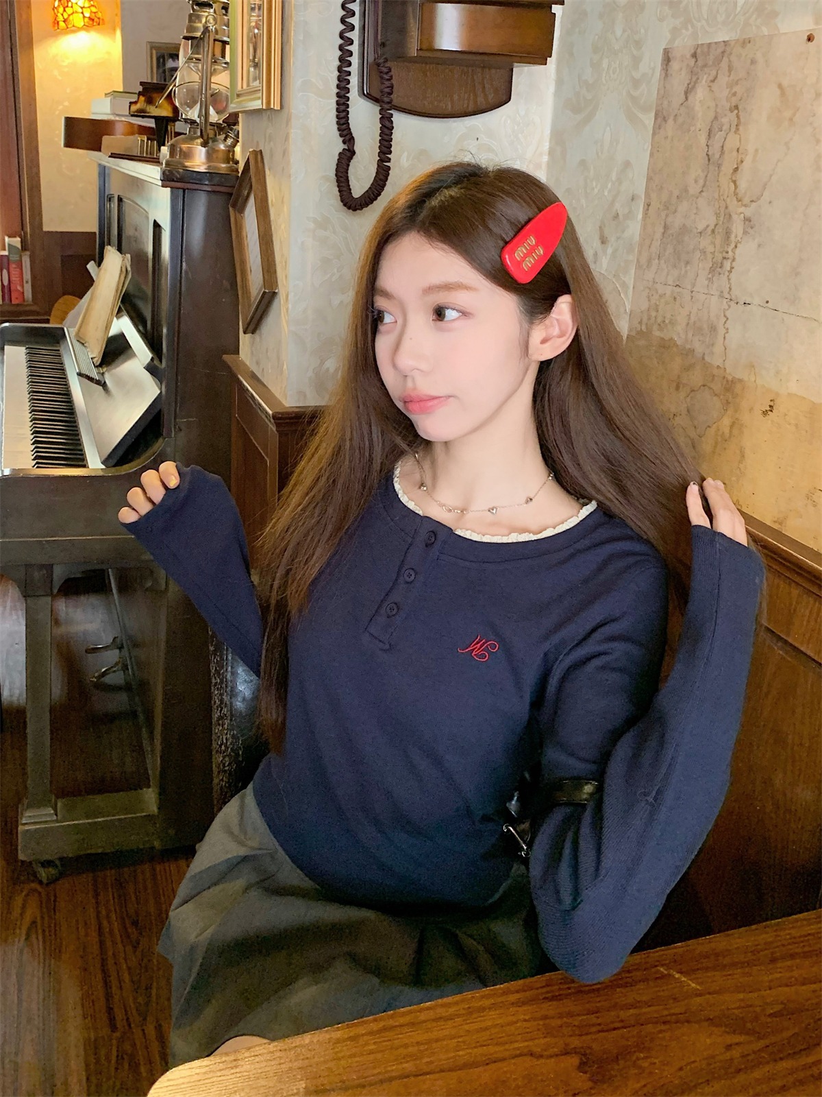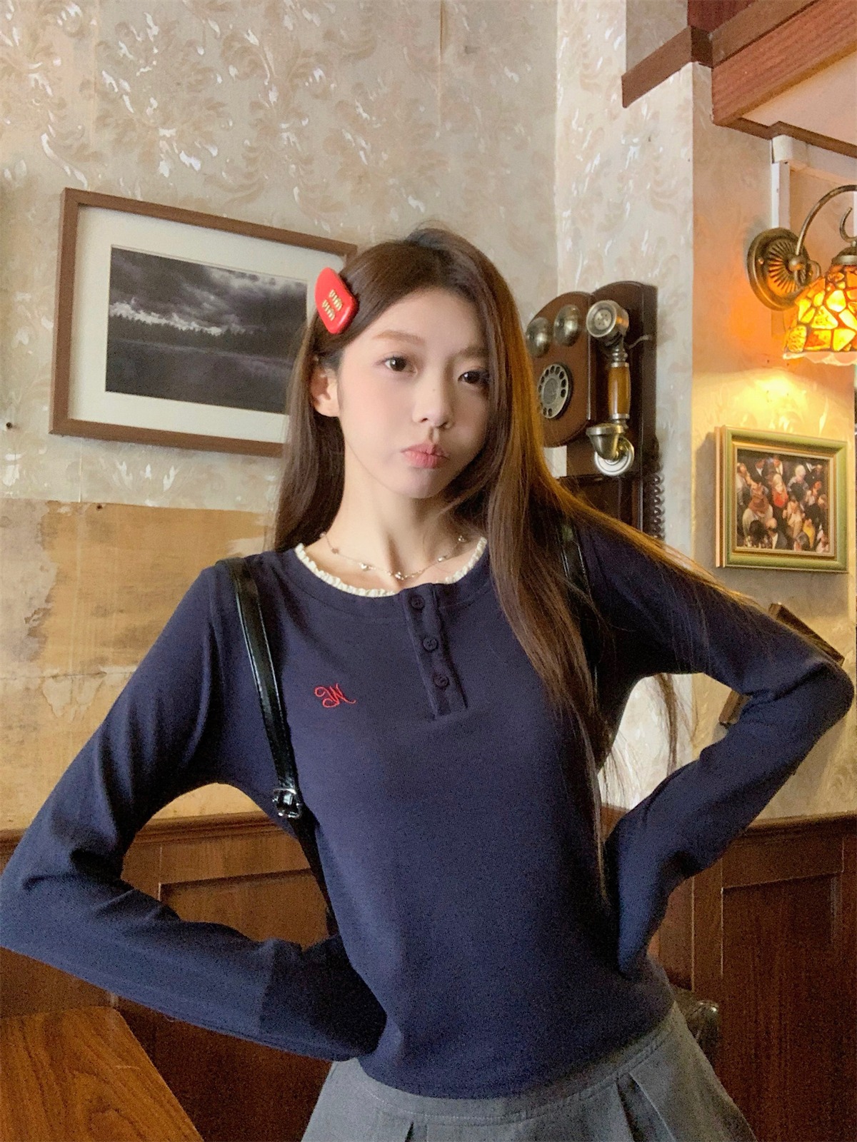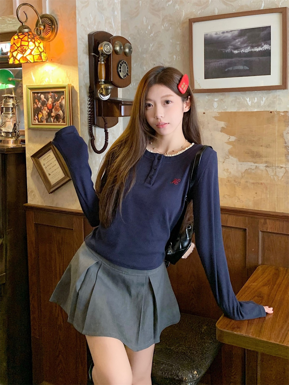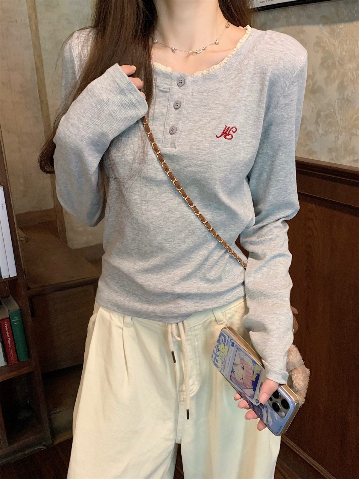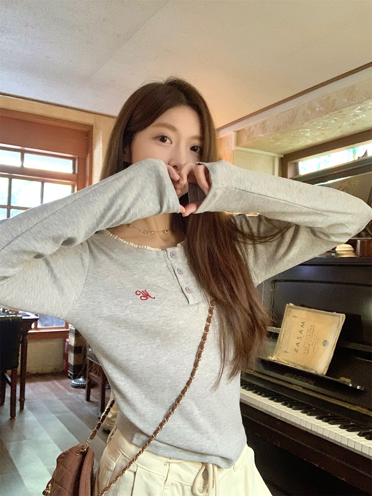 MR [스레드 벨벳 280g 오리지널 연습] 레이스 라운드 넥 긴팔 티셔츠 여성용 가을 바지 셔츠