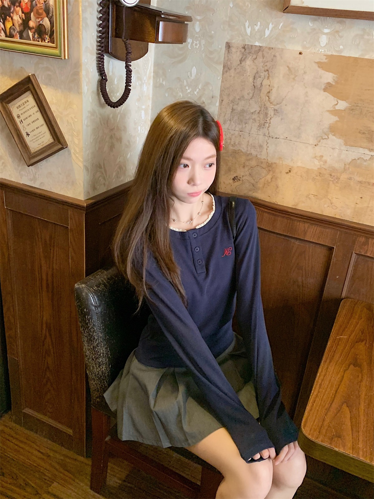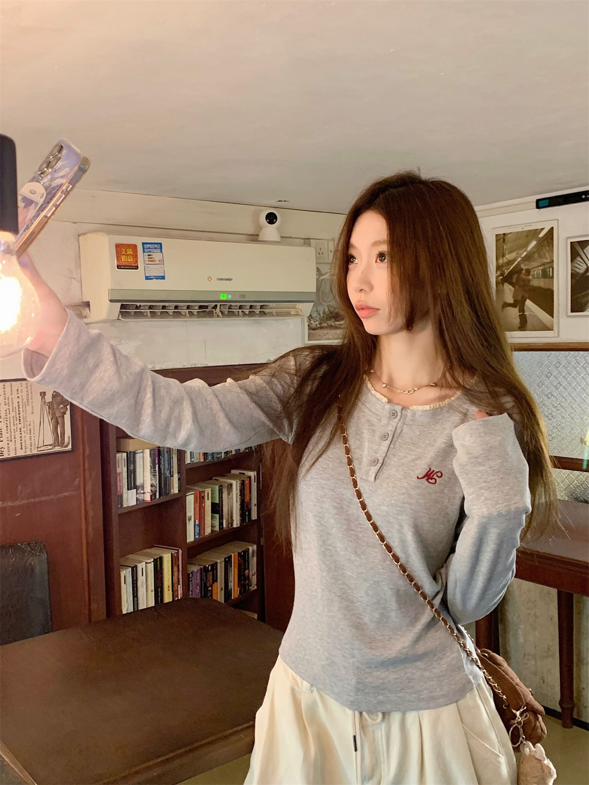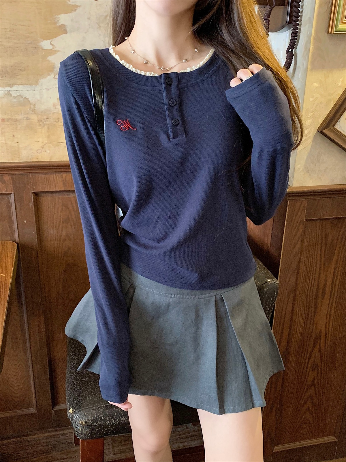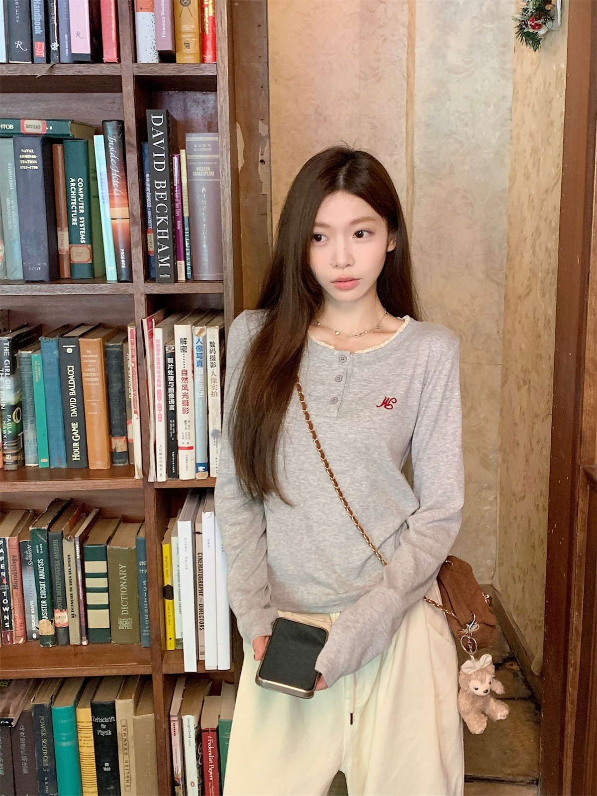 MR [스레드 벨벳 280g 오리지널 연습] 레이스 라운드 넥 긴팔 티셔츠 여성용 가을 바지 셔츠