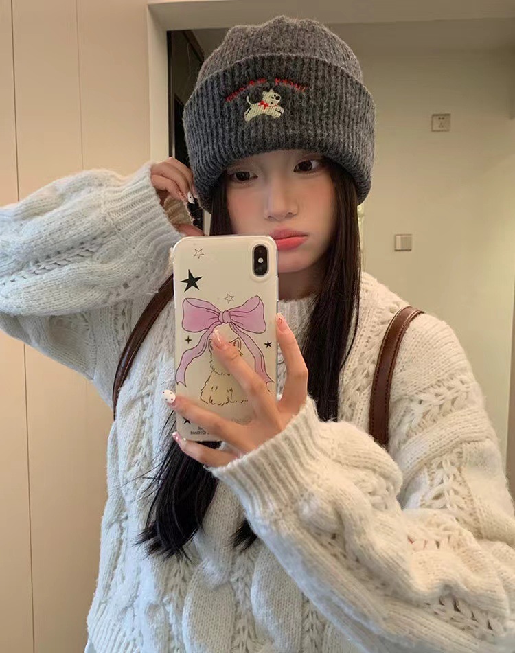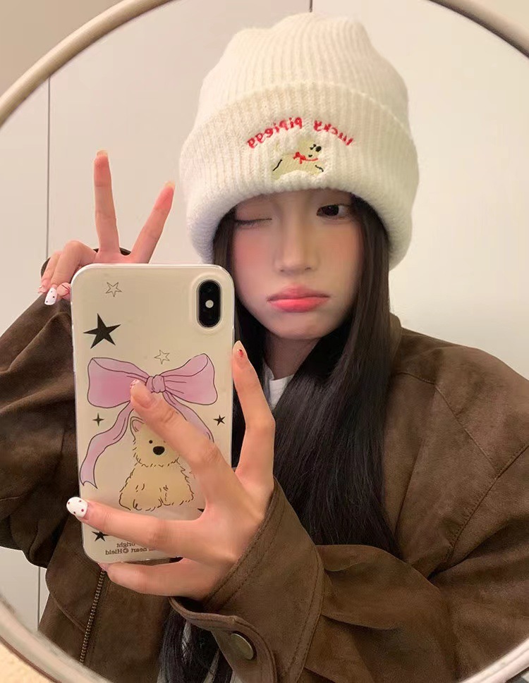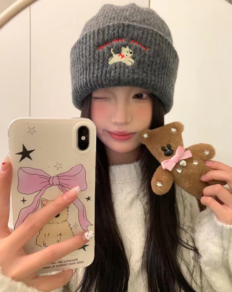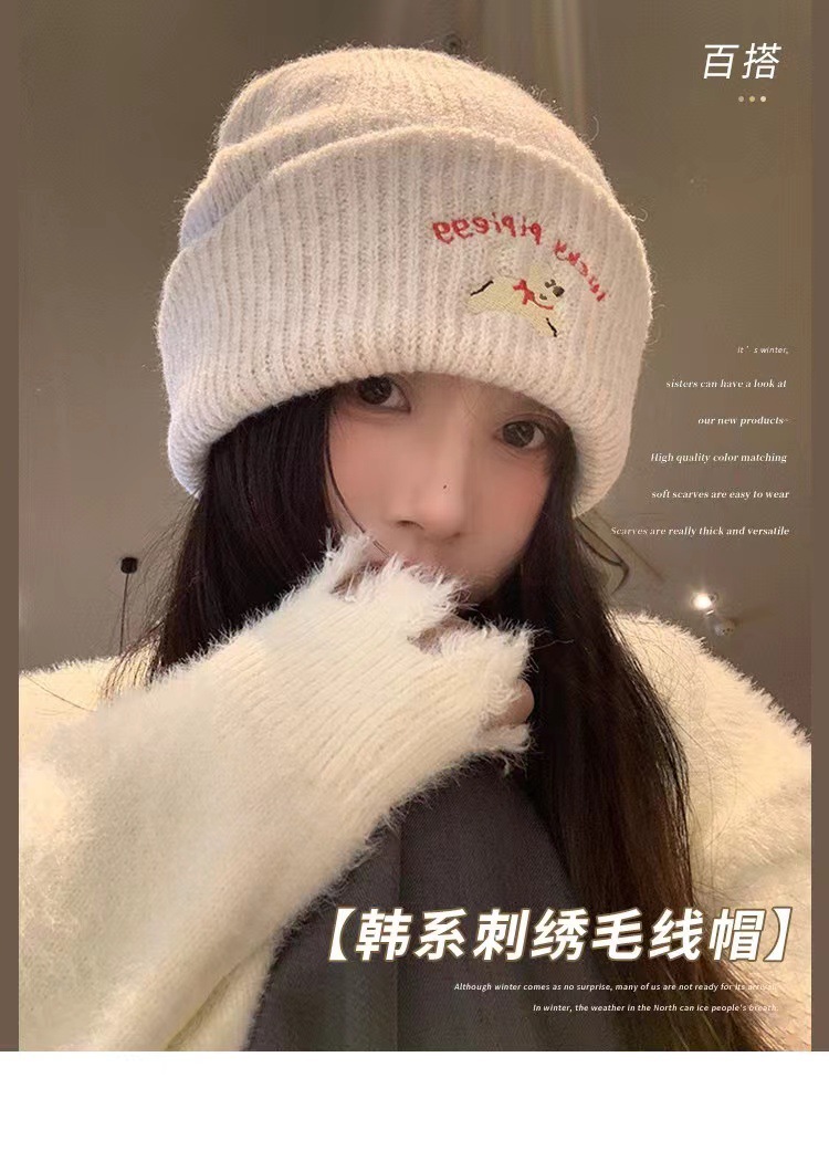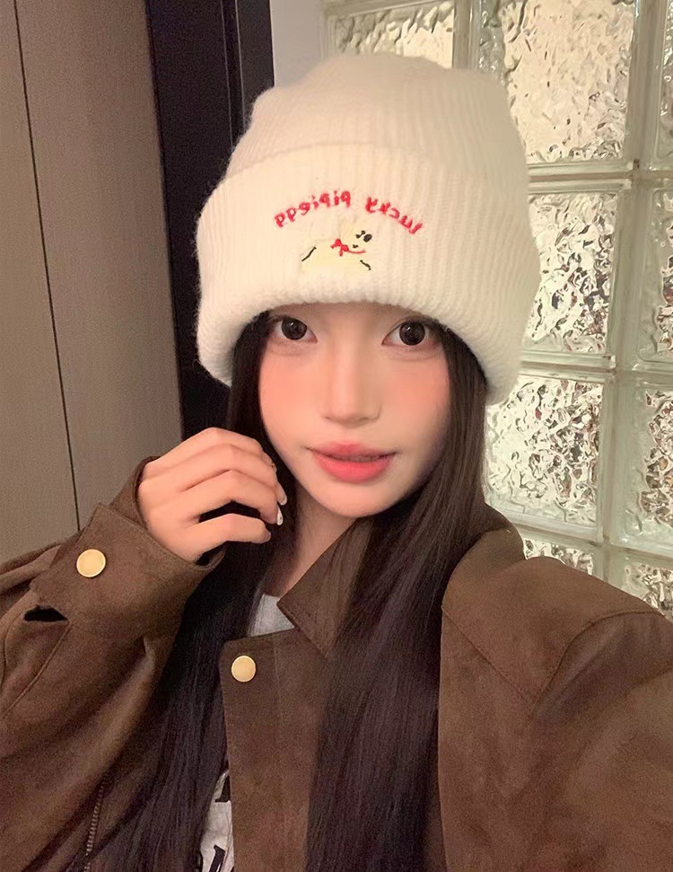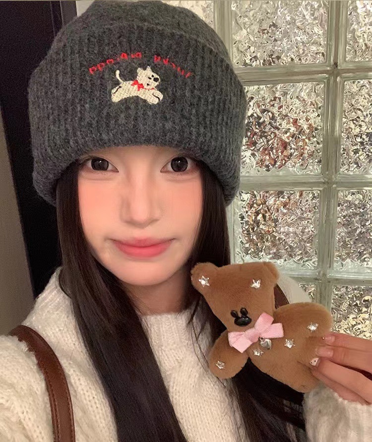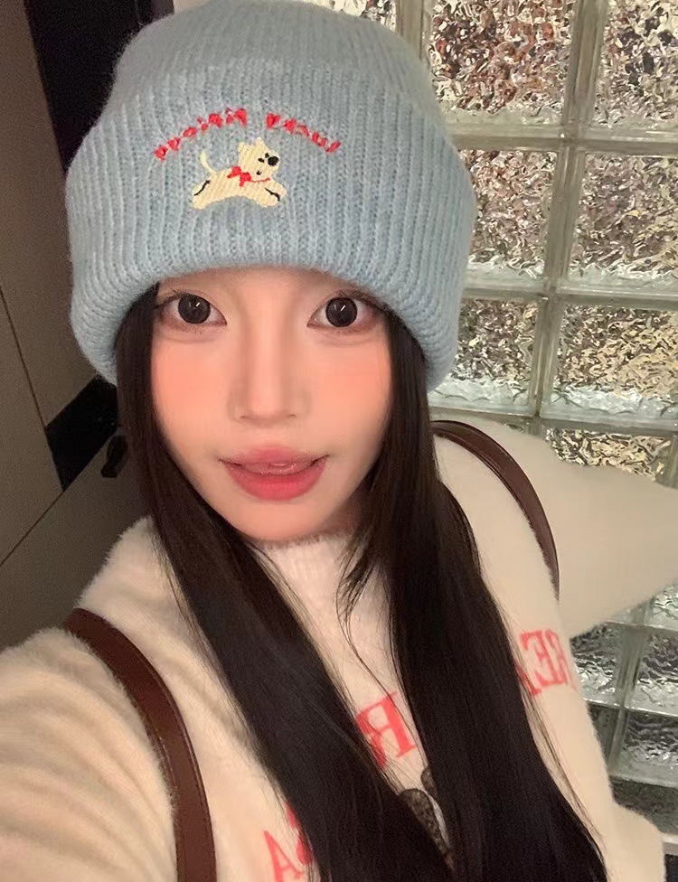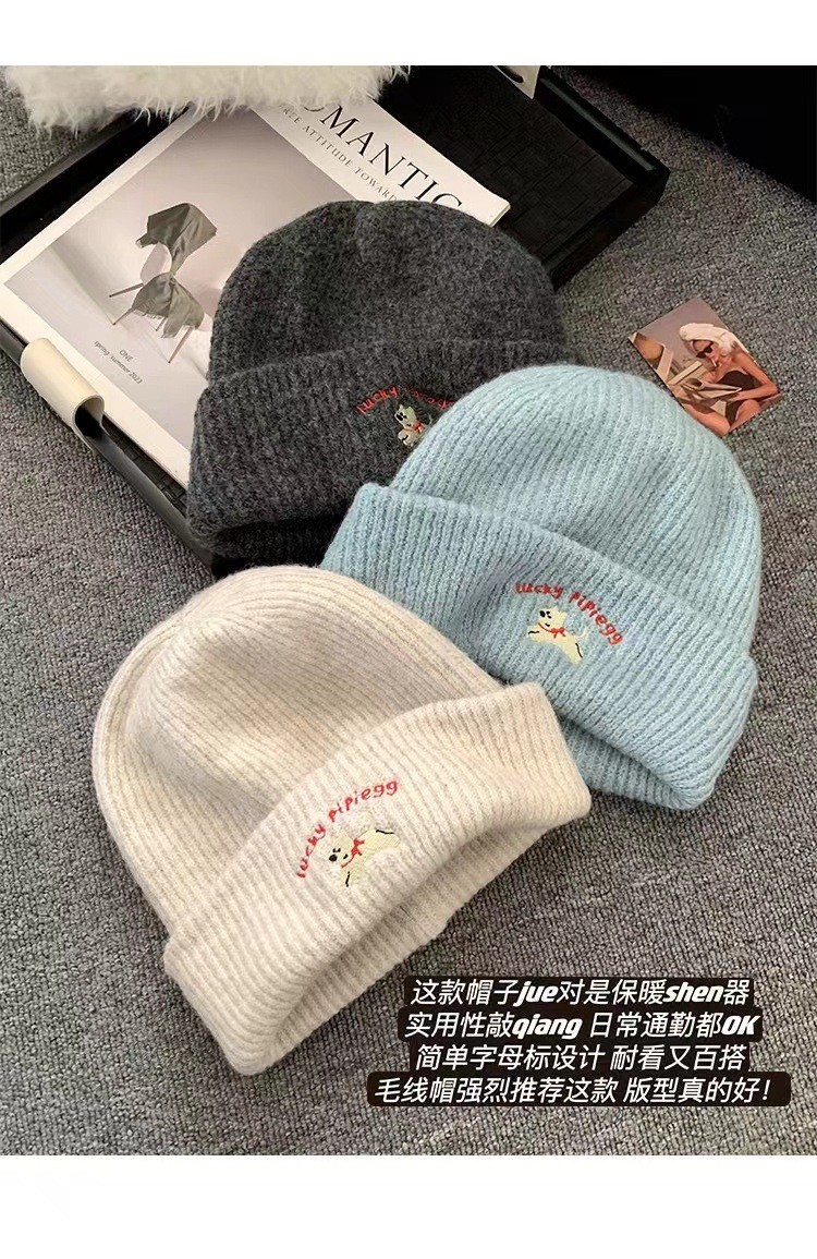 귀여운 강아지 자수 니트 모자 여성용 한국식 가을과 겨울 따뜻한 얼굴 작은 귀 보호 양모 모자 남성용 올 매치 콜드 햇