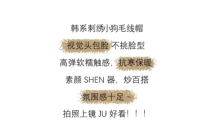 | 秋冬款毛线帽 | 韩系可爱小狗刺绣针织帽女生秋冬保暖显脸小护耳毛线帽百搭冷帽男 | 处理工艺 | 机绣 |