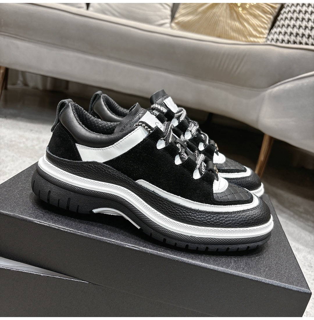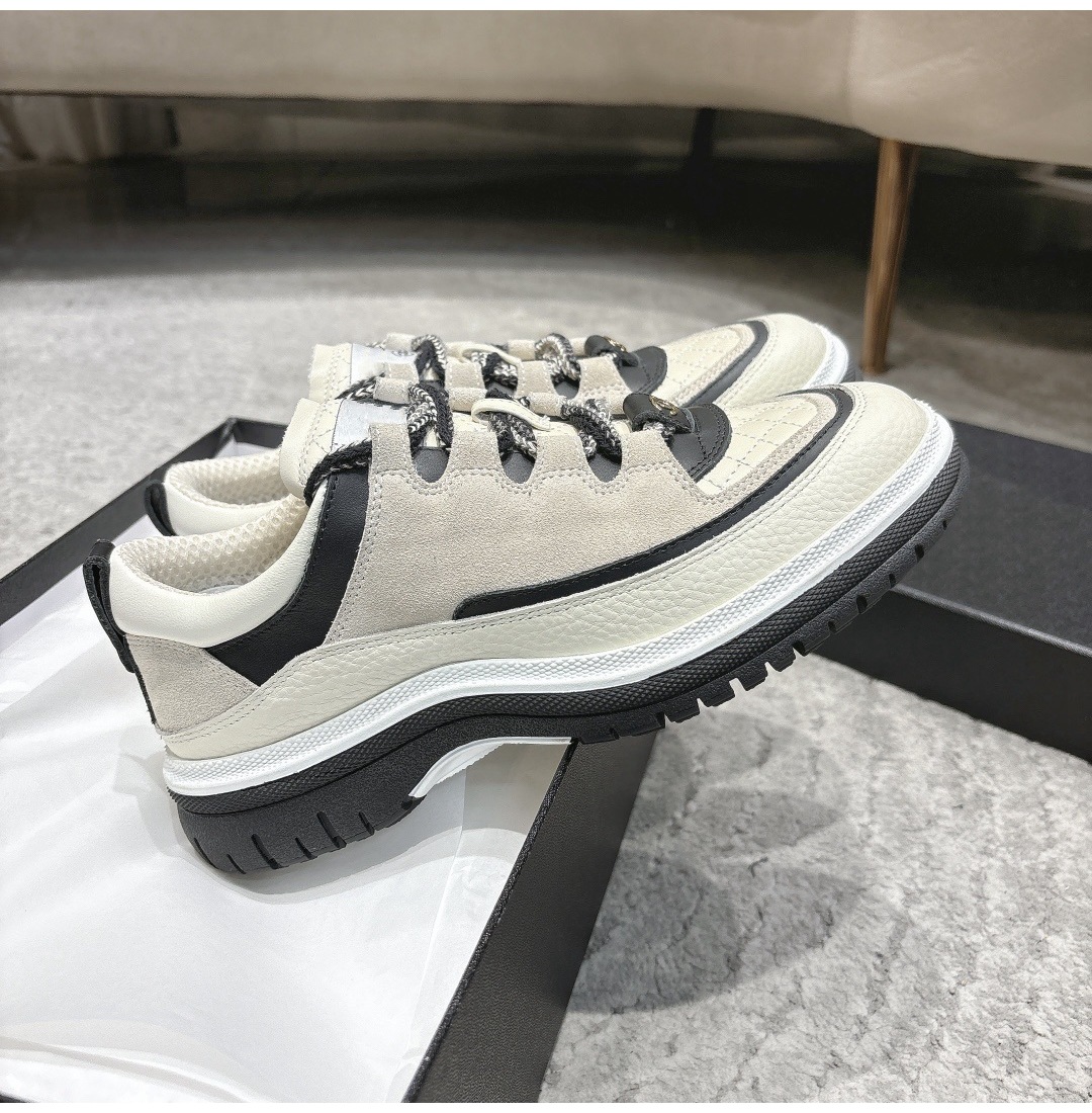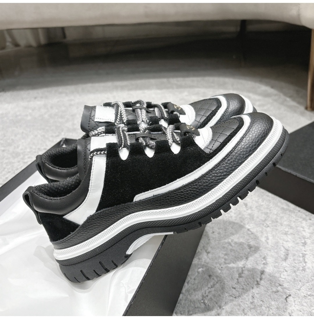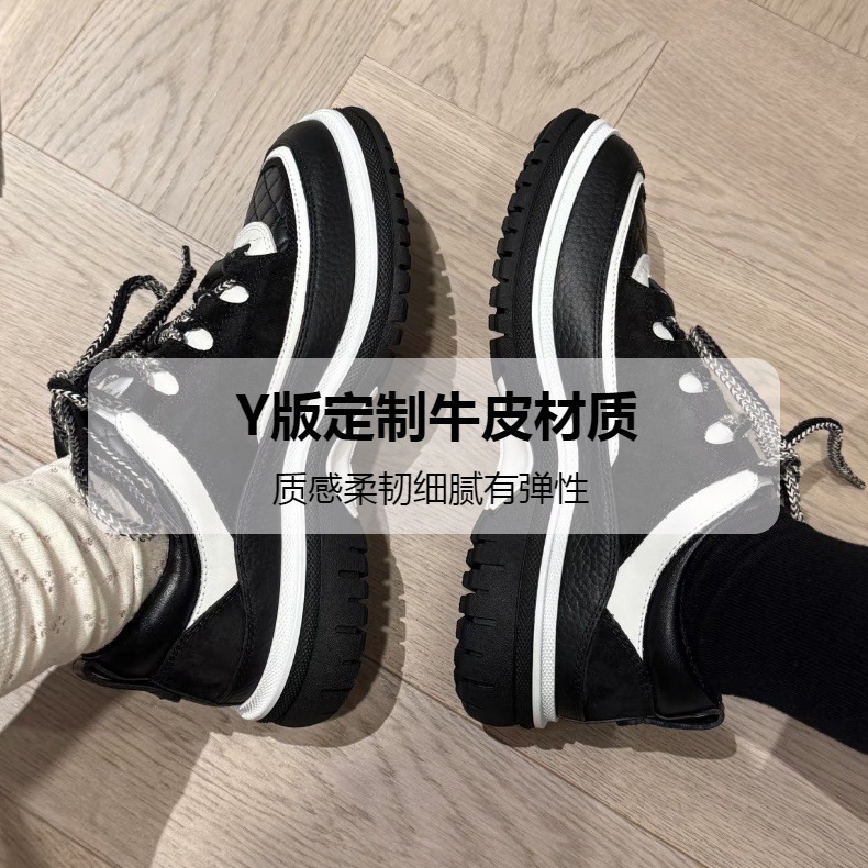 샤넬 스타일 캣워크 팬더 신발 라운드 발가락 Cowhide 컬러 매칭 Rhomboid 라인 두꺼운 하단 레이스 업 로우 탑 캐주얼 운동화 여성