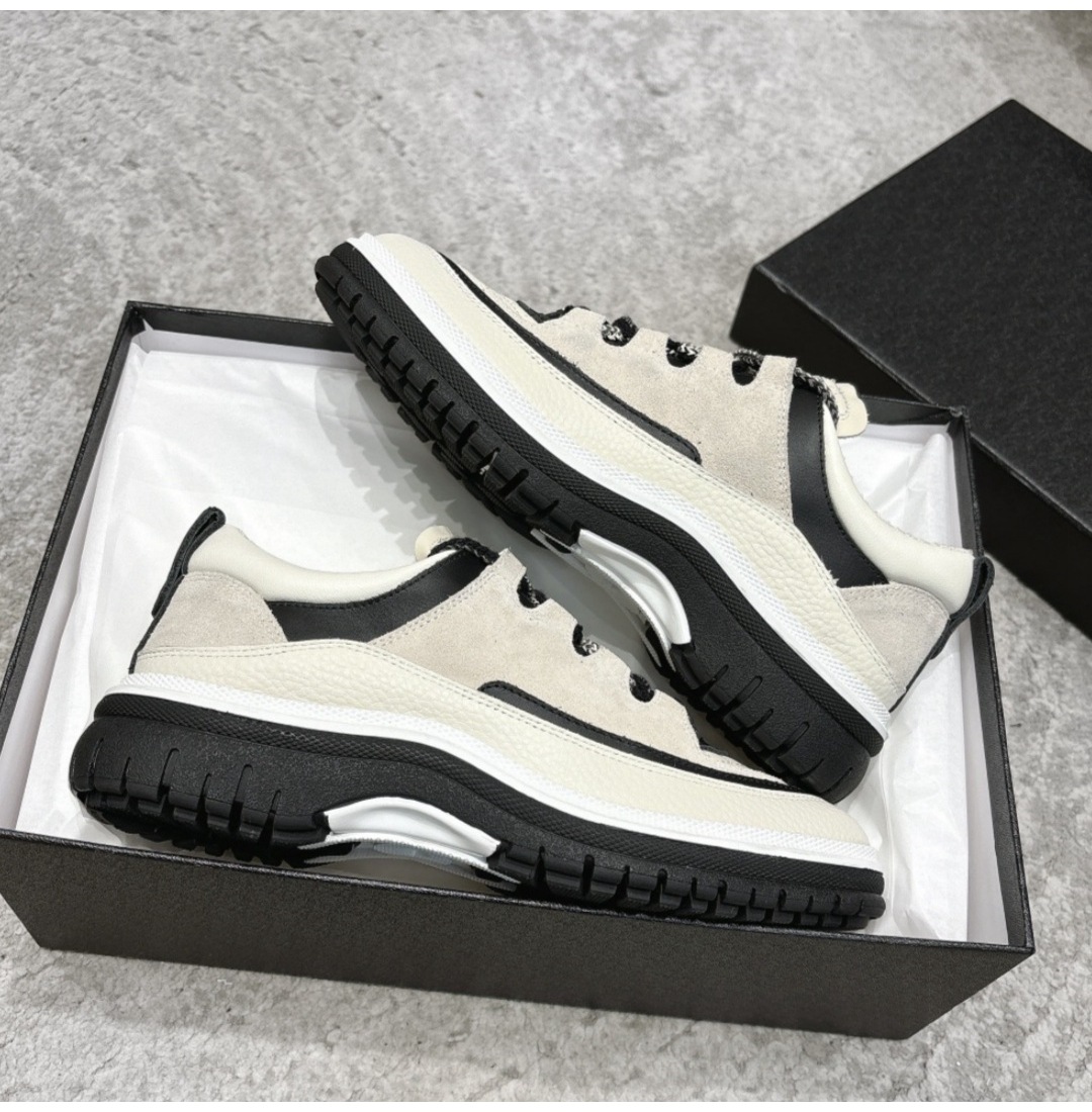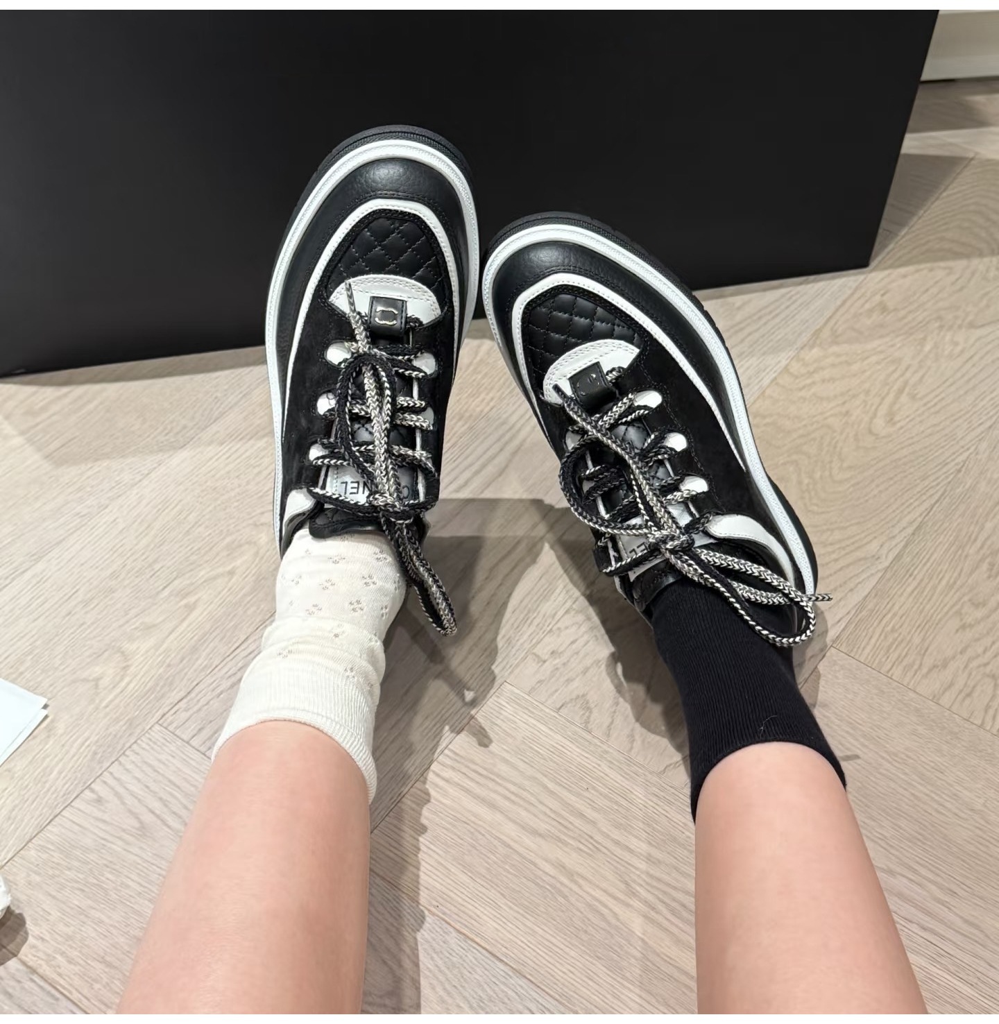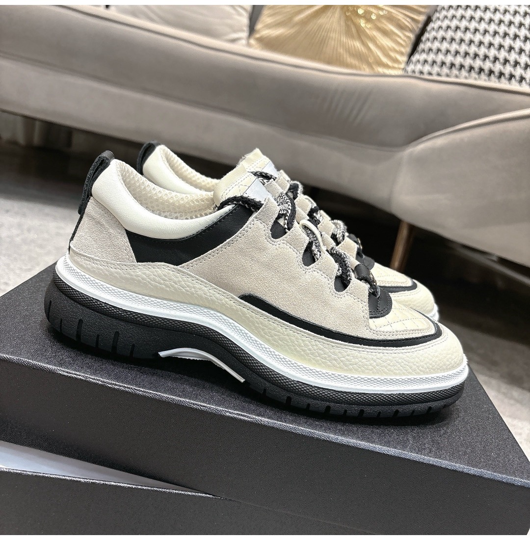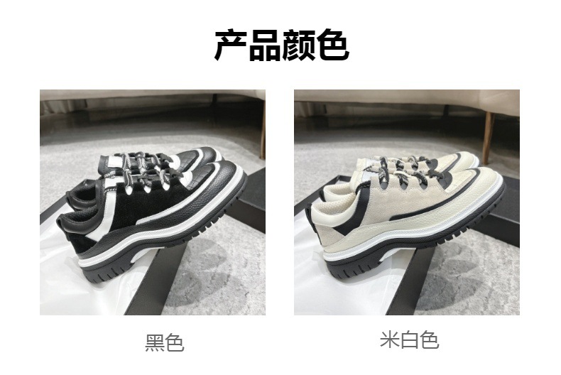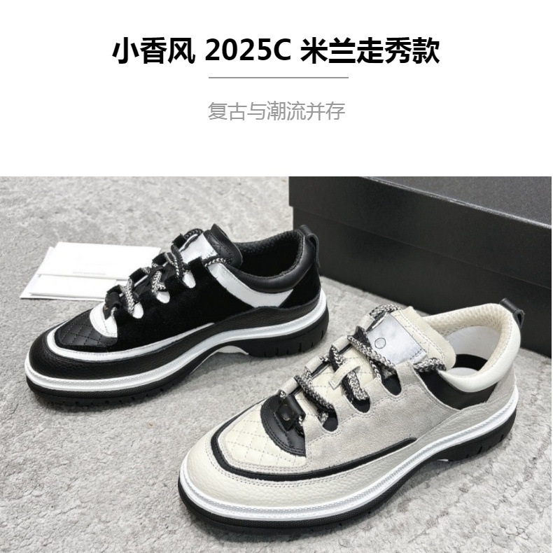샤넬 스타일 캣워크 팬더 신발 라운드 발가락 Cowhide 컬러 매칭 Rhomboid 라인 두꺼운 하단 레이스 업 로우 탑 캐주얼 운동화 여성