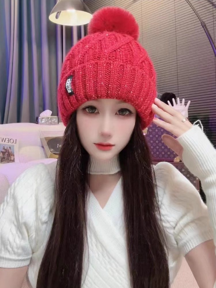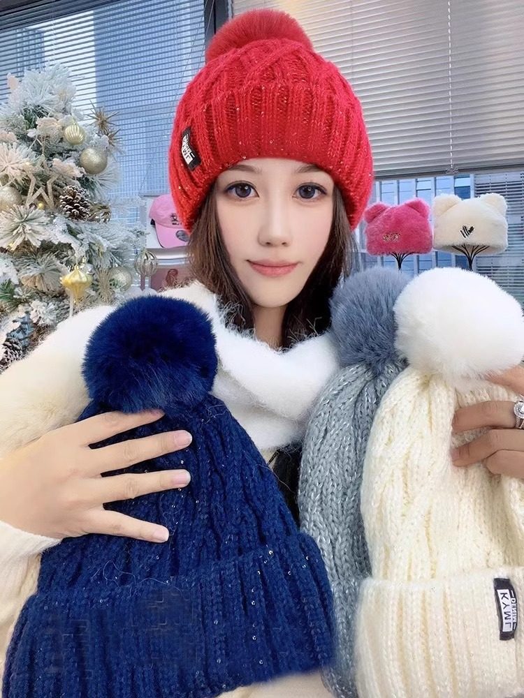 양모 모자 어린이의 가을과 겨울 새로운 Sequin 모피 공 니트 모자 기모 두꺼운 야외 사이클링 따뜻한 풀오버 모자