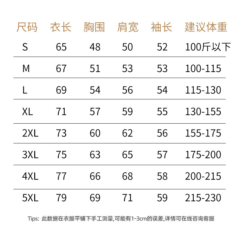 | 颜色 | 黑色, 浅米色, 藏青色, 麻灰, 花灰, 铁灰, 酒红色, 卡其定制, 白色定制, 雾霾蓝定制 | 尺码 | S码100斤以下, M码100-115斤, L码115-130斤, XL码130-155斤, XXL码155-175斤, XXXL码175-200斤, 4XL码 200-215斤, 5XL码 215-230斤 |