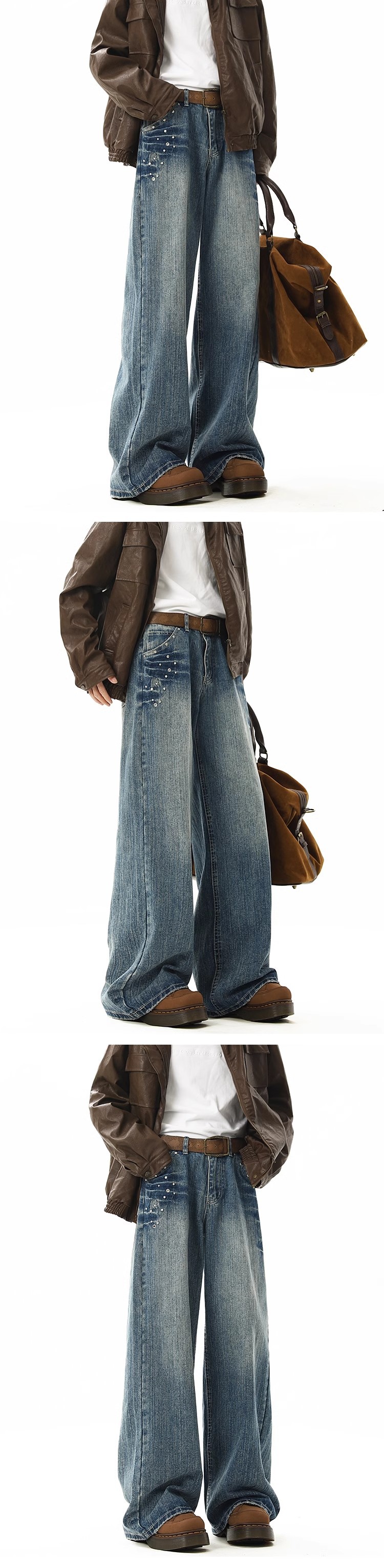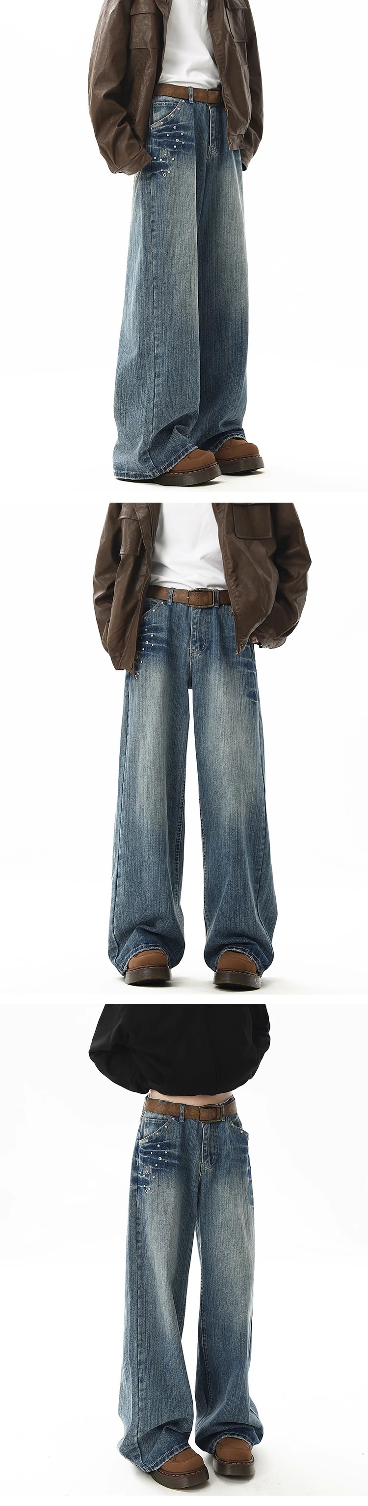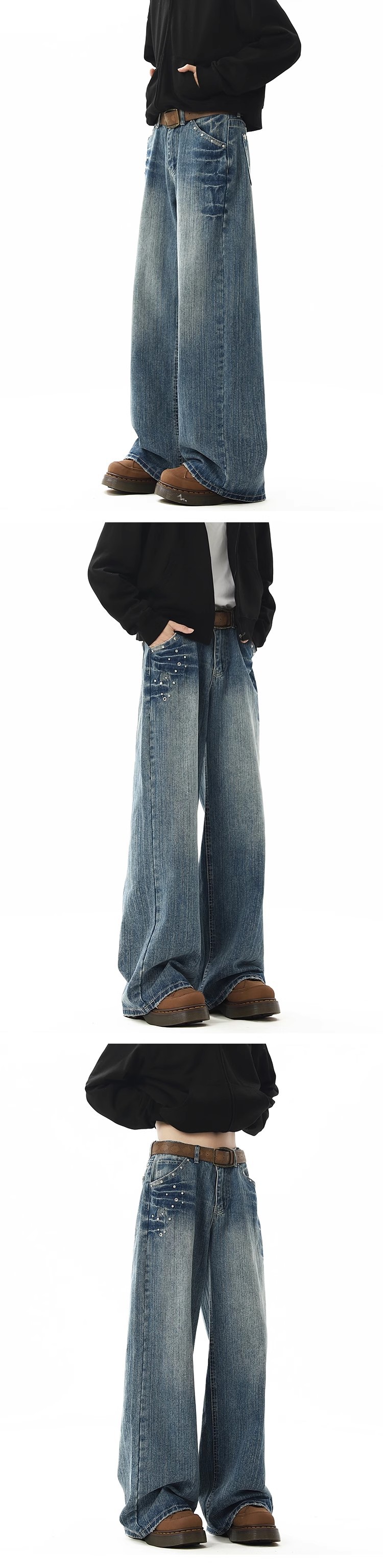슬럽 패턴 청바지 남성 가을과 겨울 미국 스타일 레트로 캐주얼 스트레이트 와이드 레그 오버 사이즈 세척 긴 바지