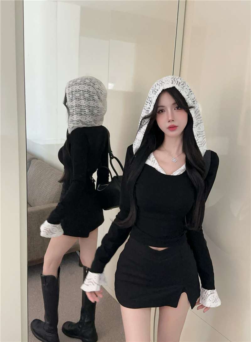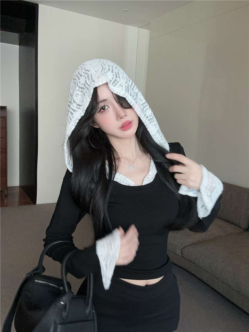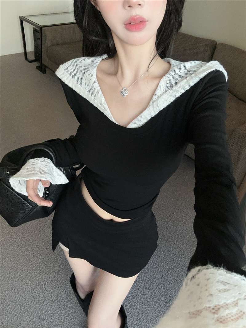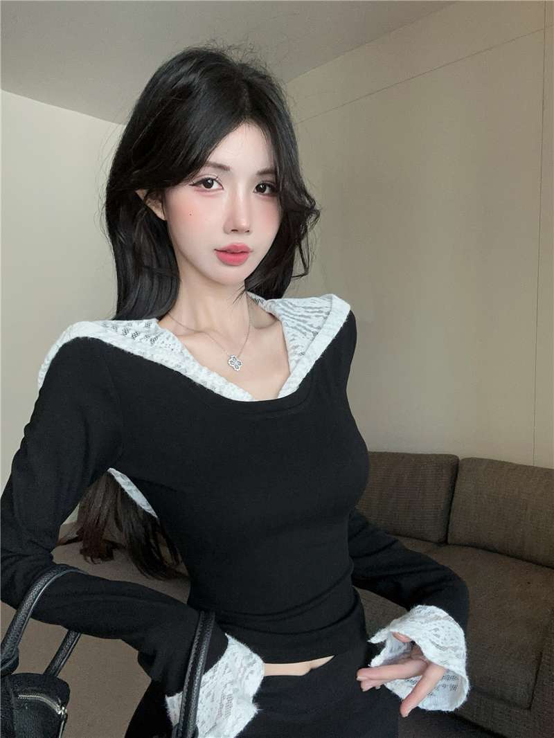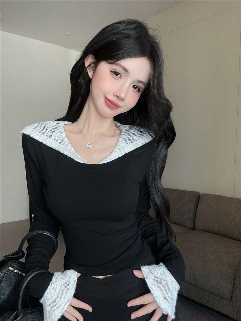 가을과 겨울 달콤한 향신료 소녀 레이스 바느질 후드 긴팔베이스 셔츠 여성 디자인 센스 틈새 슬림 핏 아름다운 탑