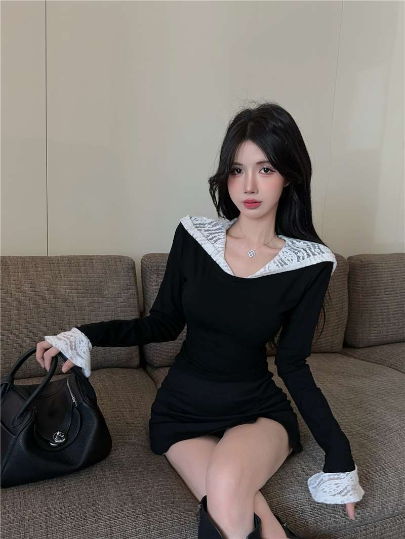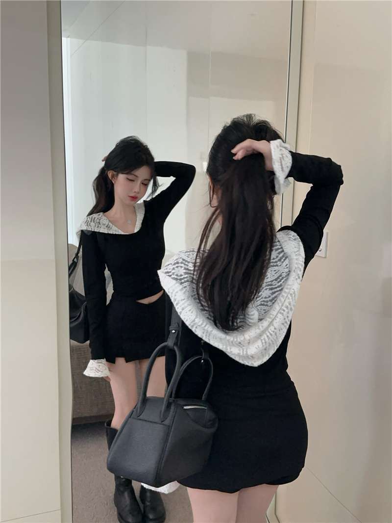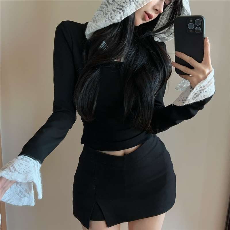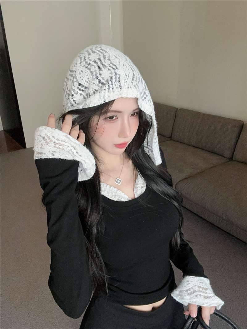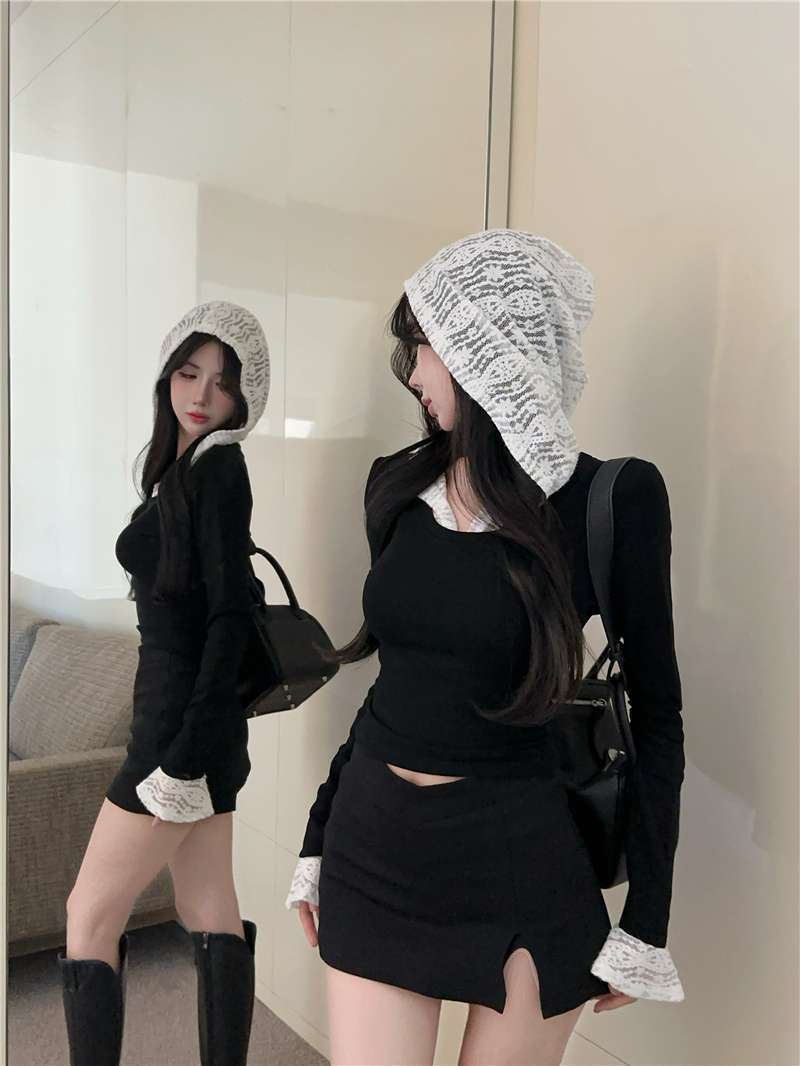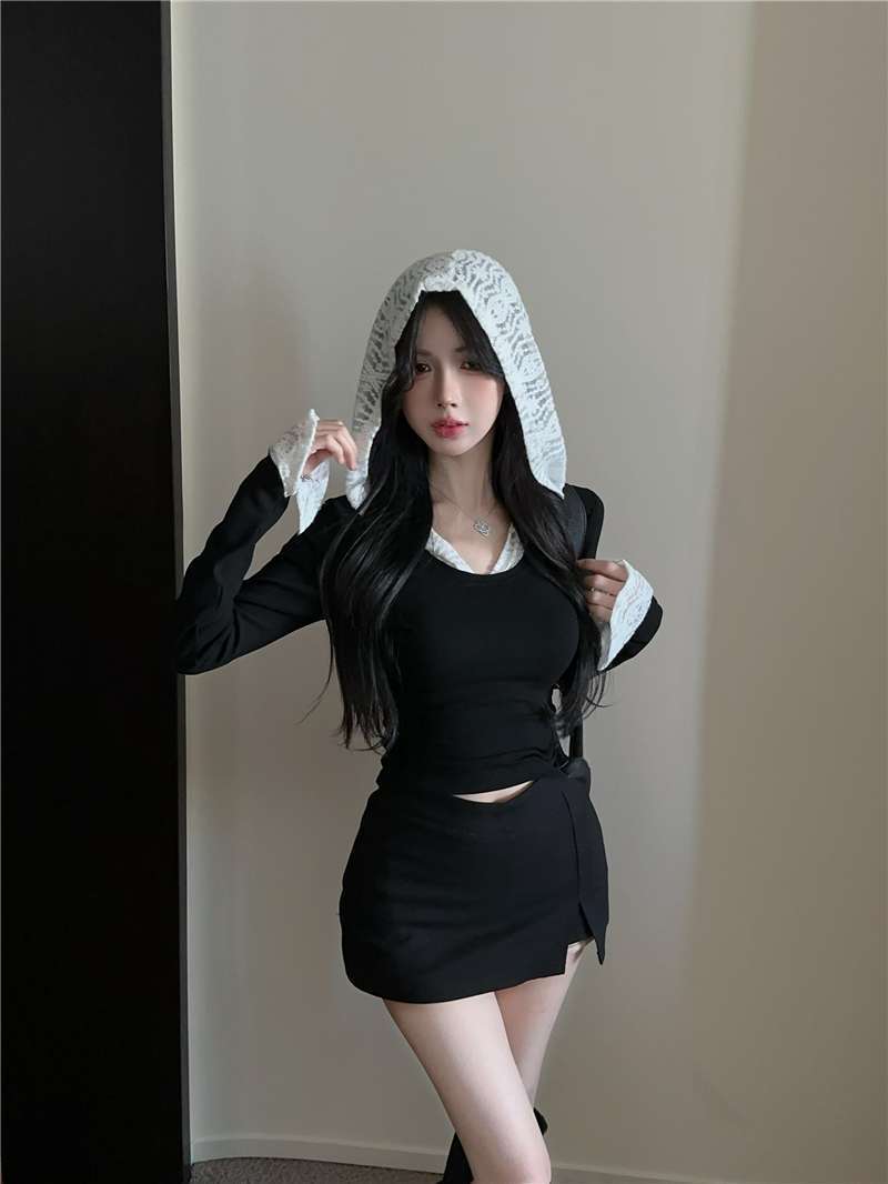 가을과 겨울 달콤한 향신료 소녀 레이스 바느질 후드 긴팔베이스 셔츠 여성 디자인 센스 틈새 슬림 핏 아름다운 탑