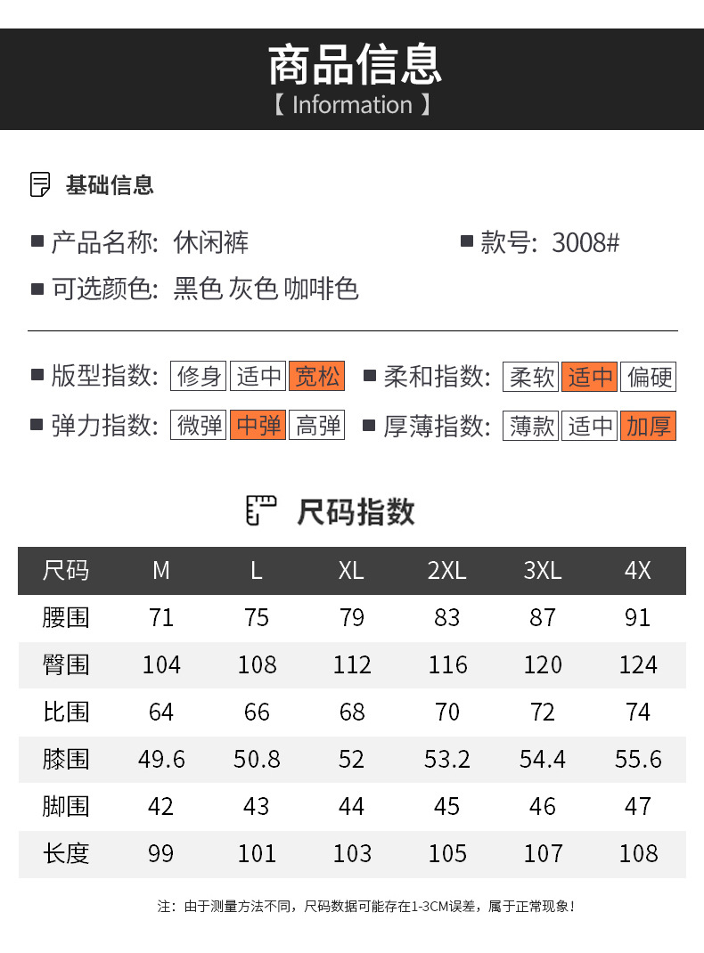 | 颜色 | RQ8-3008黑色加绒款, RQ8-3008灰色加绒款, RQ8-3008C卡其加绒款 | 尺码 | M, L, XL, 2XL, 3XL, 4XL |