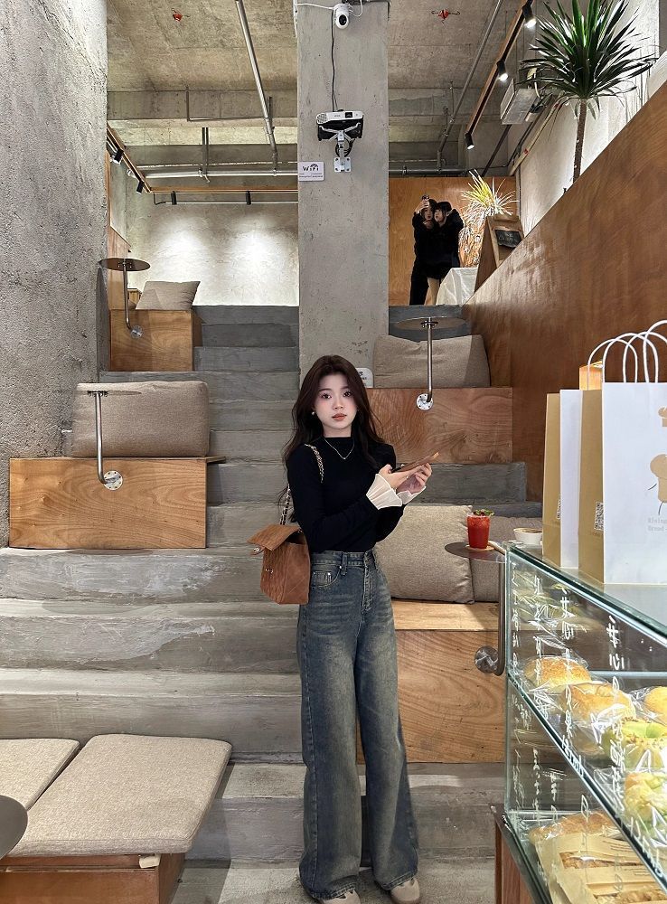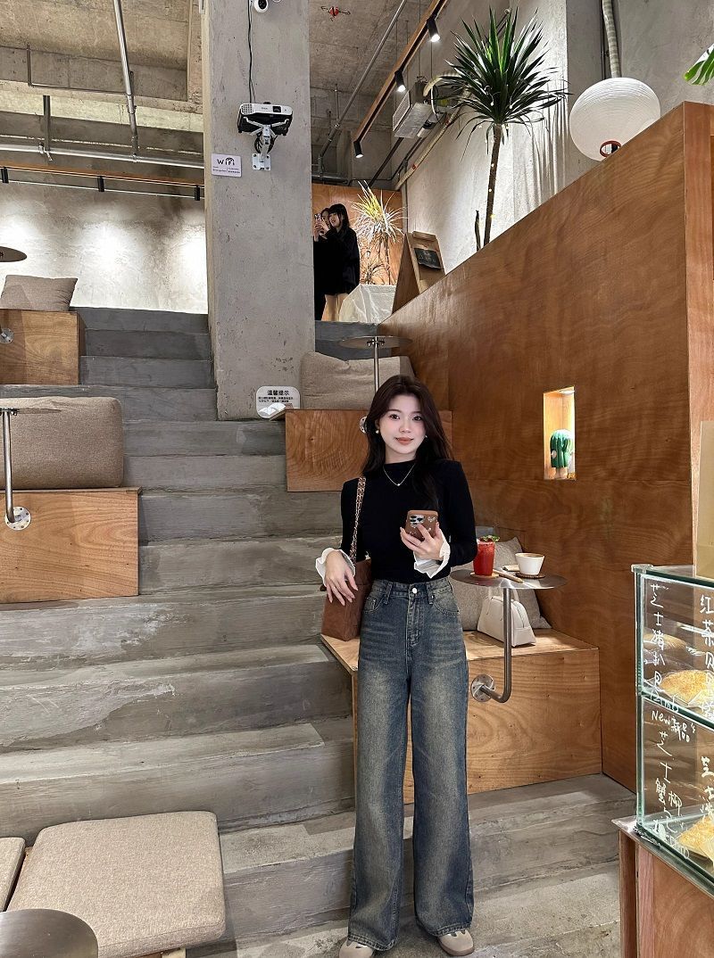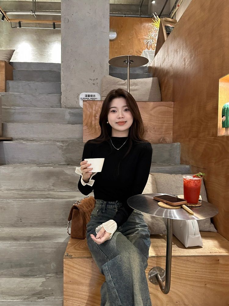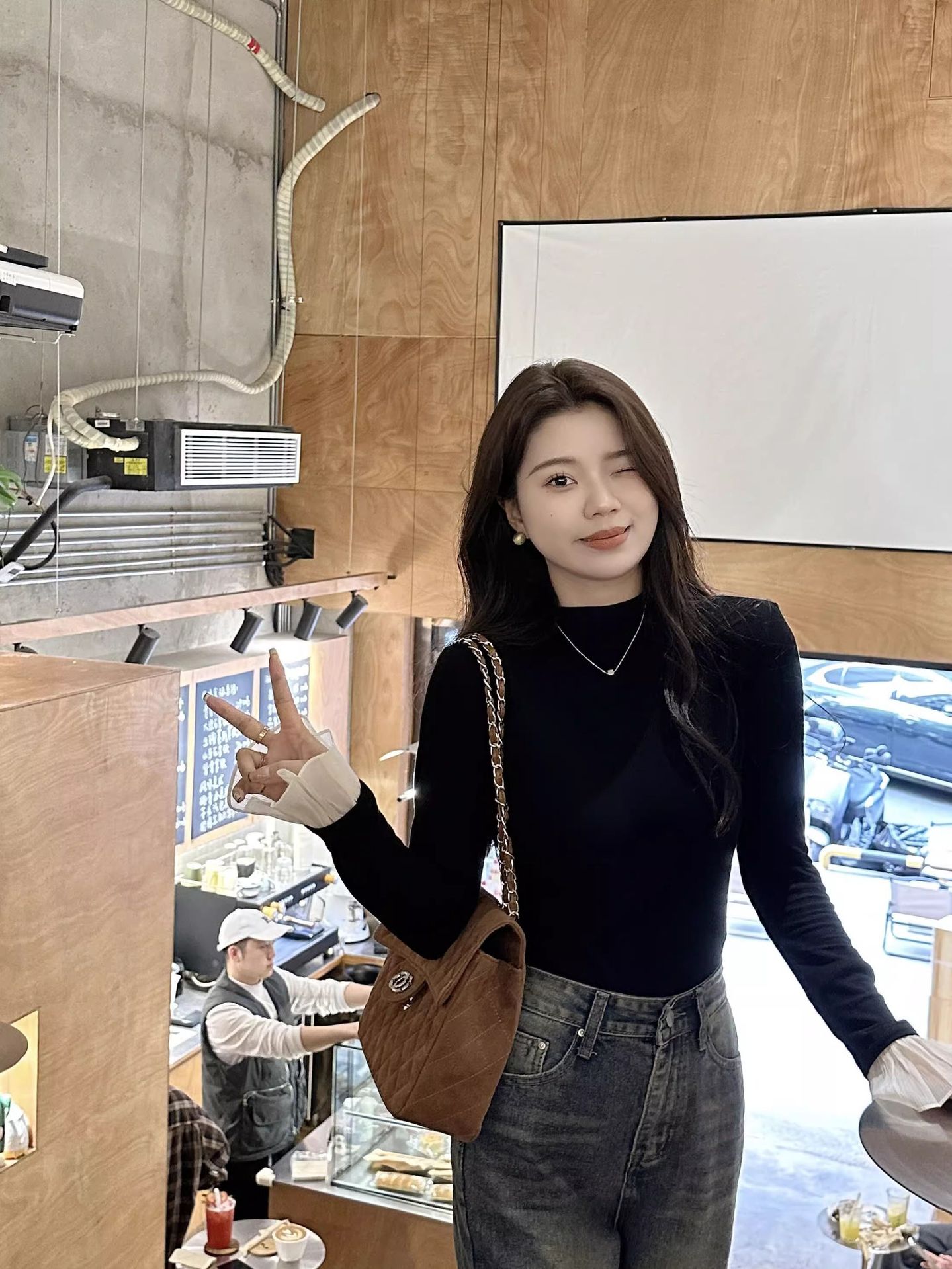 검은 반 높이 칼라베이스 셔츠 여성의 가을과 겨울 기모 대조 컬러 순수한 욕망 디자인 센스 뿔 슬리브 러플 내부 탑