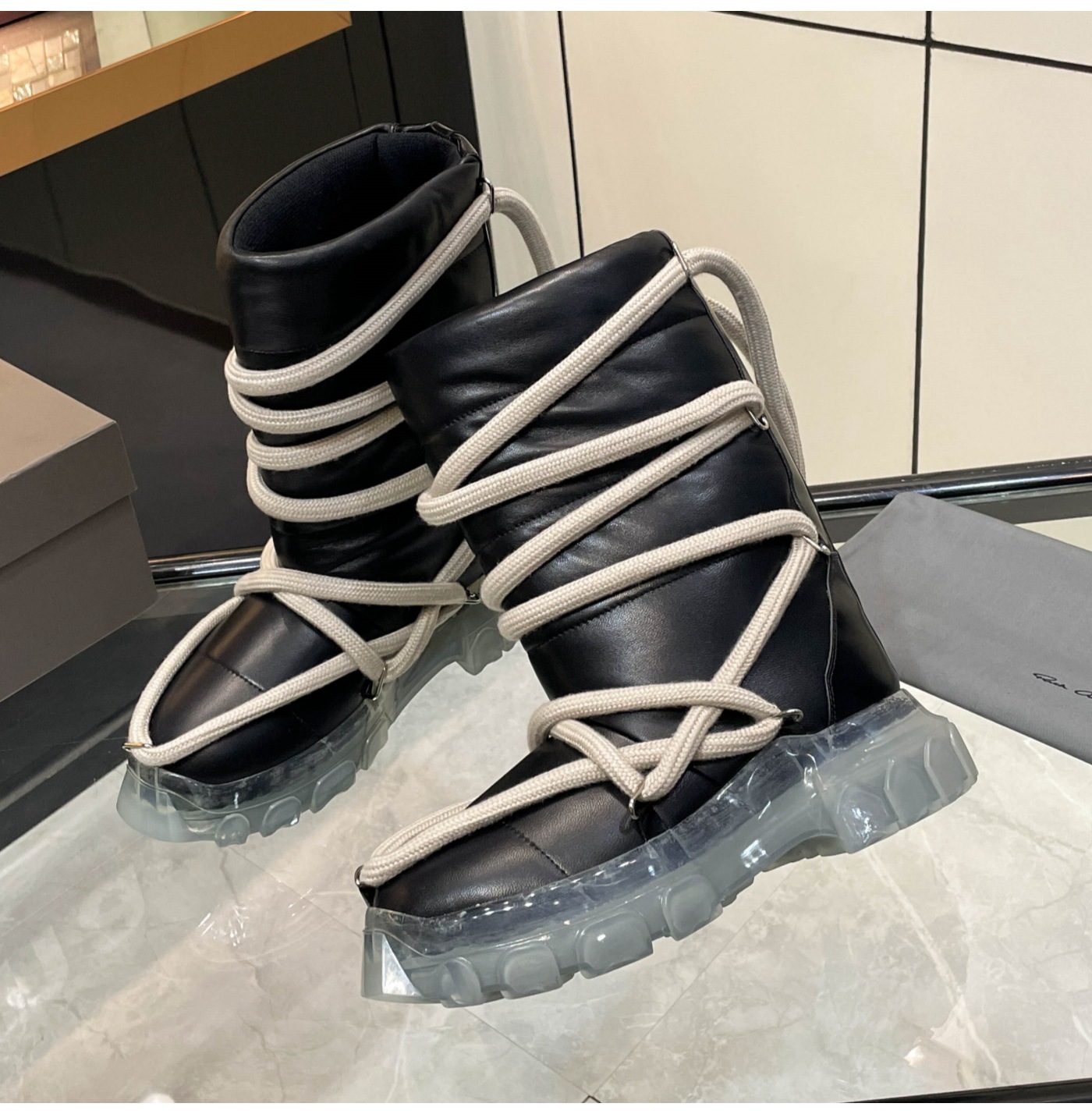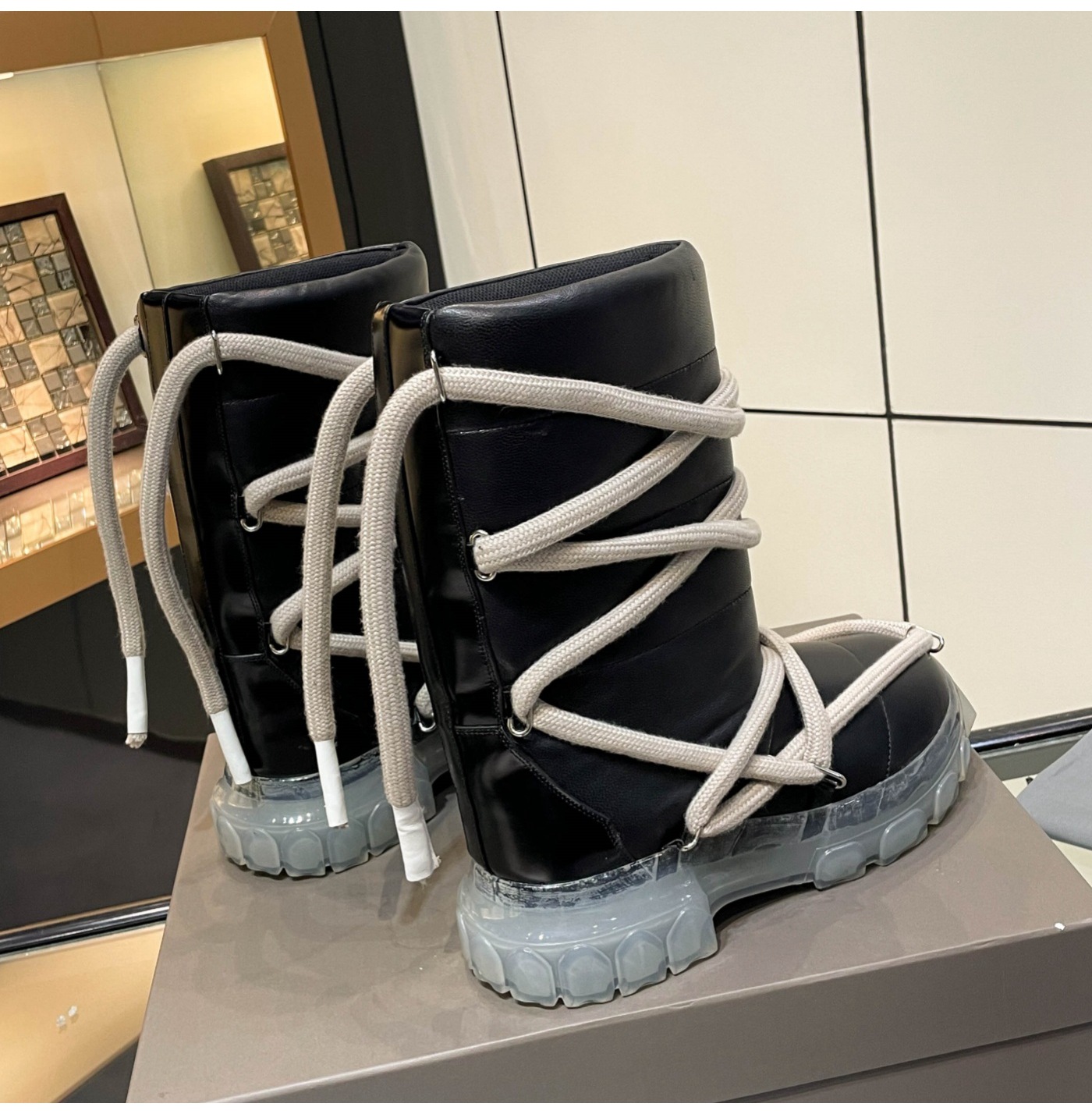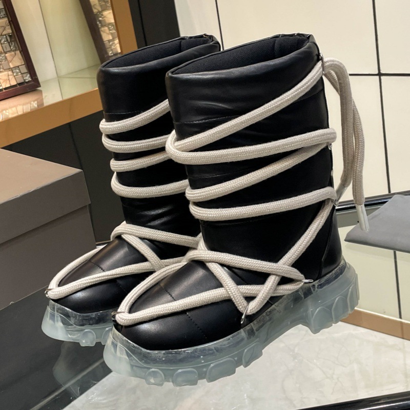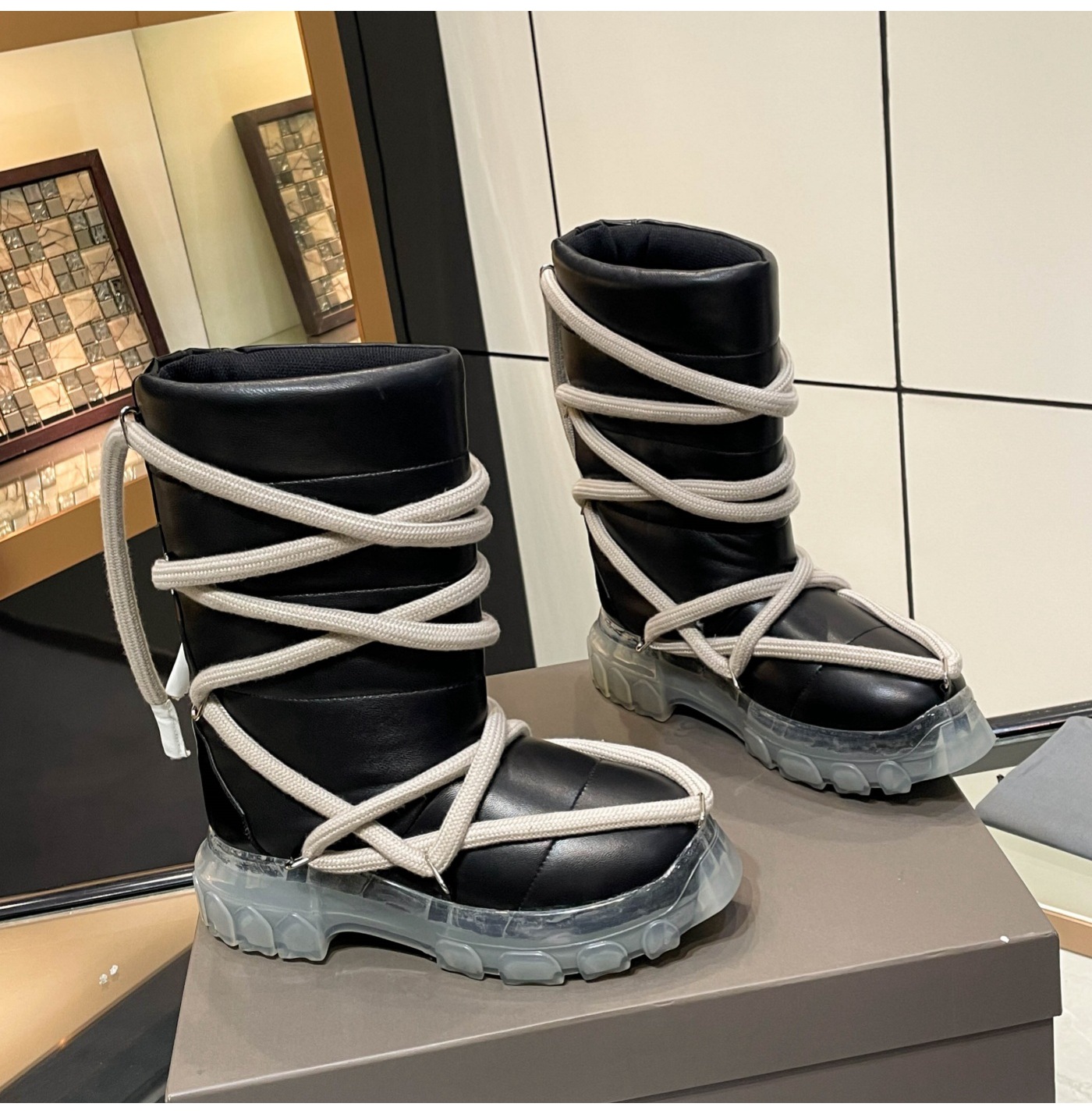 KUNG R 하이 세트 O 커플의 크레이지 스트랩 스노우 부츠 라운드 발가락 양가죽 크리스탈 하단 문어 부츠 미드 부츠